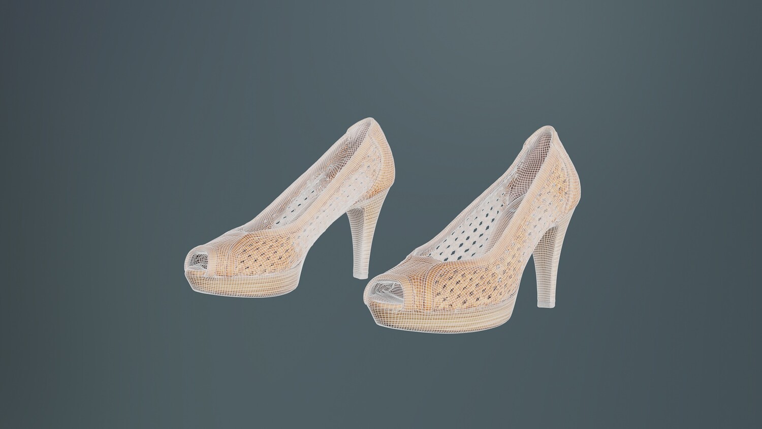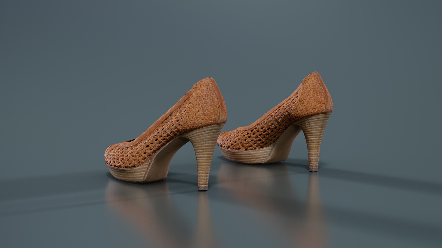 3D scanned model featuring a pair of women's brown leather pumps. This model, brown weave pumps, has been created using photogrammetry from a real world object. The raw scan data has been cleaned, retopologized and UV-unwrapped using Zbrush. The result is a low poly mesh with baked maps. The .obj and .mtl are configured so that maps will load automatically in the shader (tested in Blender). In addition, a Blender scene is provided with the model and shader already set up for rendering and export. Detailed information below: