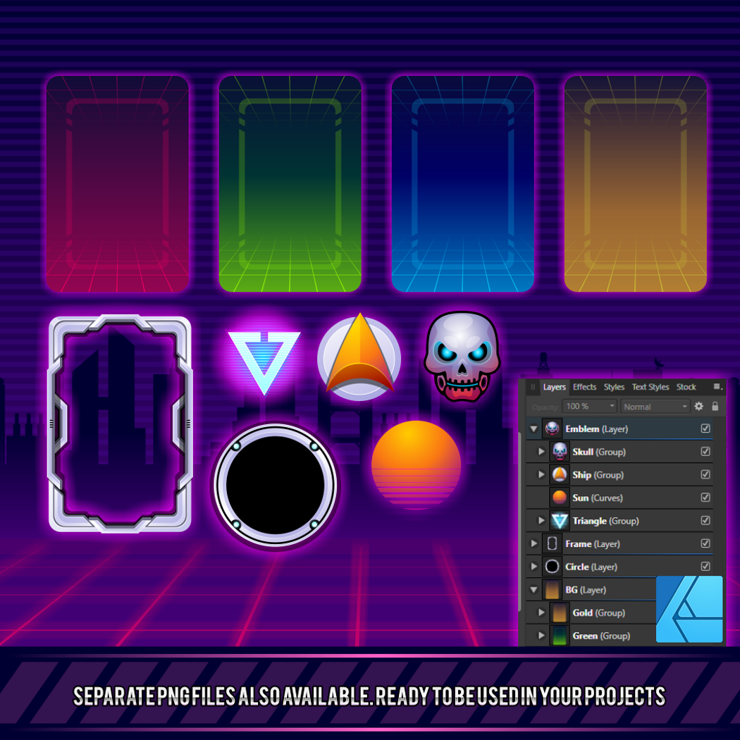 Features: - 4 color variations for card face & card-back - 4 rarity color variations - 4 Card-back emblem variations - Layered parts in Adobe Illustrator and Affinity Designer file for easy customization - Exported individual parts in PNG files also available