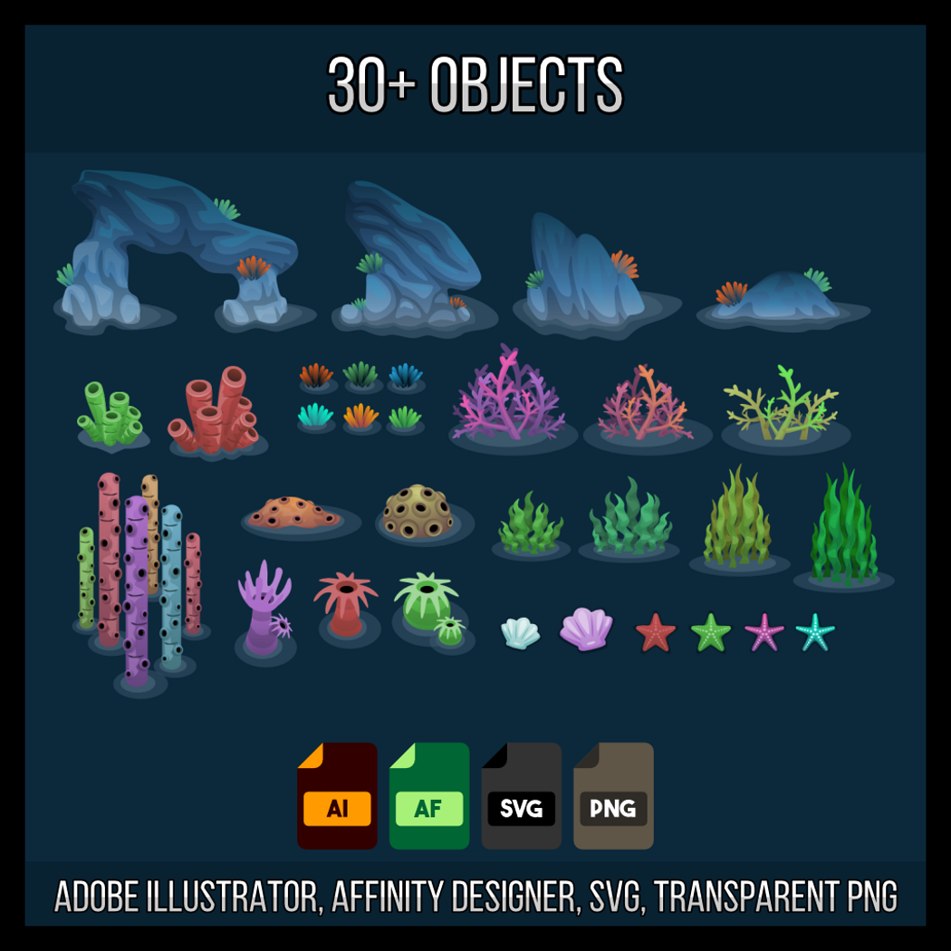 From coral paths and seabed floors to immersive decorative elements, every tile is crafted to read cleanly in a top-down camera while still feeling organic and alive. The assets are vector-based at their core, making them flexible, future-proof, and ideal for both indie and professional workflows. Features - 60+ seamless environment tiles for underwater floors, paths, and terrain - 30+ decorative objects including corals, rocks, plants, and seabed details - 256px tile size (PNG) – crisp visuals, ideal for modern 2D games - Top-down perspective optimized for RPG, roguelike, and strategy maps - Consistent visual style for easy mixing and fast level building - Vector-source friendly – scalable and editable without quality loss - File formats: PNG (256px tiles), SVG, Adobe Illustrator, Affinity Designer