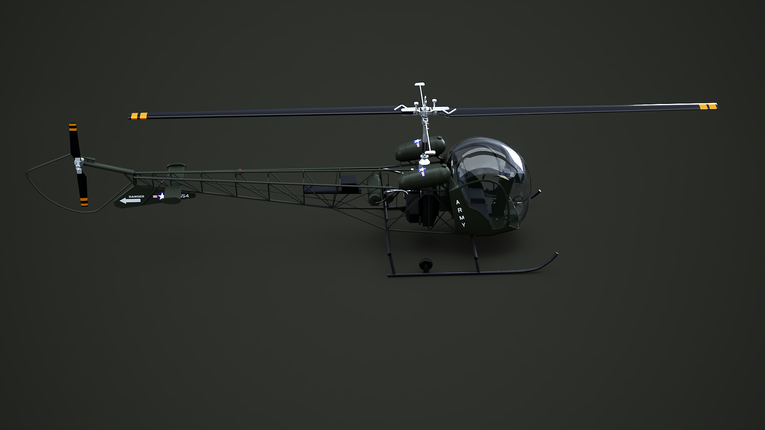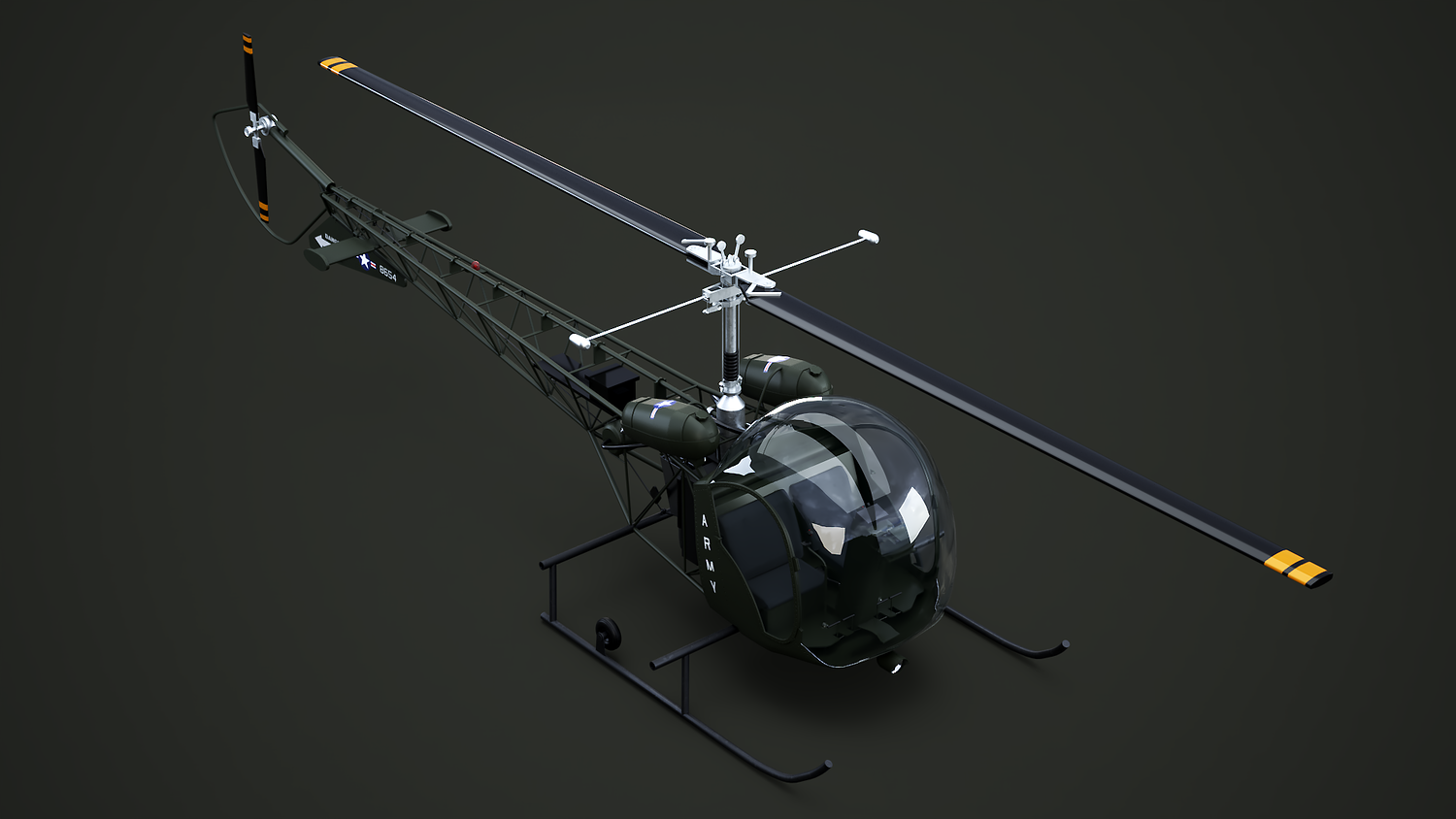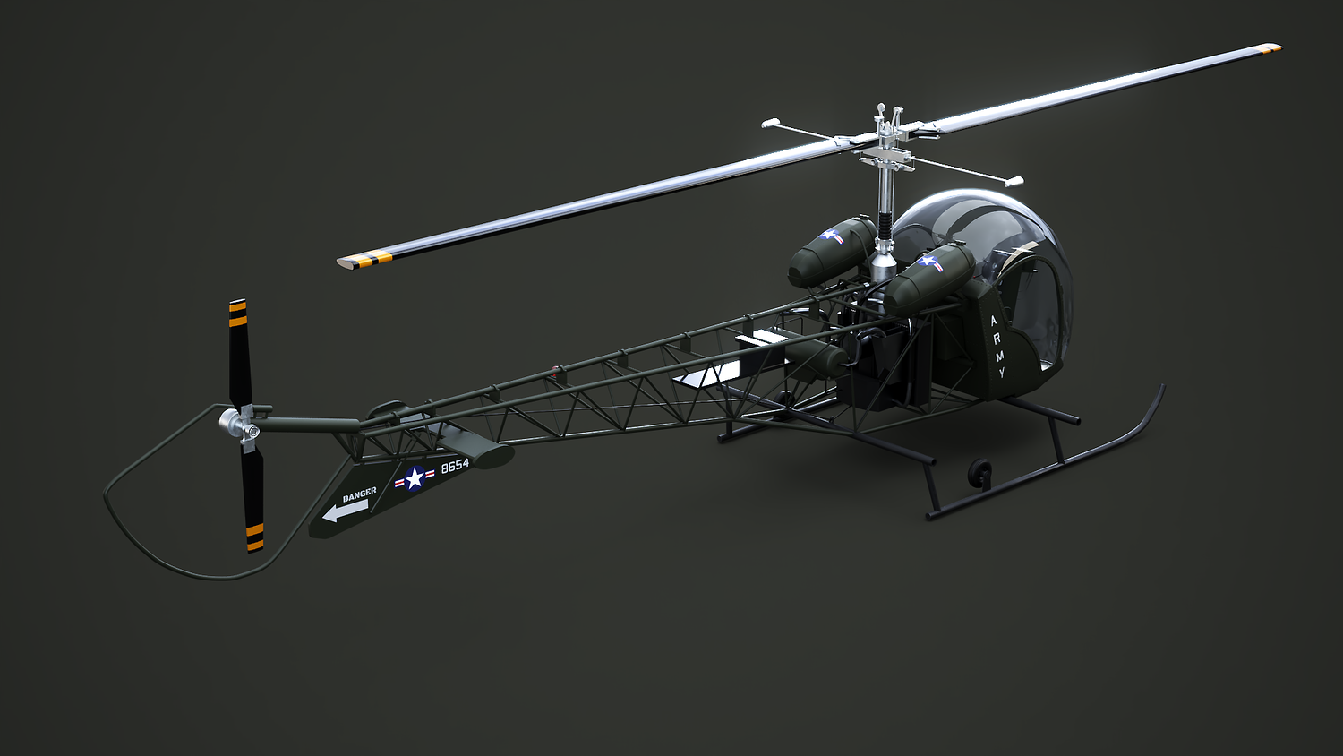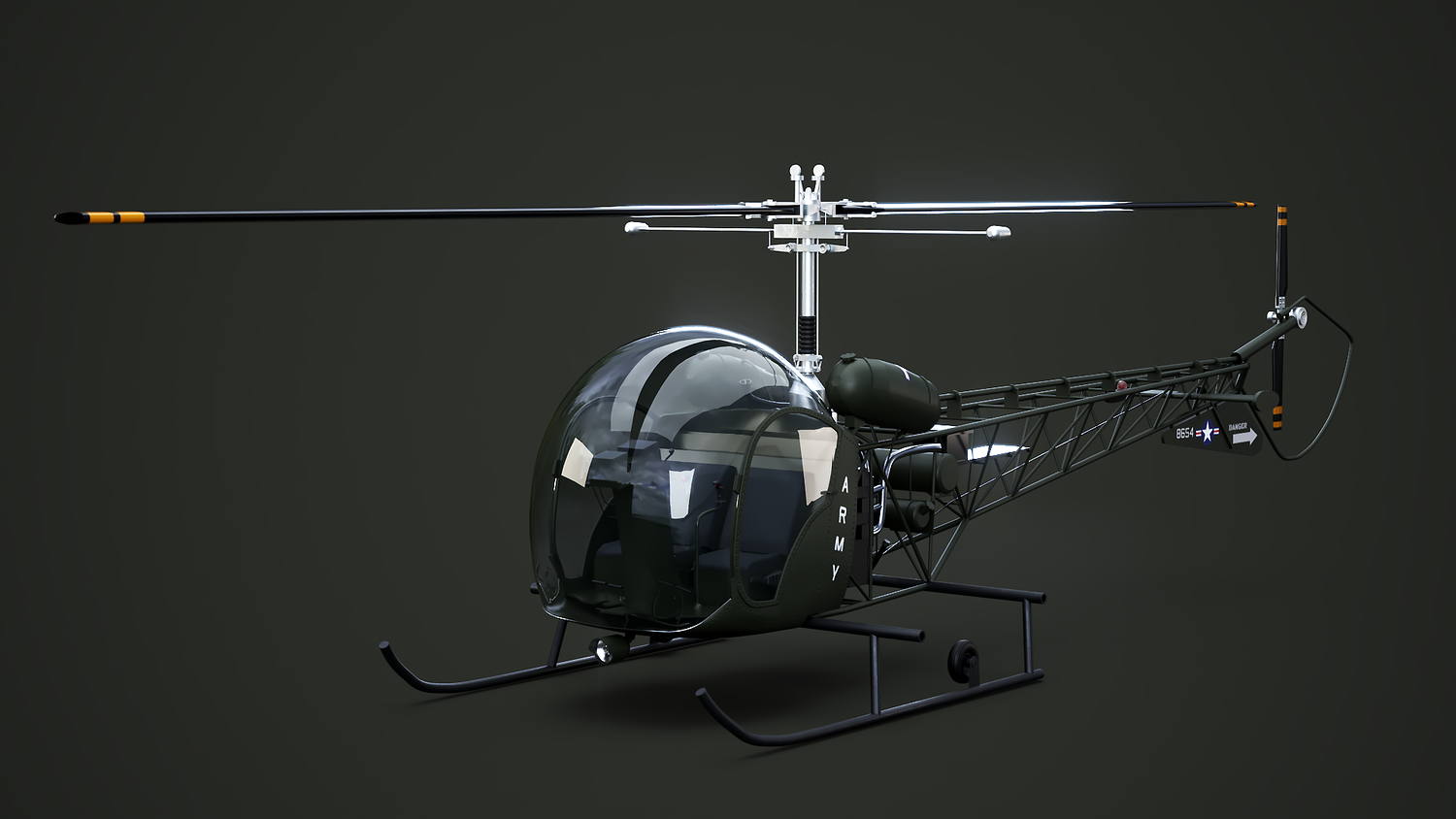 Detailed Bell 47/H-13 Light military light helicopter 3D model with full PBR textures, accurate frame construction, realistic cockpit, and clean topology.