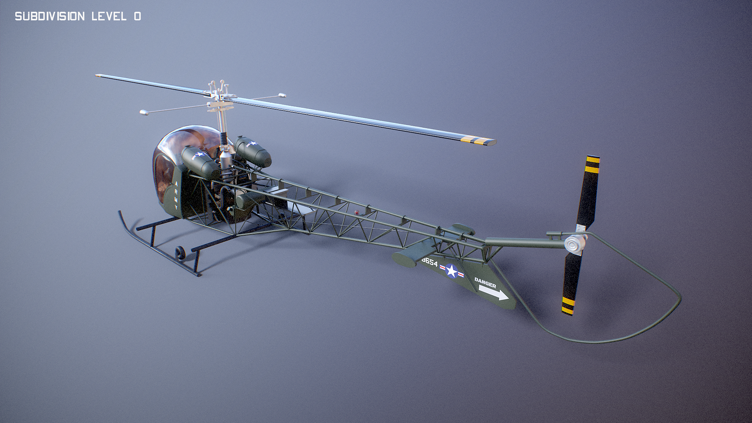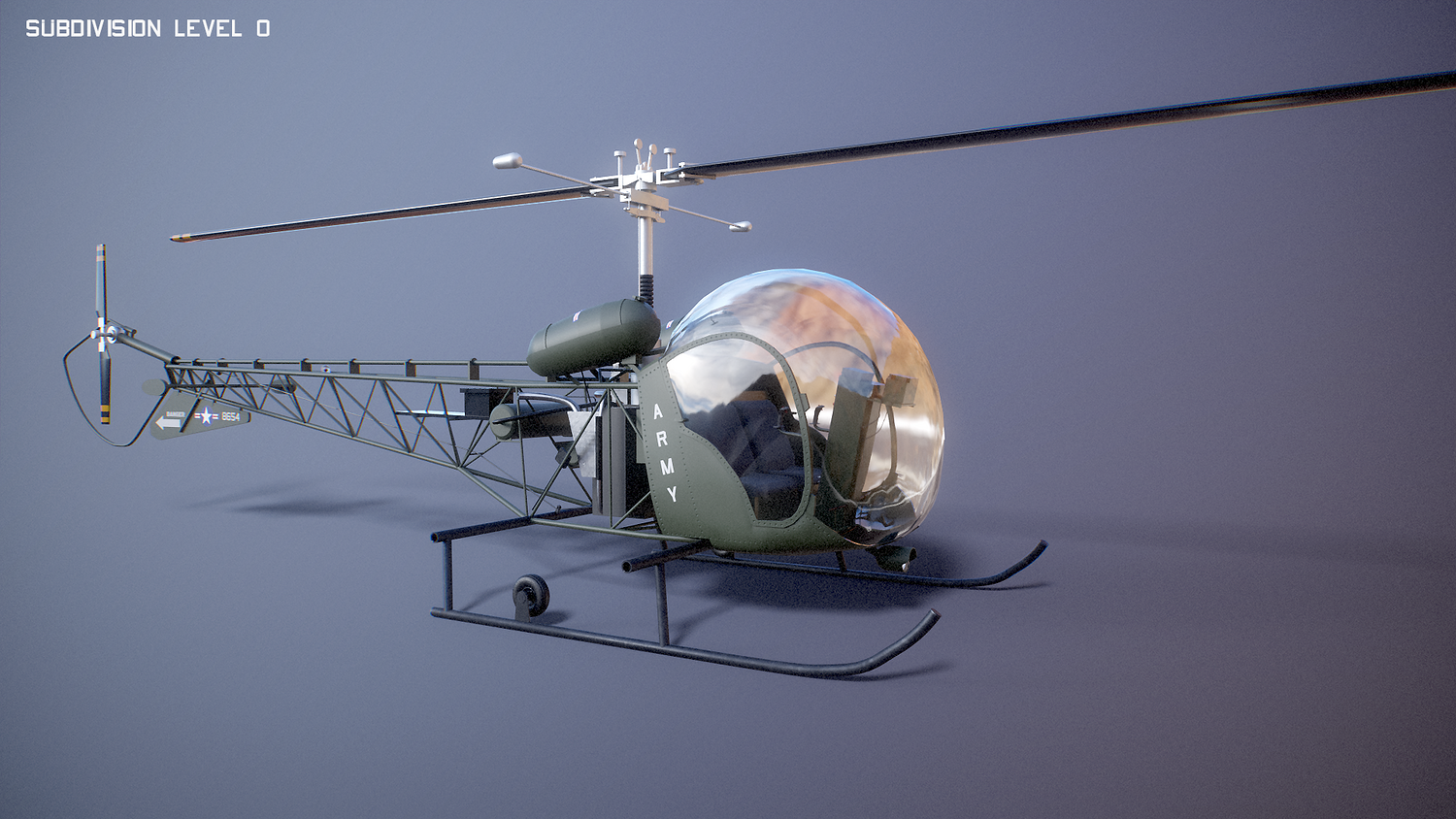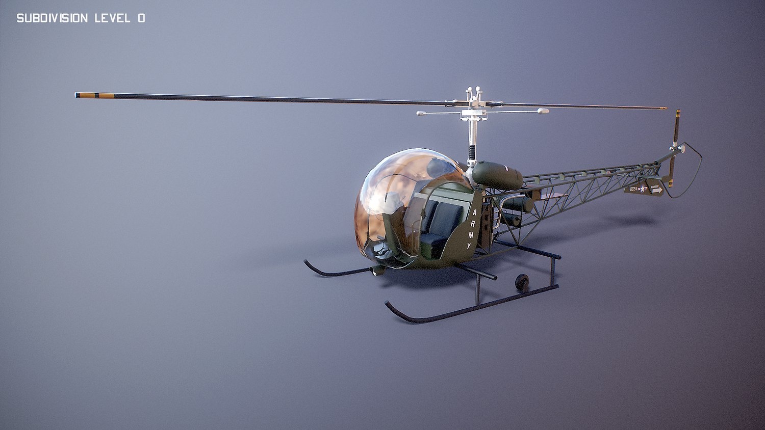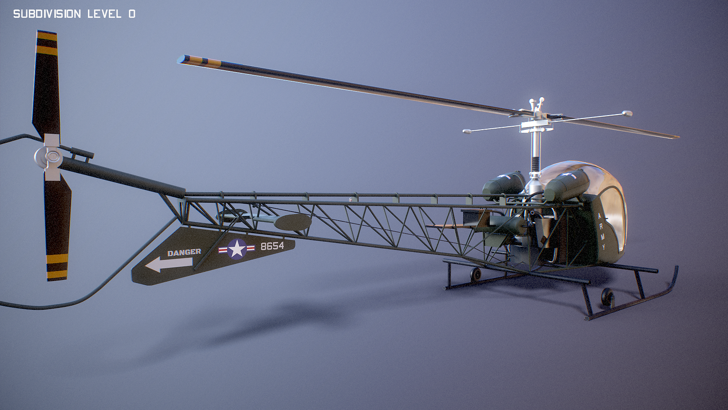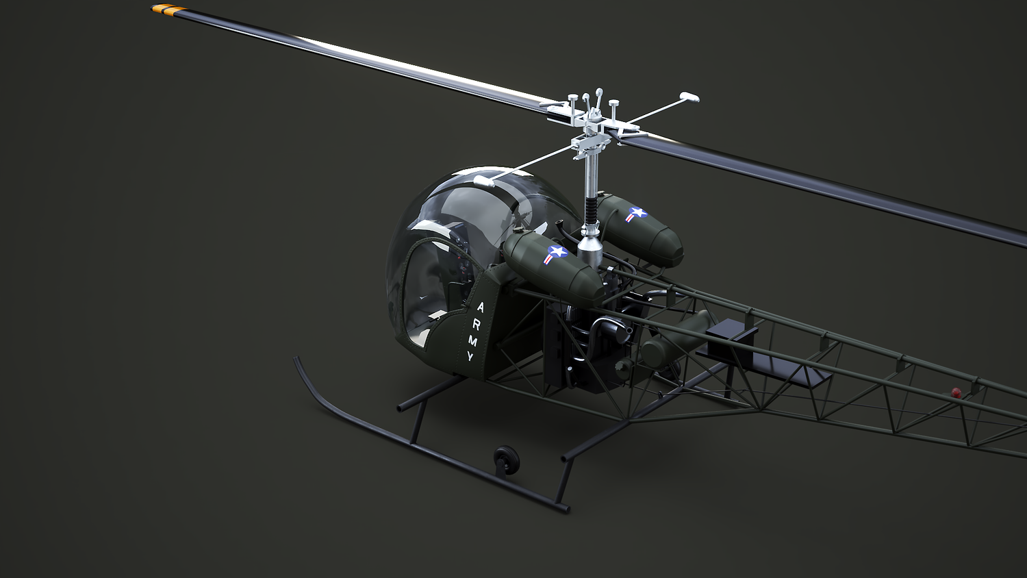 Detailed Bell 47/H-13 Light military light helicopter 3D model with full PBR textures, accurate frame construction, realistic cockpit, and clean topology.