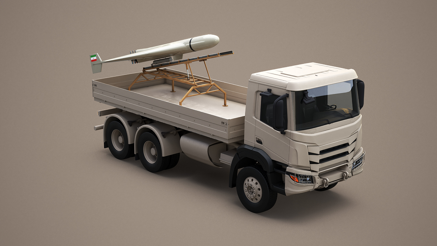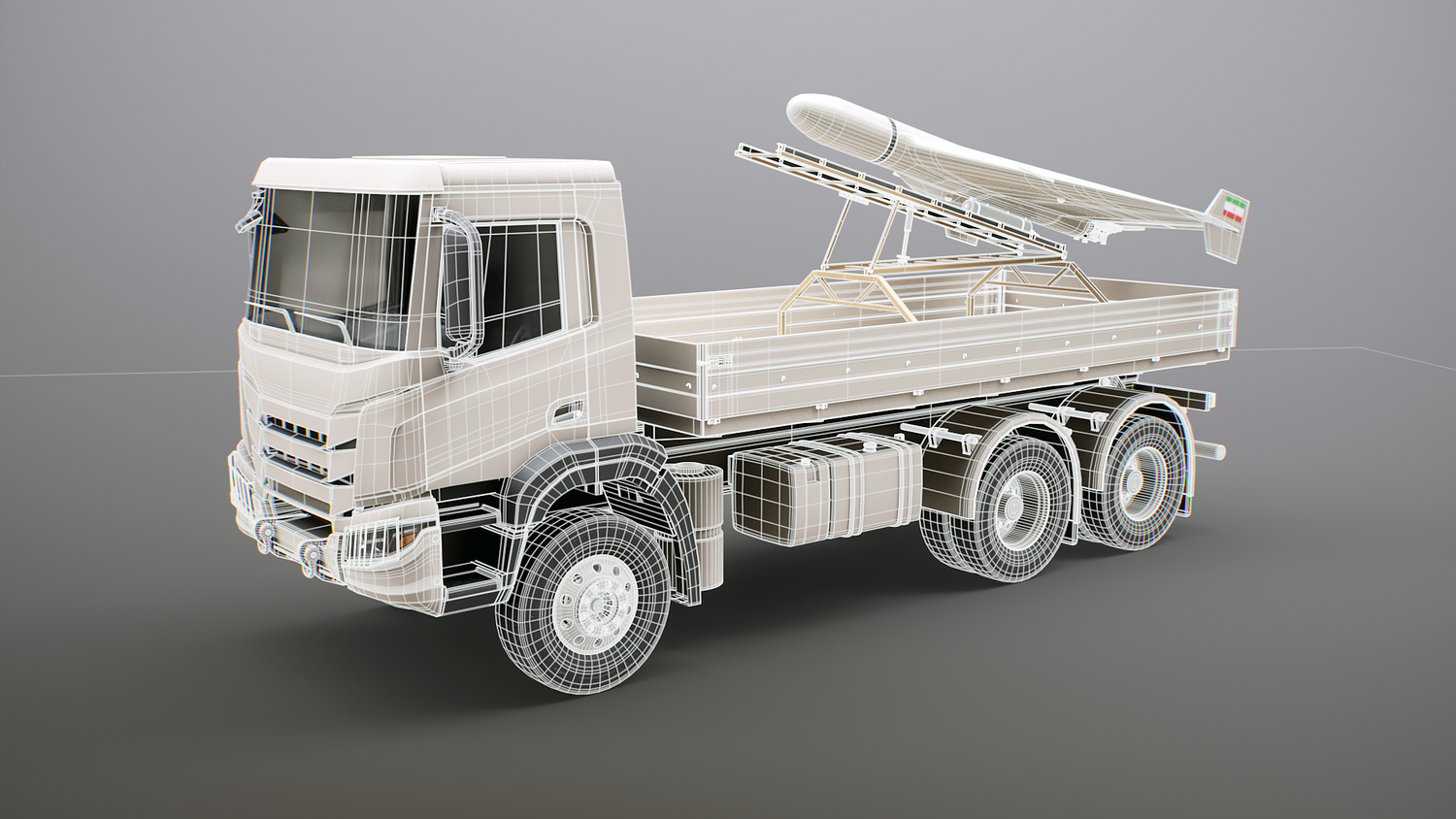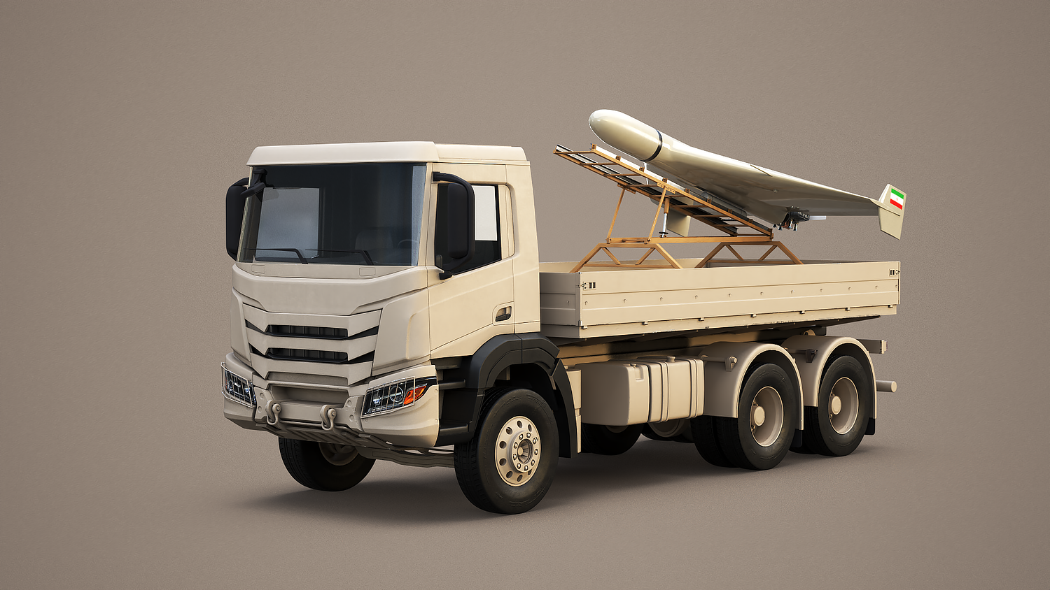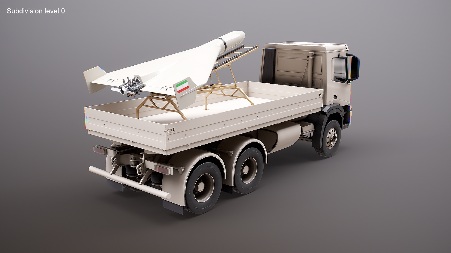 This highly detailed 3D model represents a military transport truck equipped with a Geran-2 (Shahed-136) drone launcher system.