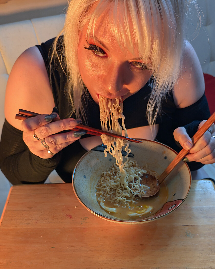 Photo reference Queen Riot poses in a series of photos enjoying a delicious bowl of ramen to be used as drawing reference. This digital picture pack contains 60 4K resolution images meant for practicing drawing or for character concept art.