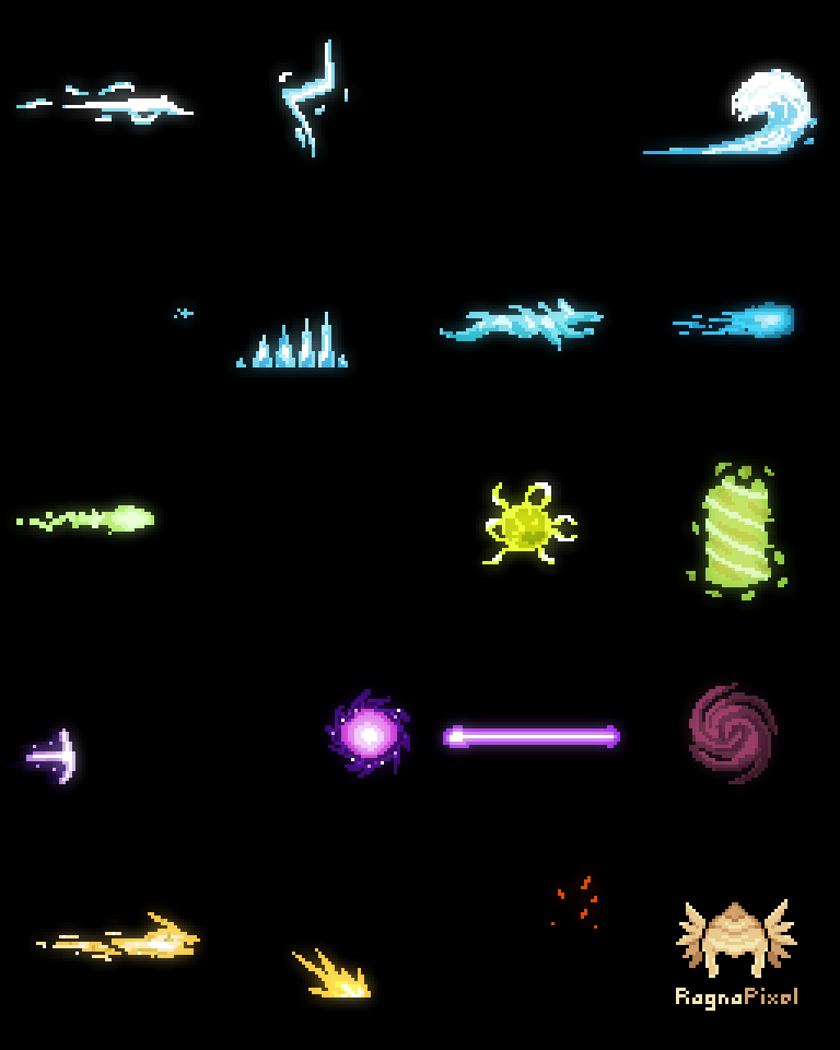 INCLUDES: • Arcane Rift • Black Hole • Blue Flame • Blue Orb • Dark Orb + Explosion • Fire Hit • Green Energy Ball • Green Thunder • Ice Lance • Icy Spykes • Laser • Poison Smoke • Sand Ball • Spark • Thunder Strike 1 (vertical) • Thunder Strike 2 (horizontal) • Venom Pillar • Water Dragon • Wave