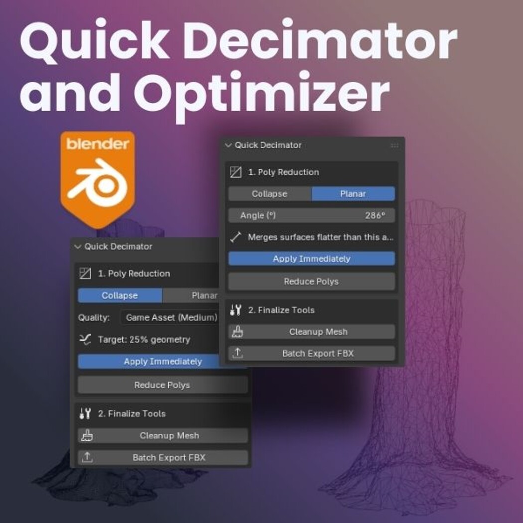 Quick Decimator + Optimizer 🚀 A complete, all-in-one Blender addon that handles poly reduction, final mesh cleanup, and batch export to drastically speed up your game development, AR/VR, and WebGL asset pipeline.