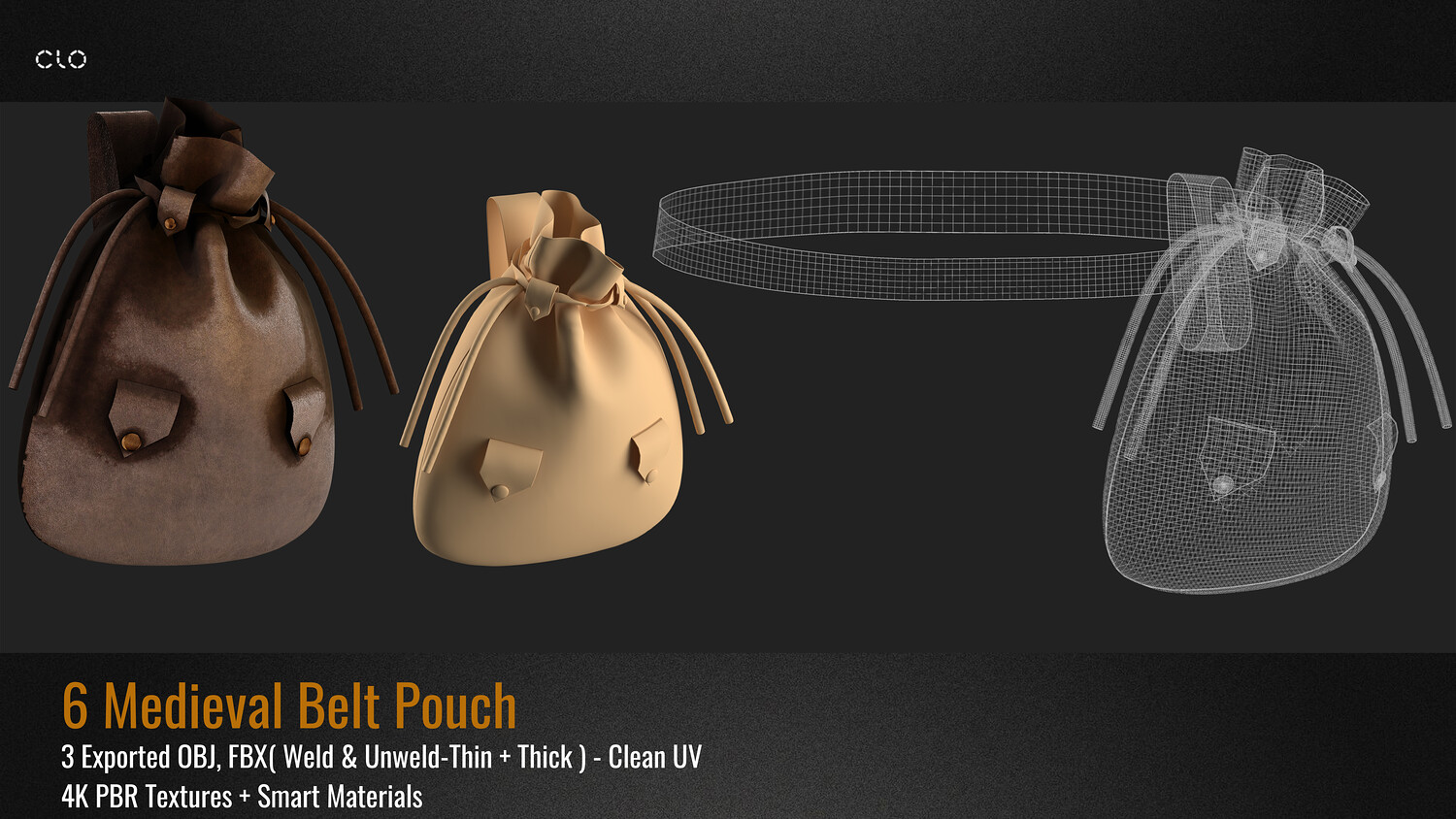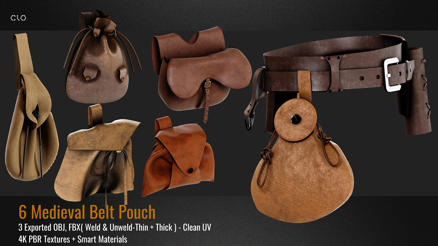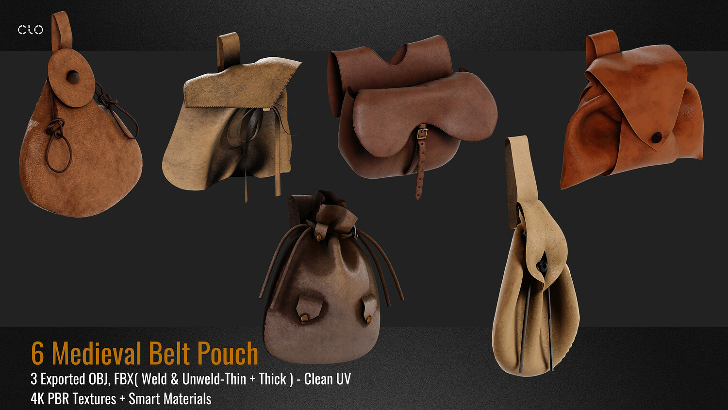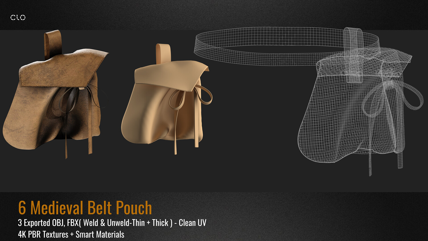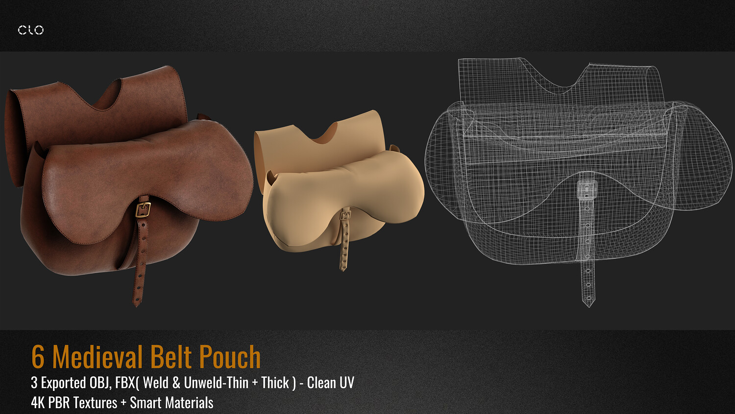 6 Medieval Belt Pouch . Marvelous Designer/Clo3D file+OBJ,FBX+4K Textures(PBR+Smart Material)