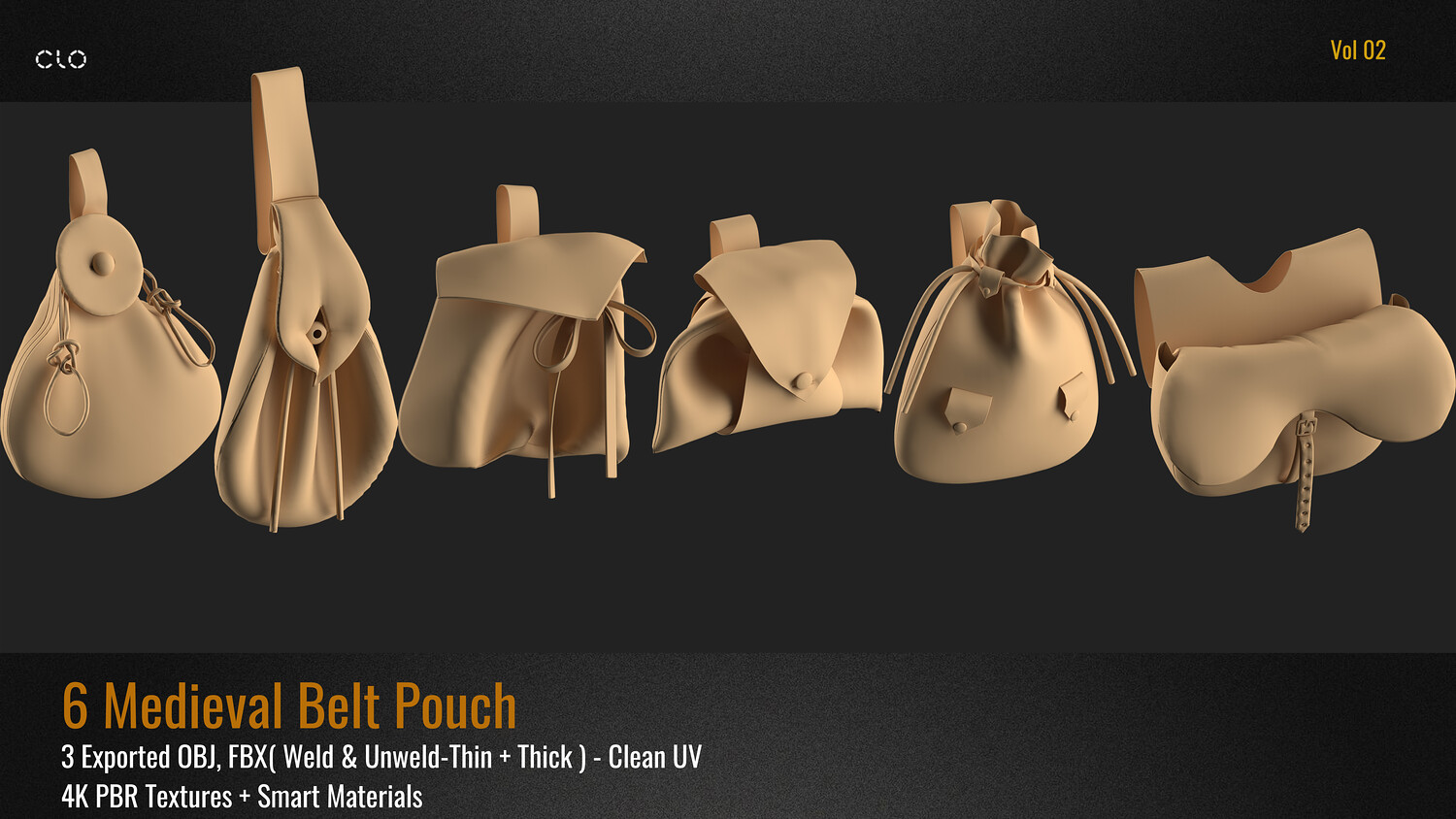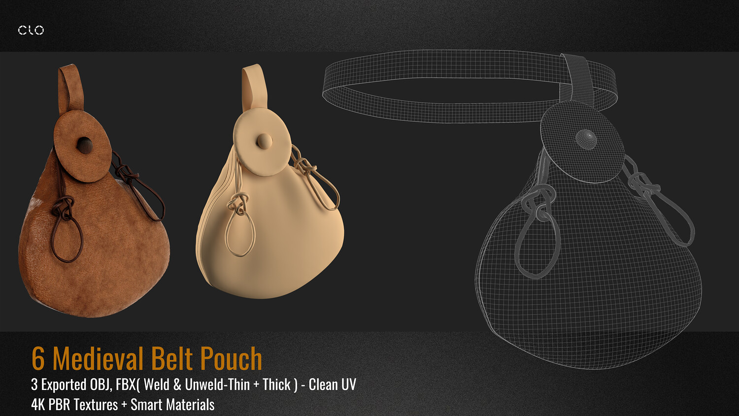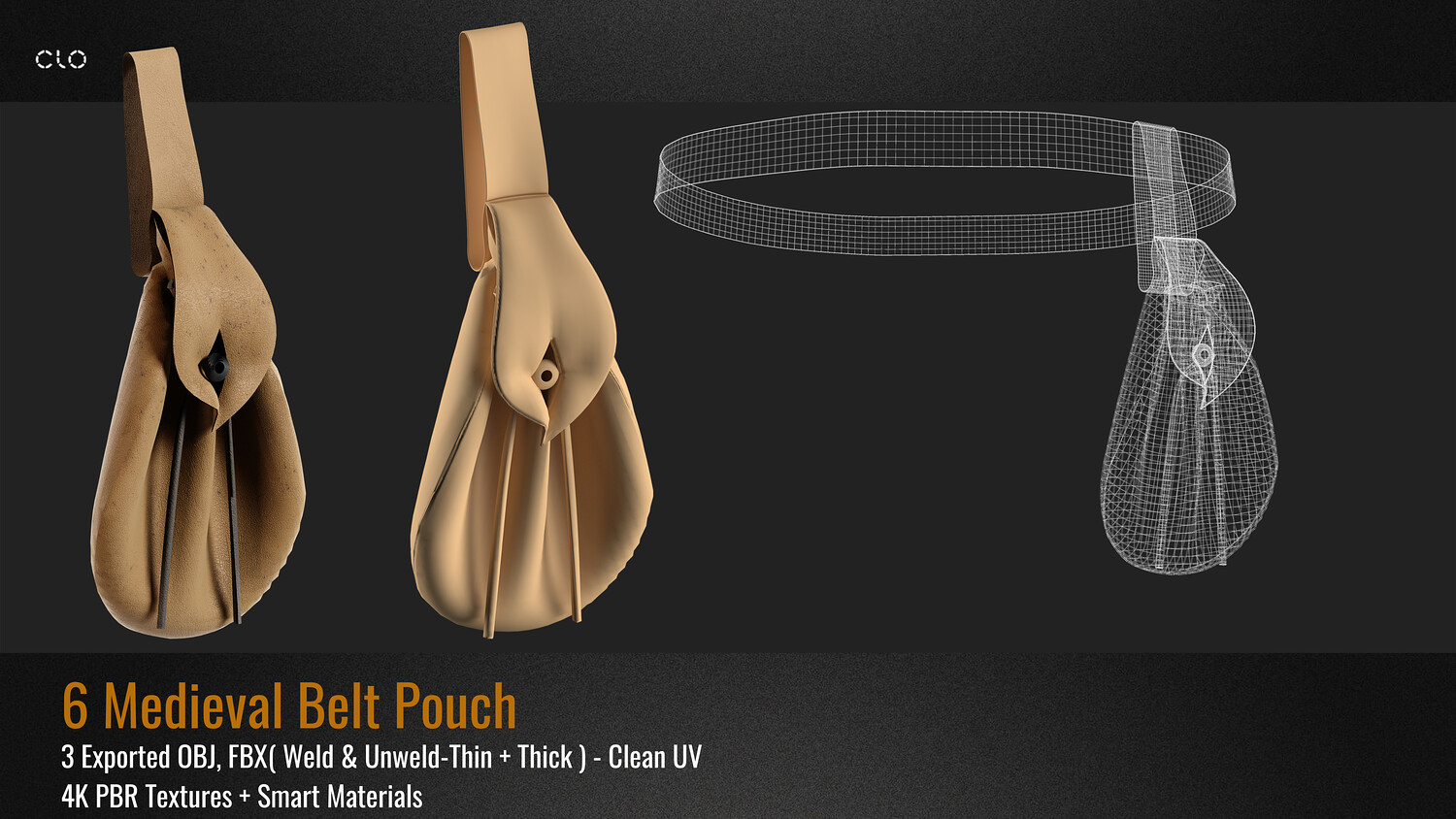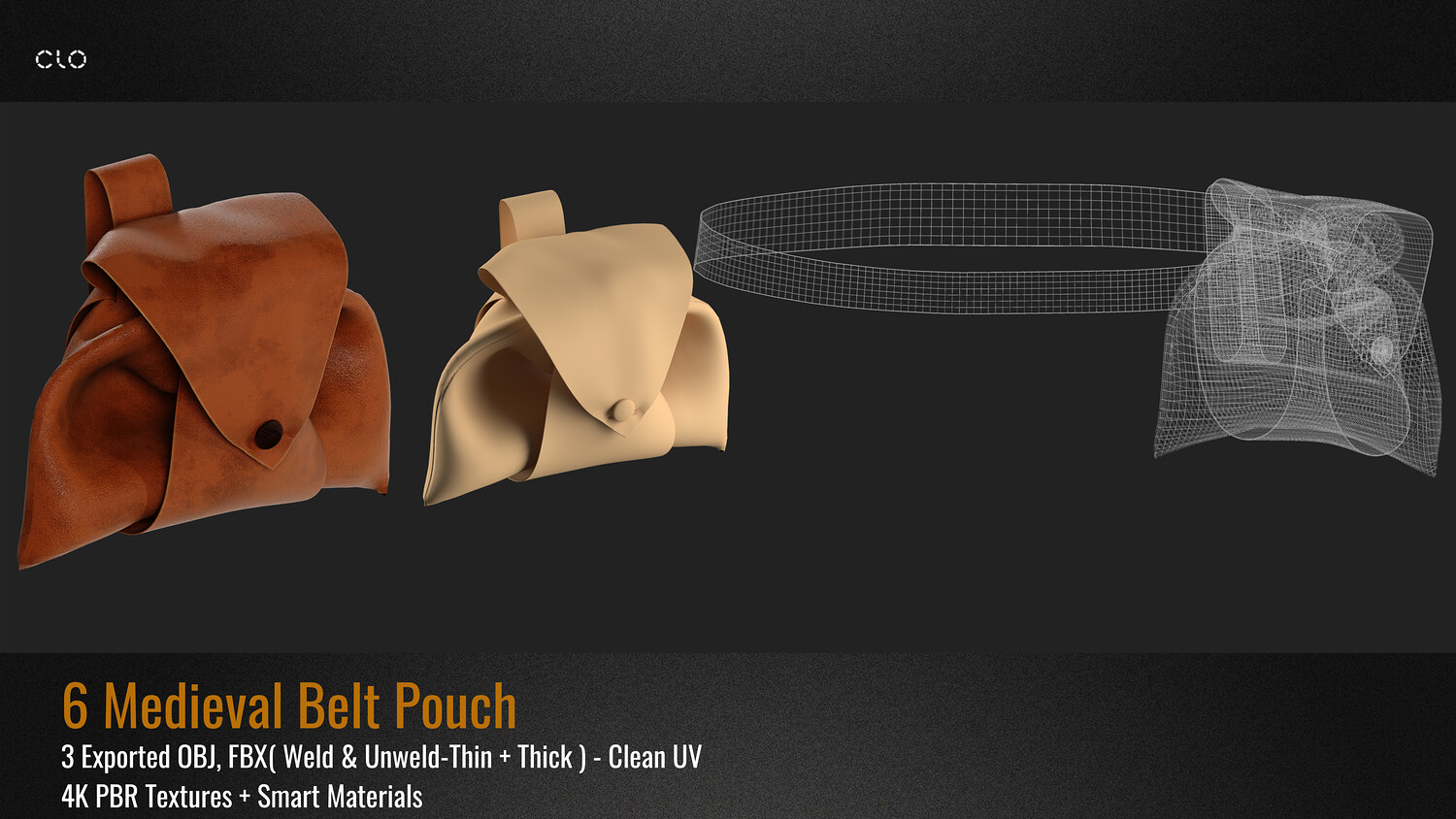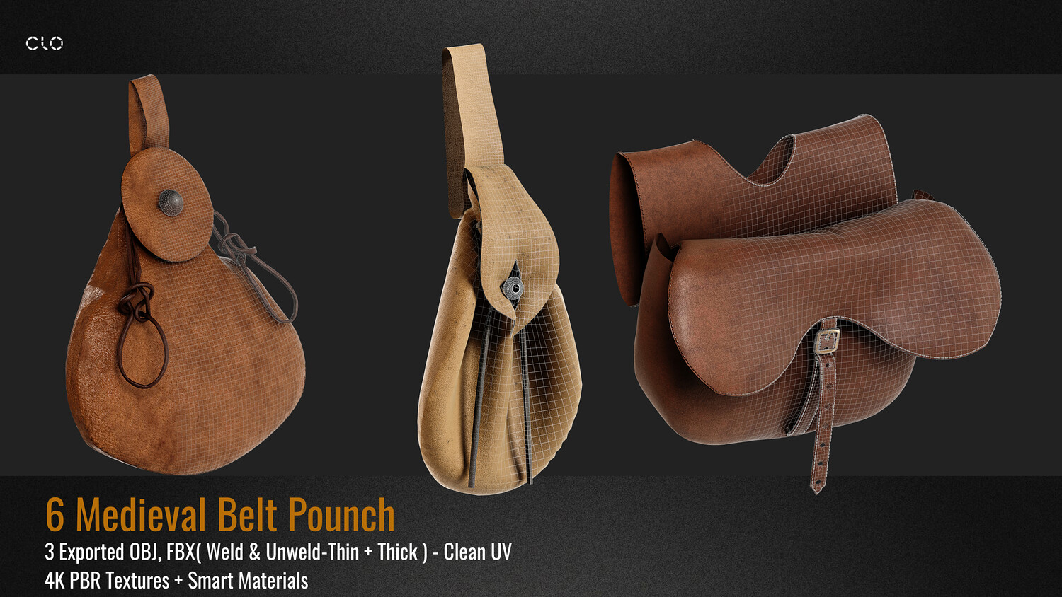 6 Medieval Belt Pouch . Marvelous Designer/Clo3D file+OBJ,FBX+4K Textures(PBR+Smart Material)