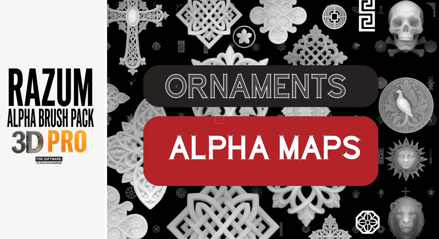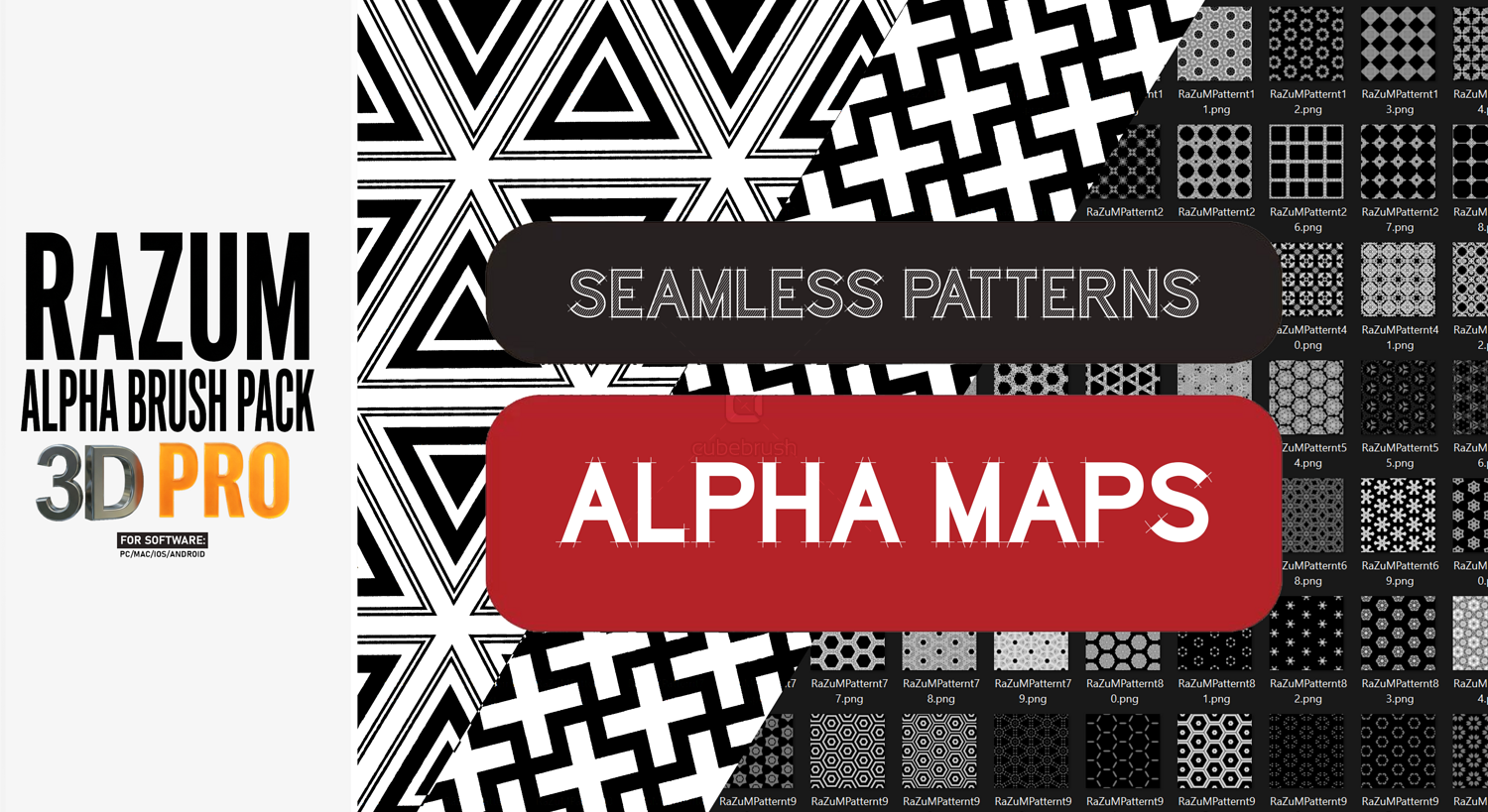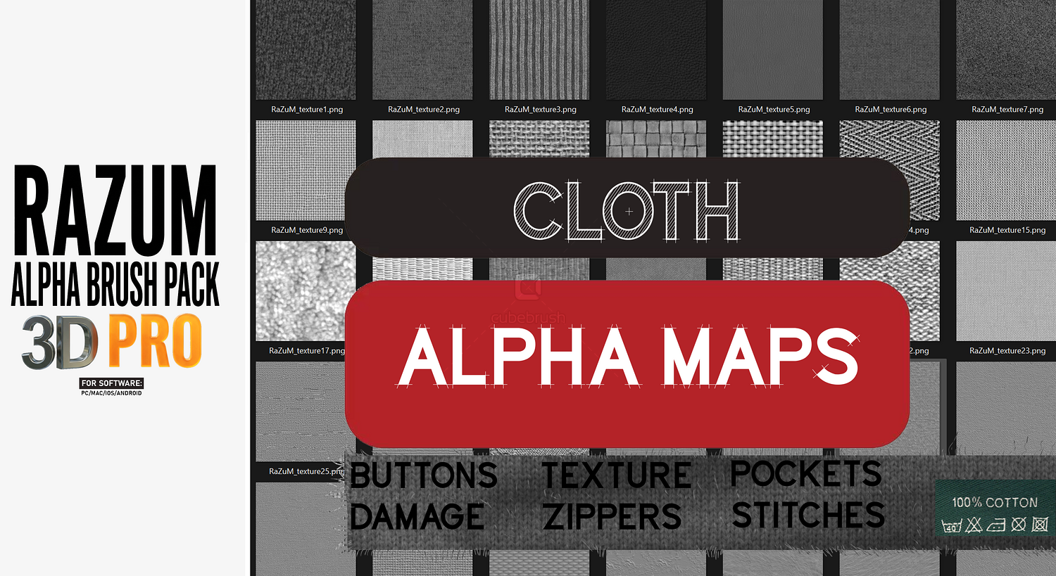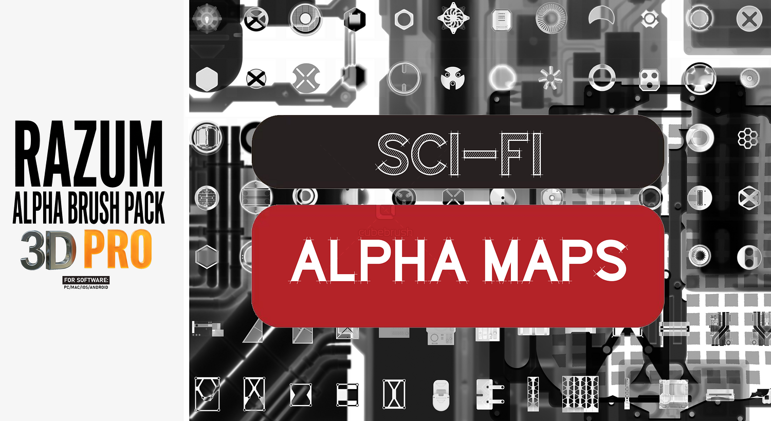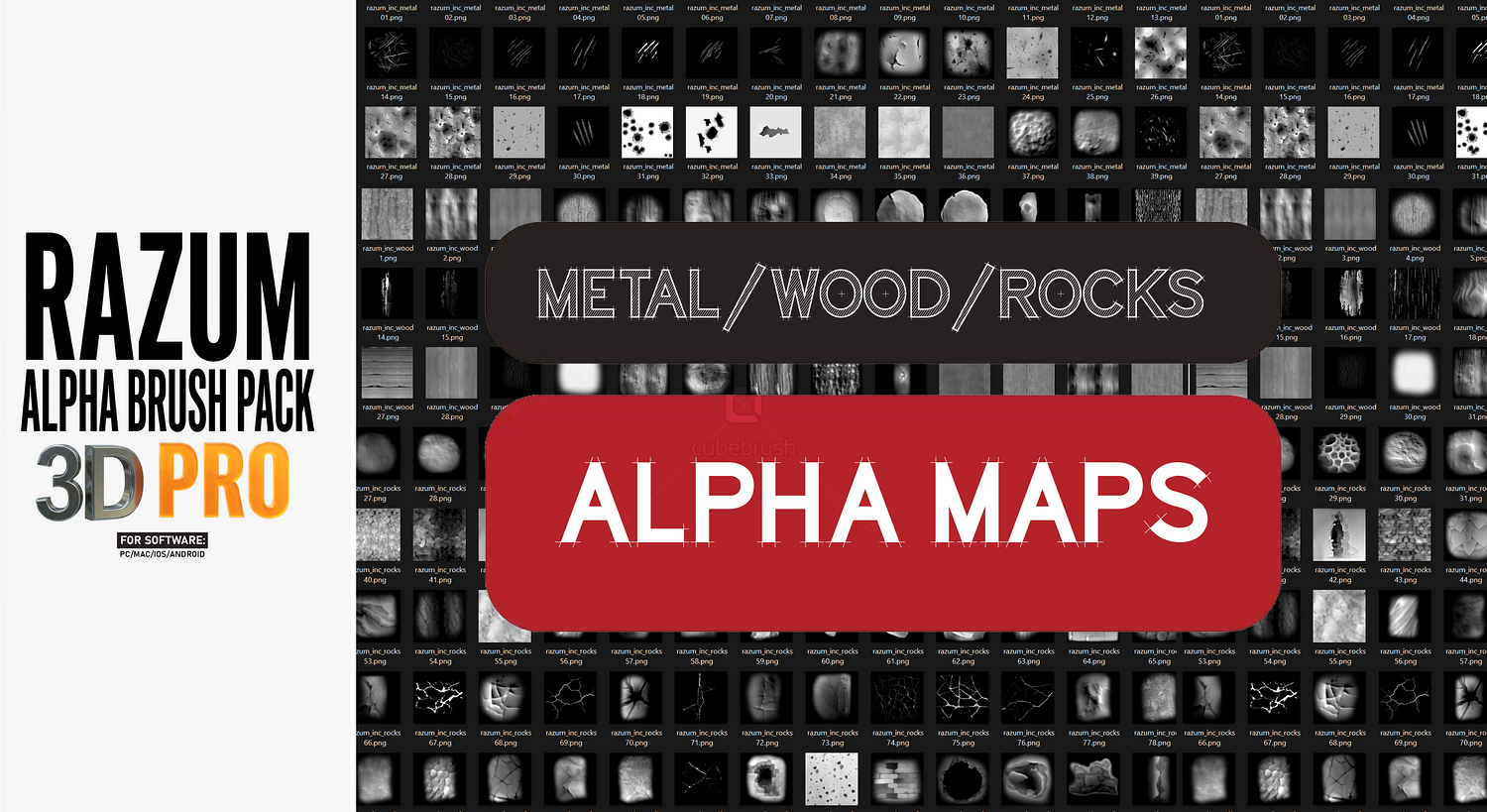 -Sci-Fi detailed panels & circular forms -Hard-surface & geometric brushes -Grid-based and modular shapes -Realistic cloth, wood, and organic alphas -Cracks, rocks, and metal alphas -Graffiti, signs, logos, and decals