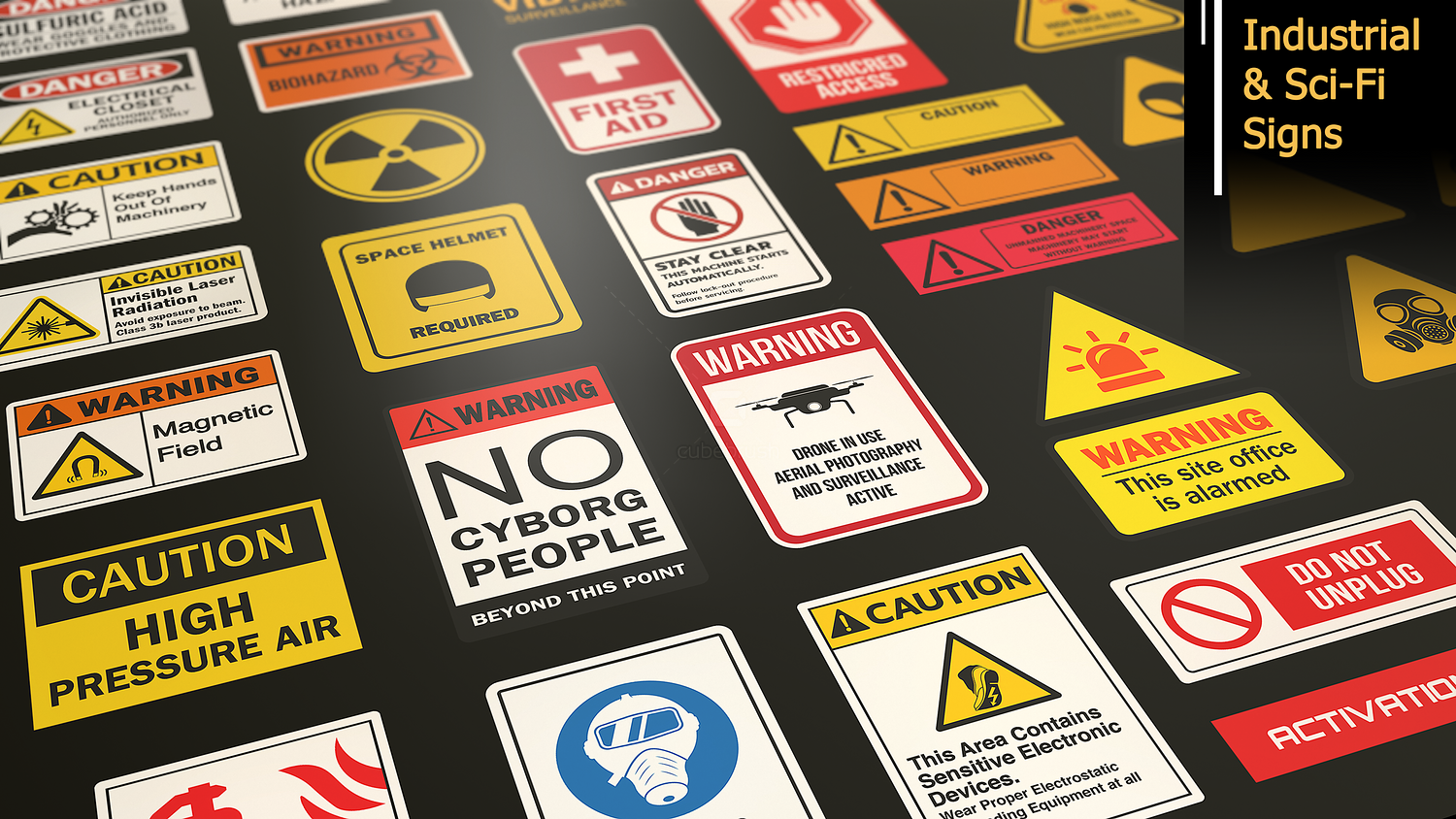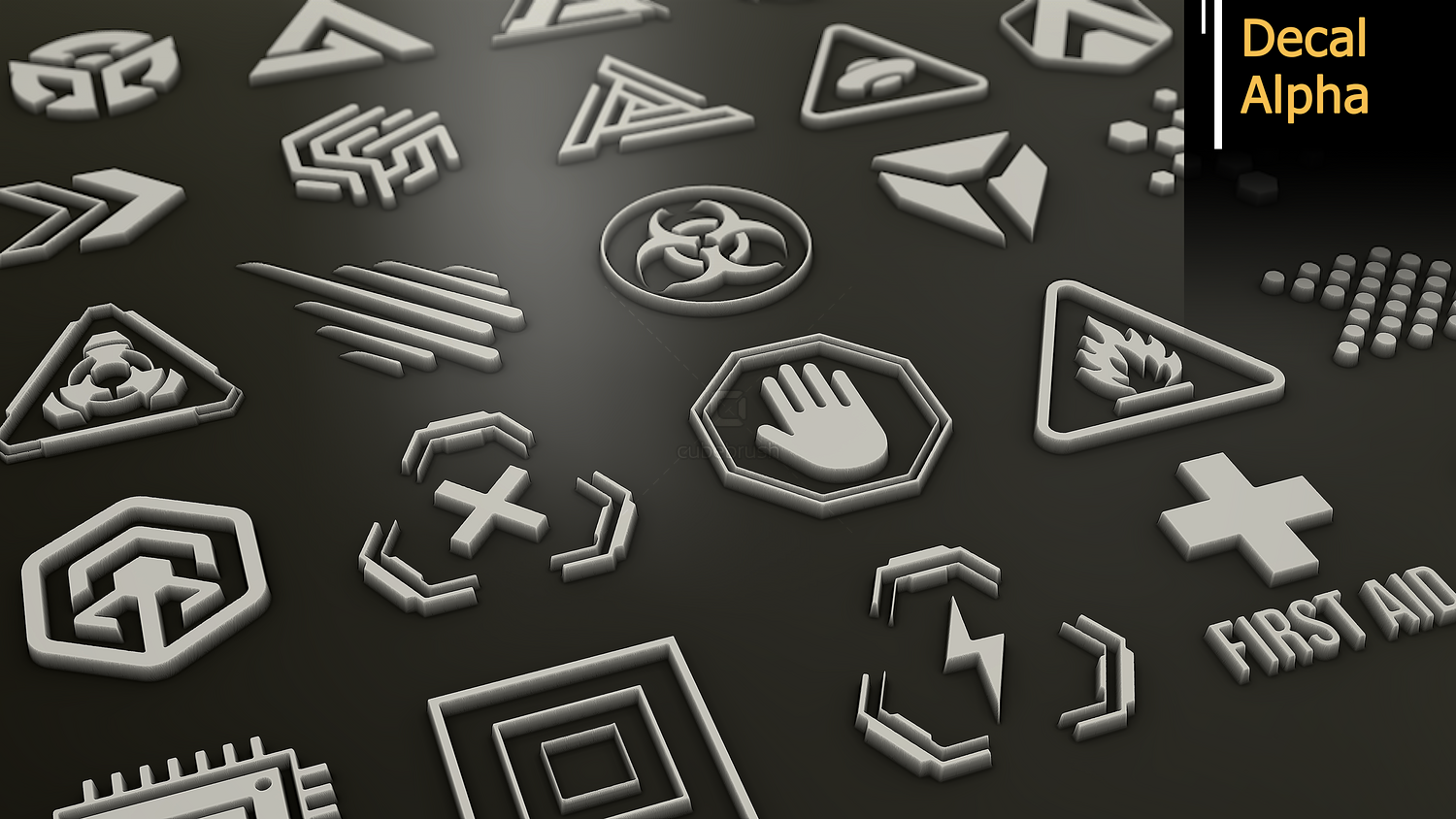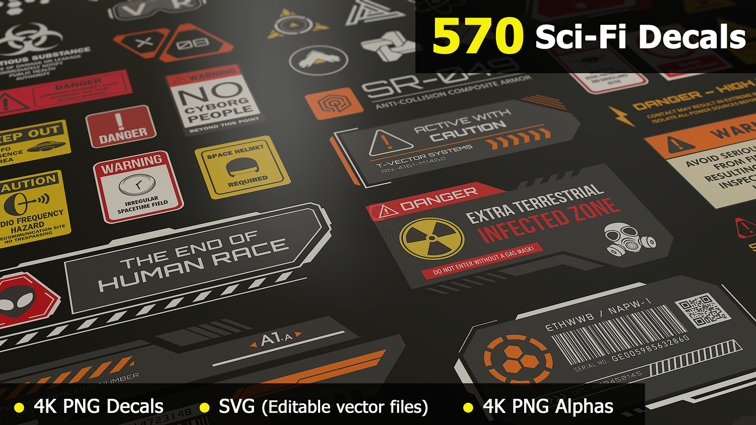 This pack includes 570 Sci-Fi decals for both 2D and 3D artworks. Inside, you’ll find logos, symbols, icons, basic shapes, industrial and sci-fi signs, tech and science shapes, info decals, and alphas.