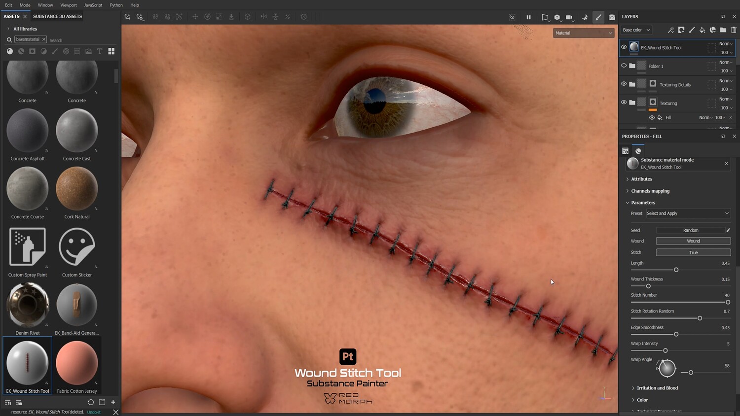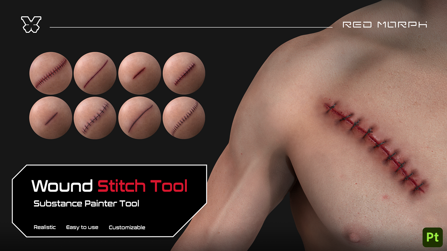 From open wounds to stitched and healing ones, this procedural decal tool lets you create realistic stitched wounds directly inside Substance Painter or other software that supports the Substance plugin.