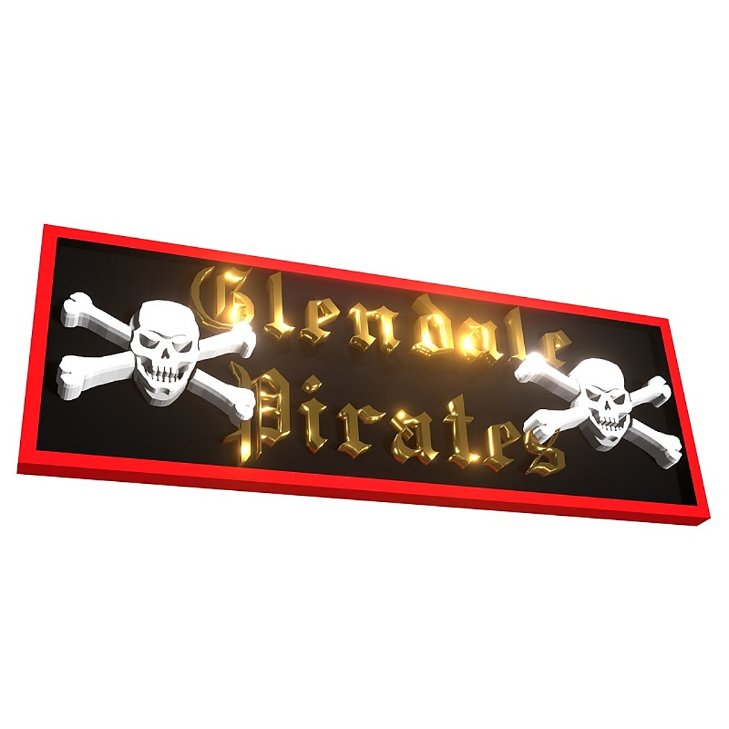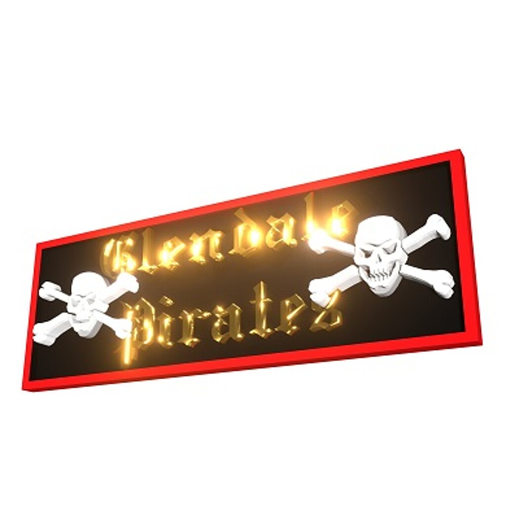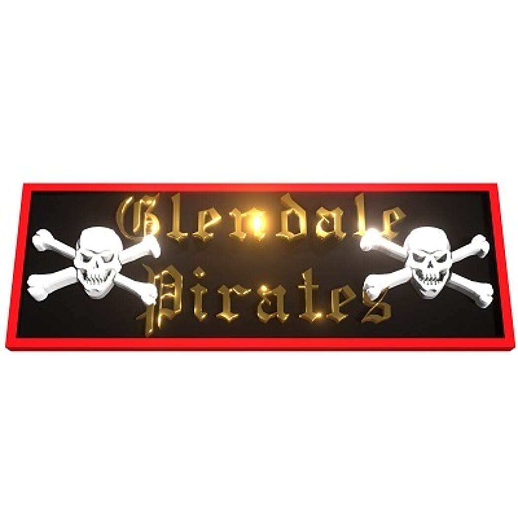 This is a digital 3D model of a plate or banner with the words "Glendale Pirates" and a "Jolly Roger" logo, created using the 3D modeling software tool Blender. If you would like a digital 3D file of your logo please contact me here.