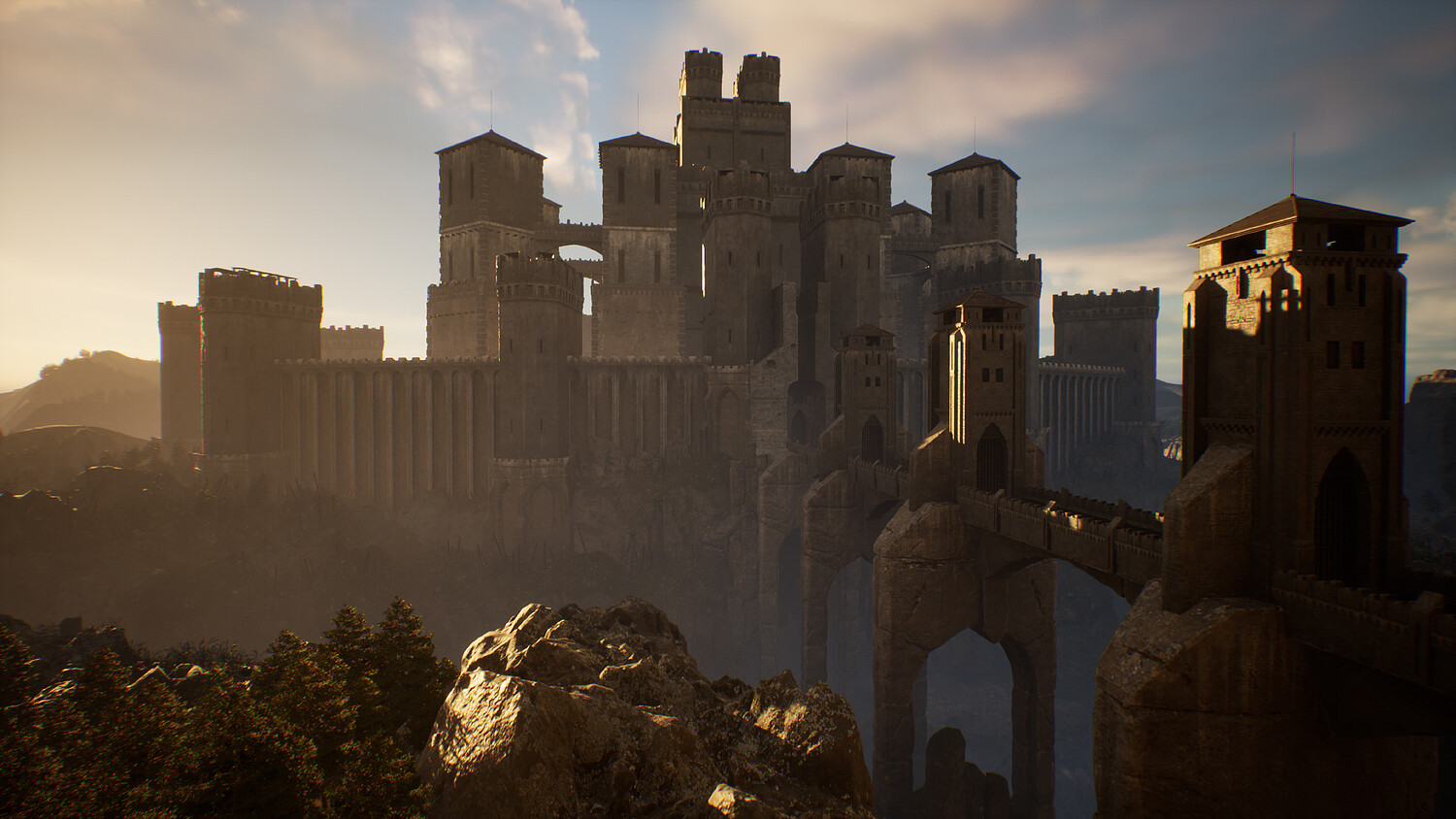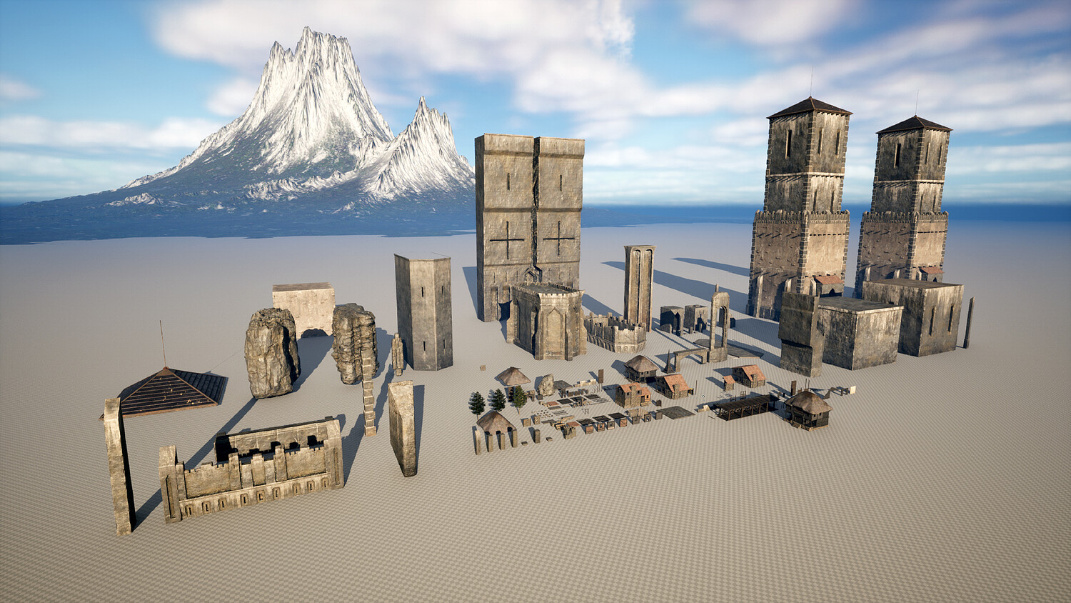 The "Castle" pack offers a comprehensive set of modular medieval architectural elements, including walls, towers, gates, and more, allowing for customizable castle configurations. Set within a vast valley encircled by a massive canyon, the environment features a defensive moat complemented by strategically placed towers. The meticulously detailed assets enable seamless modification of both the castle structures and the surrounding terrain, making it ideal for creating immersive medieval scenes in games, films, or virtual experiences. Technical details Features:
