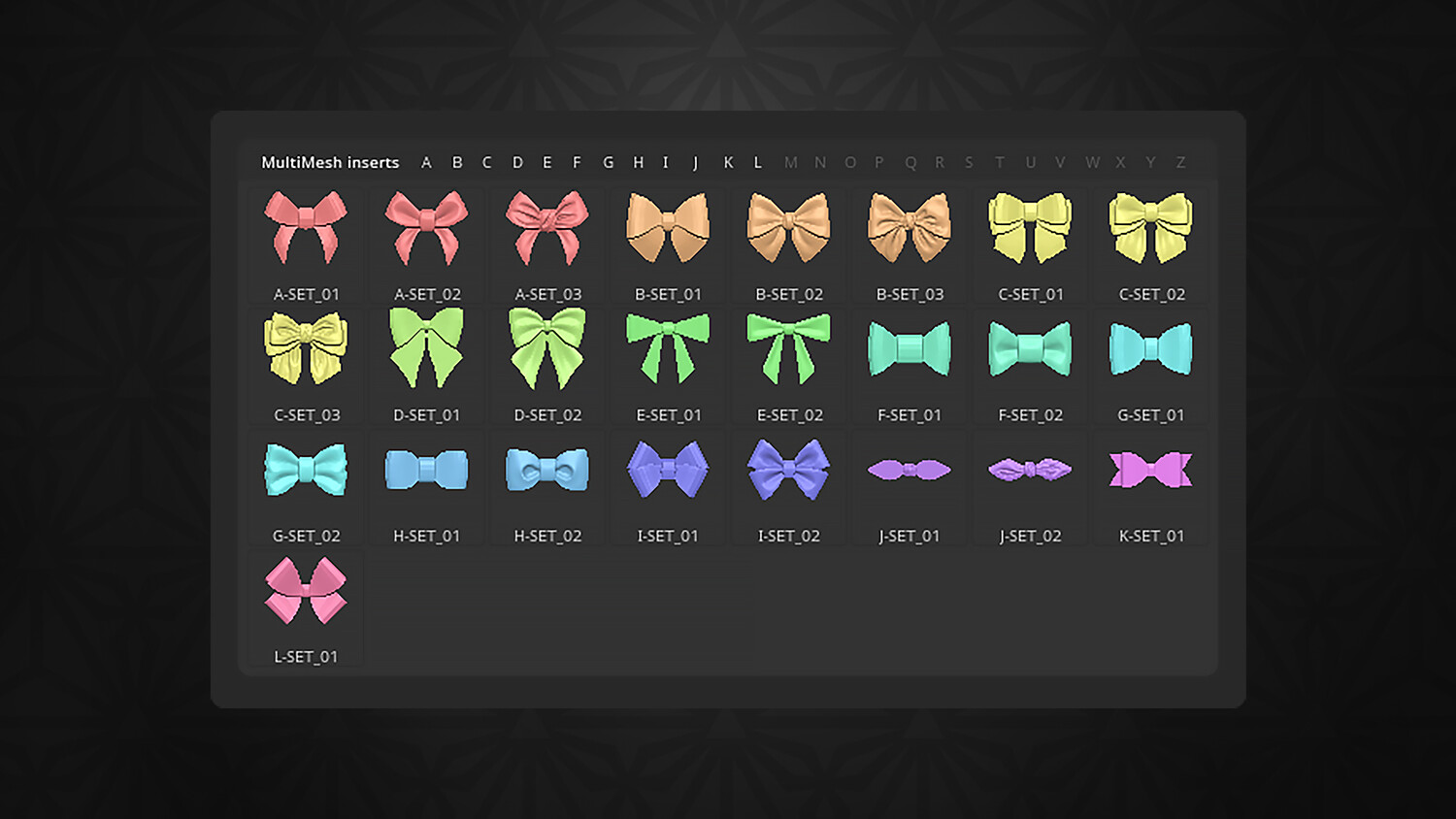 The set includes 12 color-coded bow collections, each offering the same shapes in different mesh resolutions. Use the low-resolution versions to quickly block out your designs or manually tweak the folds, or choose the high-resolution versions with sculpted details when you're pressed for time and need a polished finish right away.