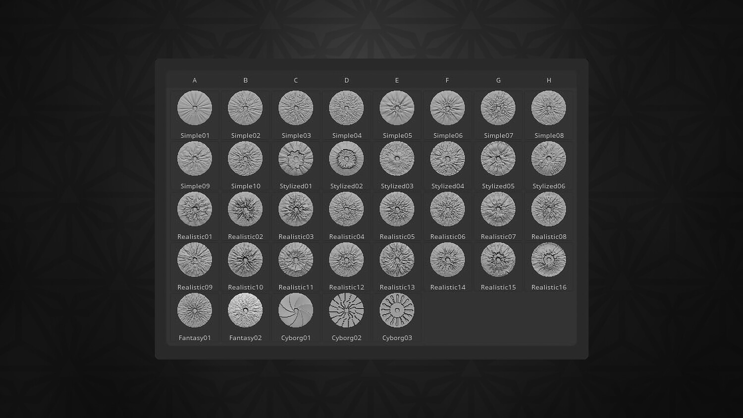 The eyes are the first thing we unconsciously notice, which makes them one of the most important elements to focus on when creating a character – especially if the design includes realistic details or is entirely realistic. This product includes 37 iris stamps in various styles such as stylized, realistic, and cyborg. You’ll also get the same stamps as alpha textures, along with a base eye mesh to project them onto. Simply choose your preferred iris style and stamp it onto the provided eye mesh. You can also combine multiple stamps to create unique and original patterns.