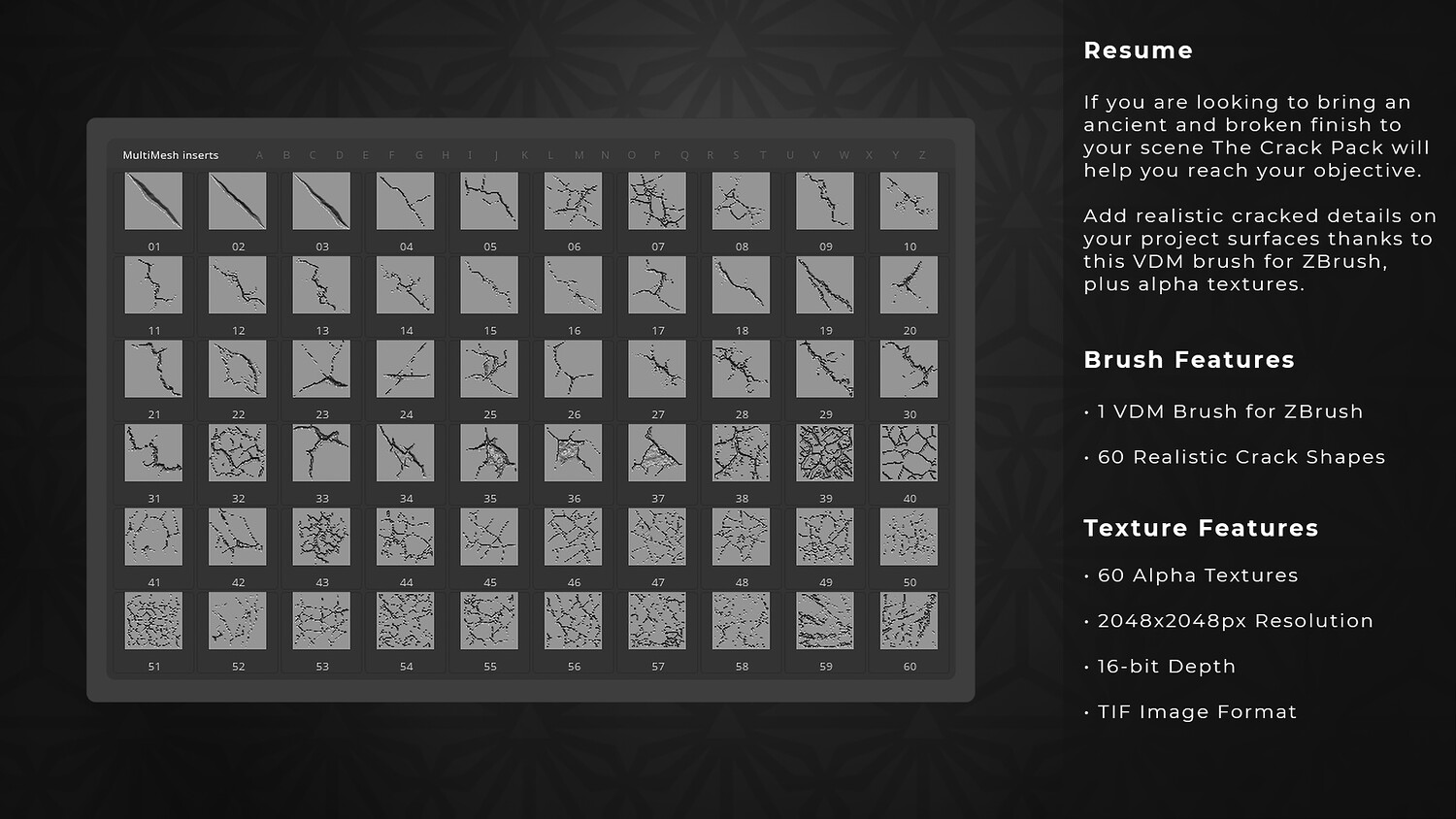 This pack contains 60 realistic cracks usable on multiple mediums – VDM brush for ZBrush and 2k 16bit .TIF image textures. The shapes are easy to drag into position.