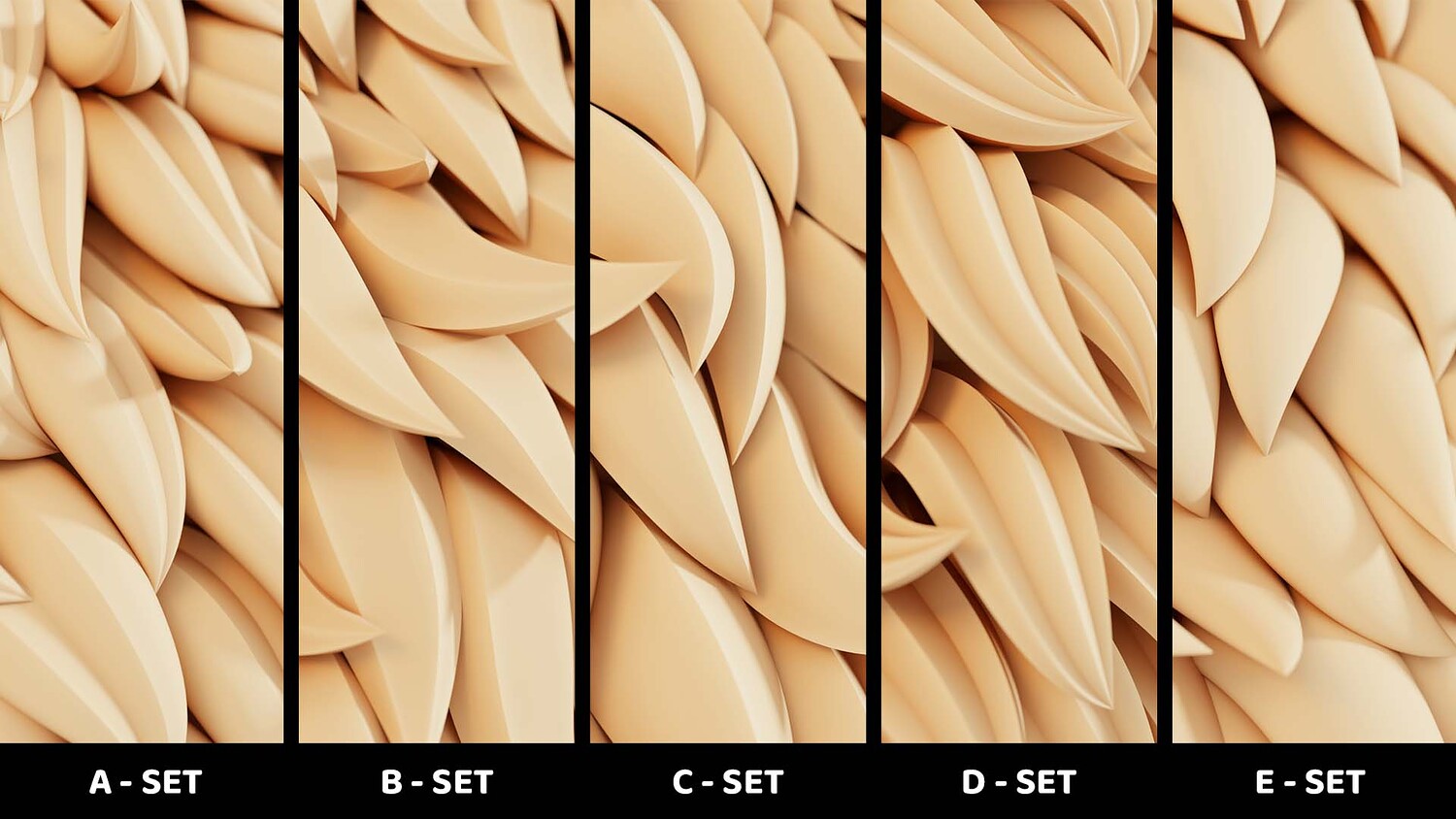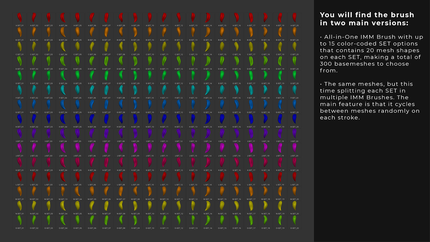 Up to 15 color-coded SET options that contains 20 mesh shapes on each SET, making a total of 300 basemeshes to choose from.