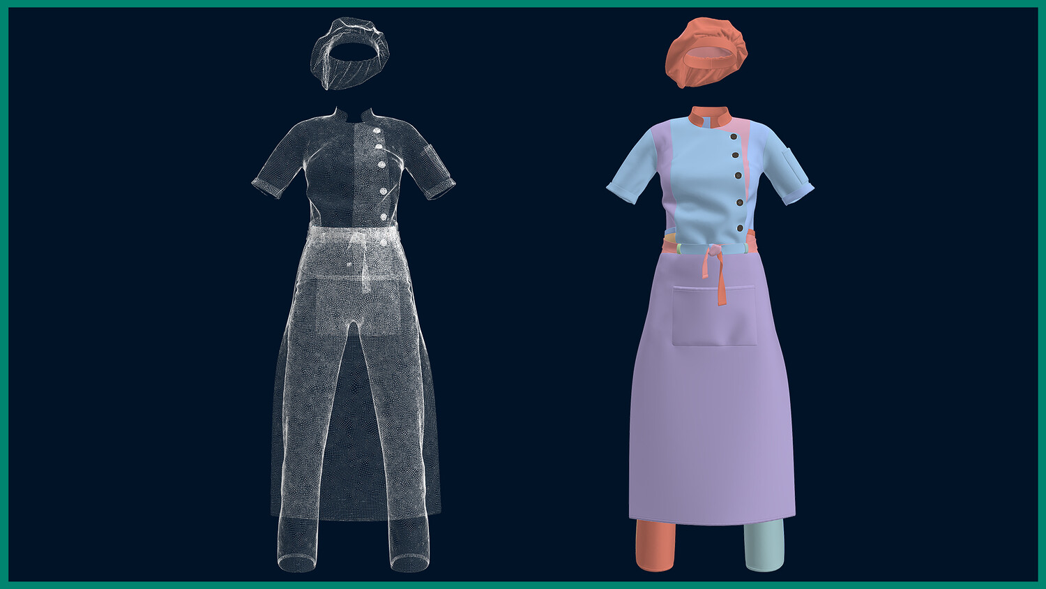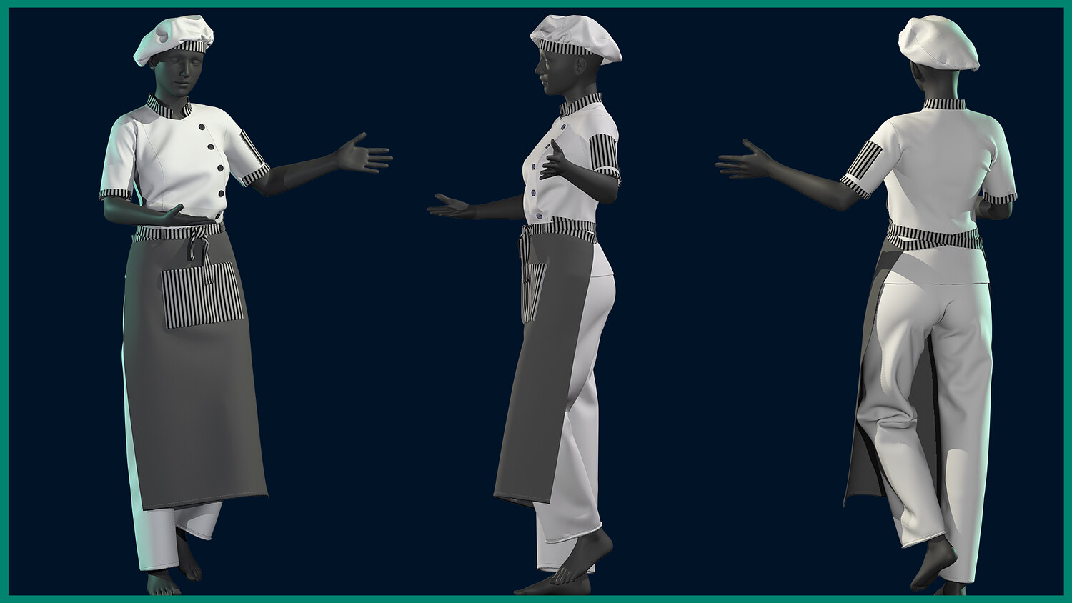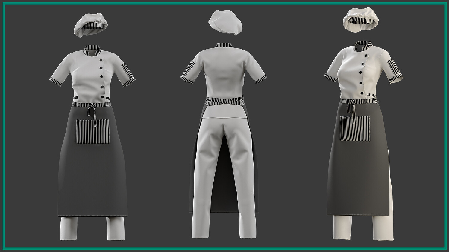 Marvelous Designer or Clo3D (ZPRJ) -A Pose and standard fabric for separate complete outfit, apron, hat, pants, coat