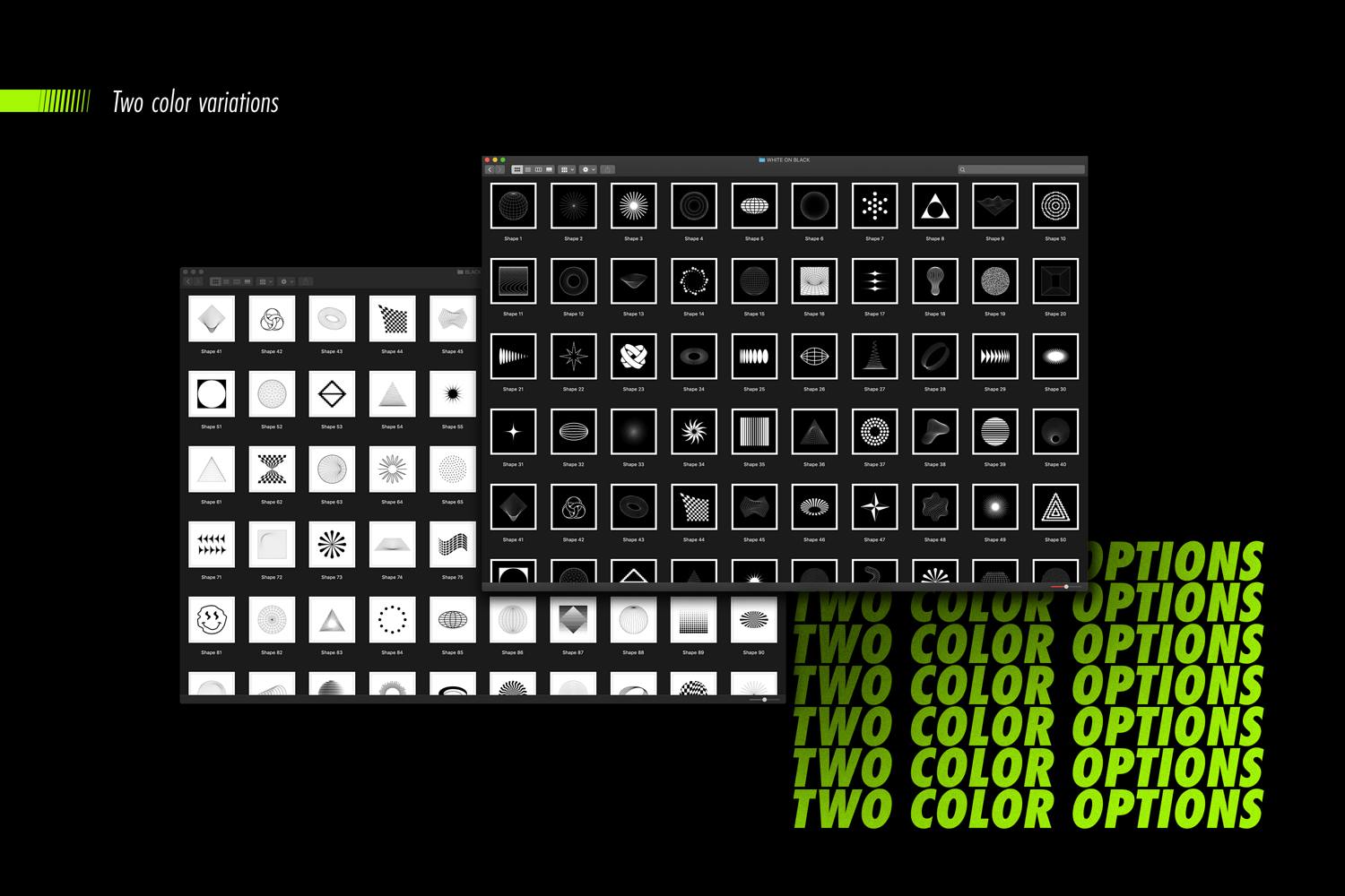 - PNG Files: 100 elements in two color schemes, set on a transparent background – just drag and drop them into your designs.