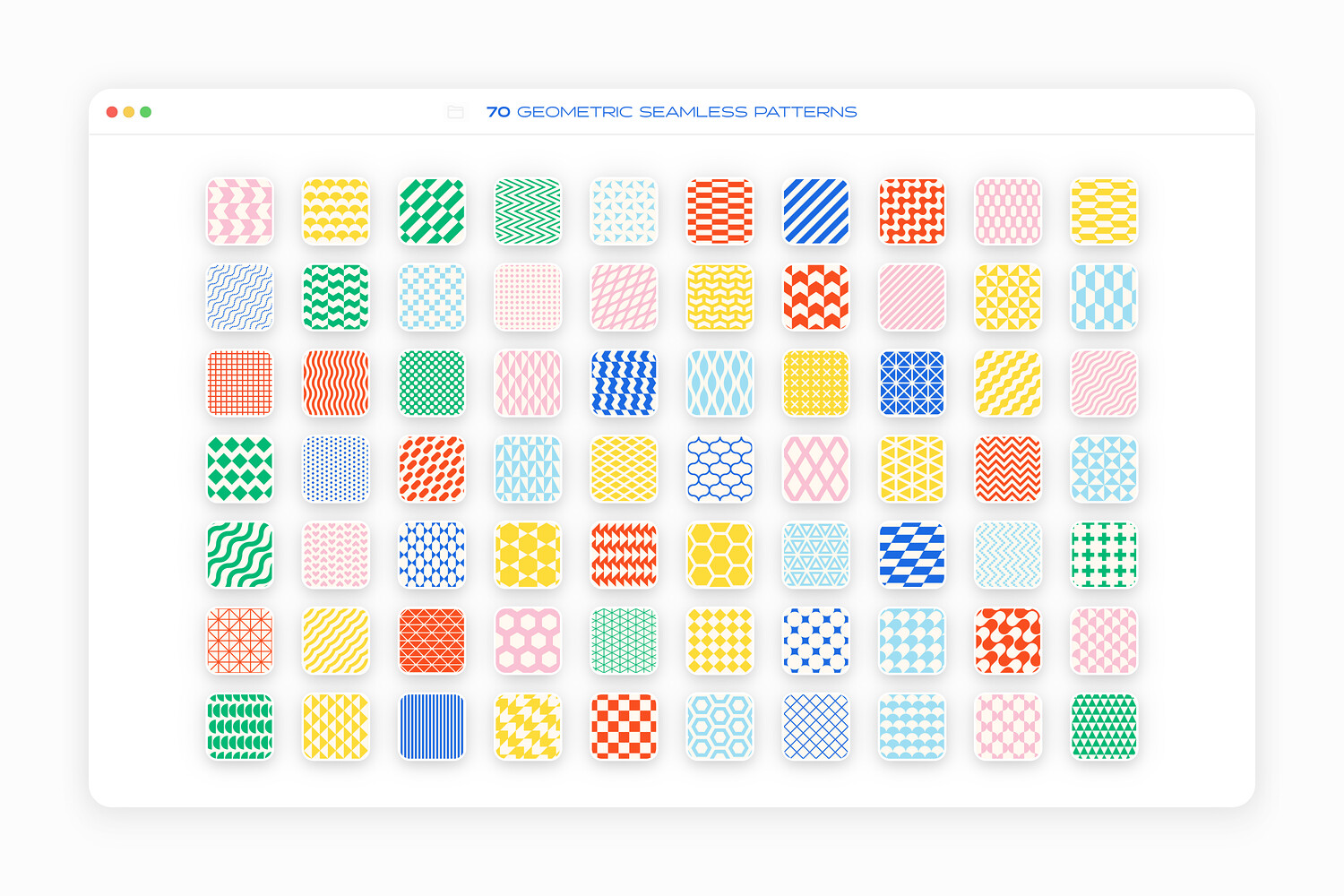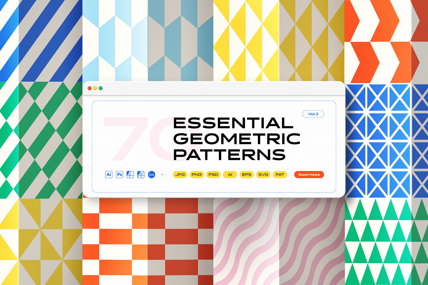Elevate your creative projects with the Essential Geometric Seamless Patterns Collection, an exquisite set of 70 multicolor geometric patterns designed to streamline your workflow.