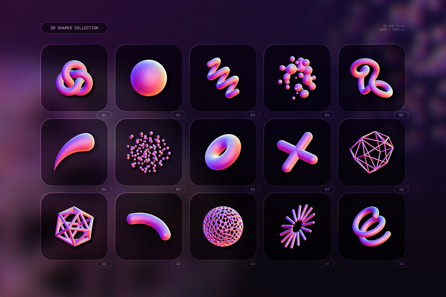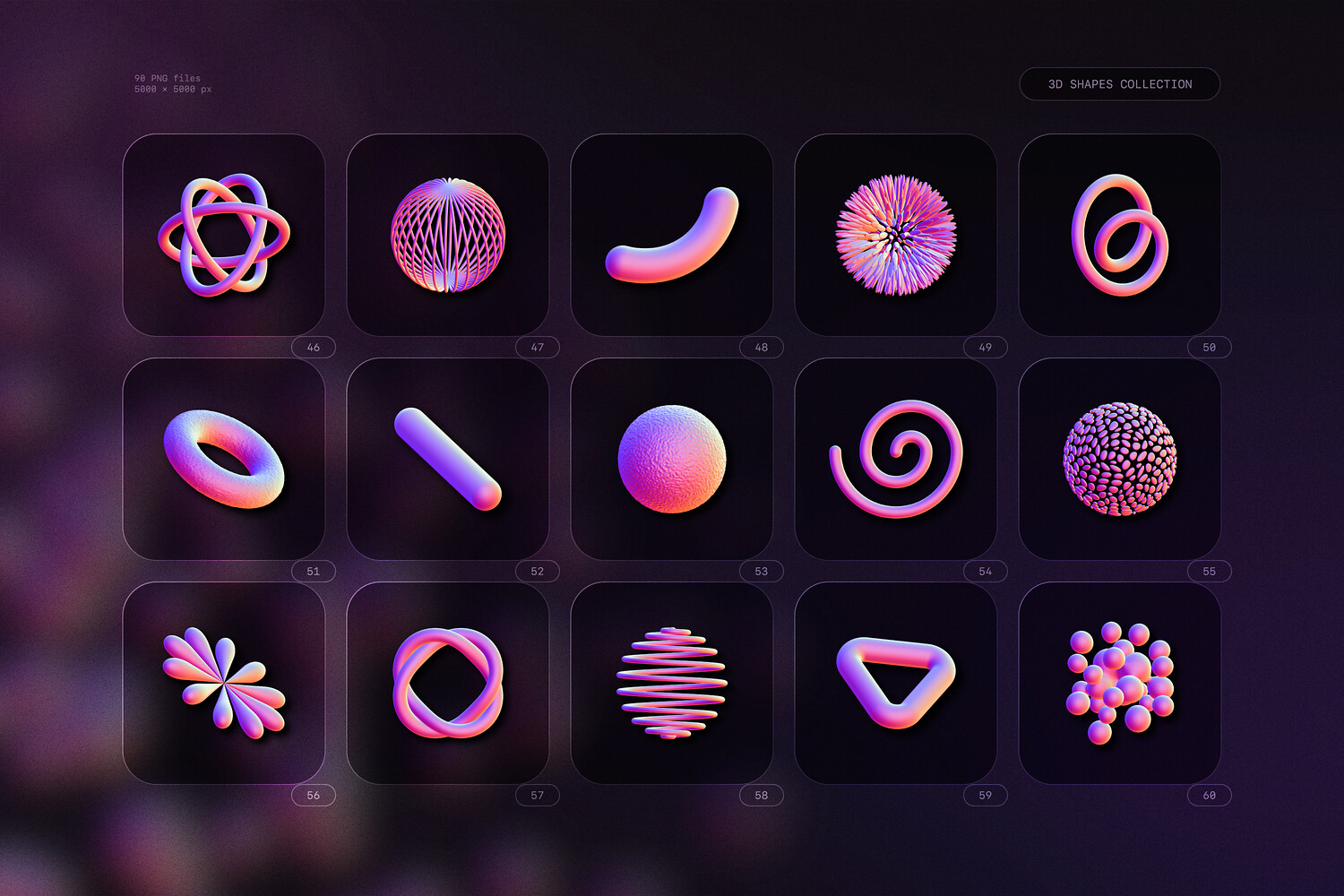 The collection features 90 abstract 3D shapes, rendered in captivating pink and purple holographic hues and ranging from simple geometric forms to intricate, surreal structures, providing a rich variety of options to suit any design need.