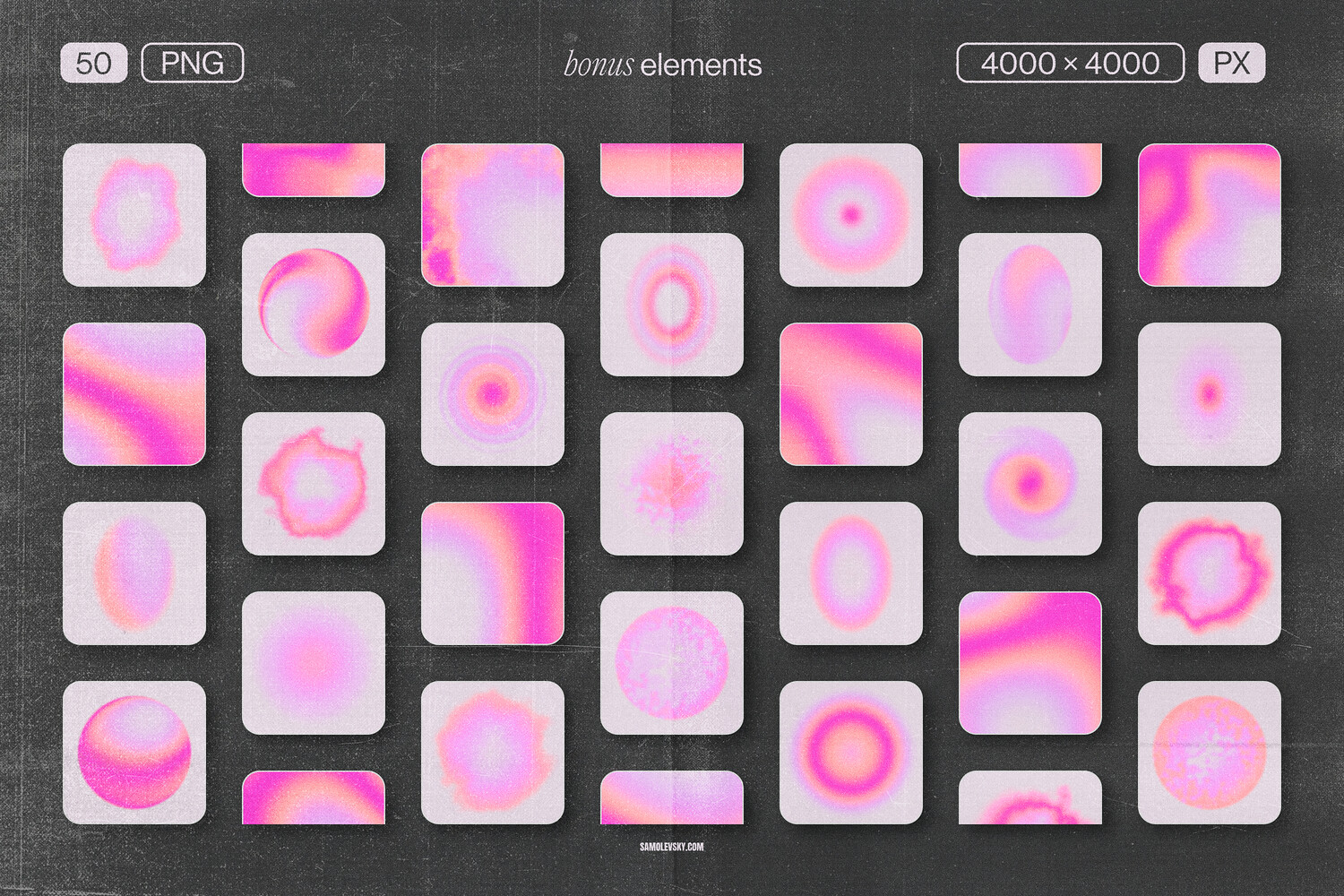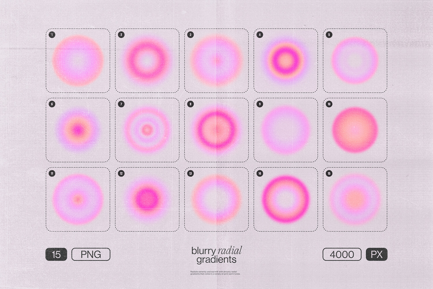 - Dreamy, blurry gradients in soft pink, peach, and purple tones, enhanced with a subtle grain texture for organic warmth. A subtle grain texture adds a warm, organic feel.