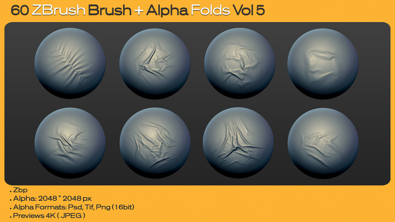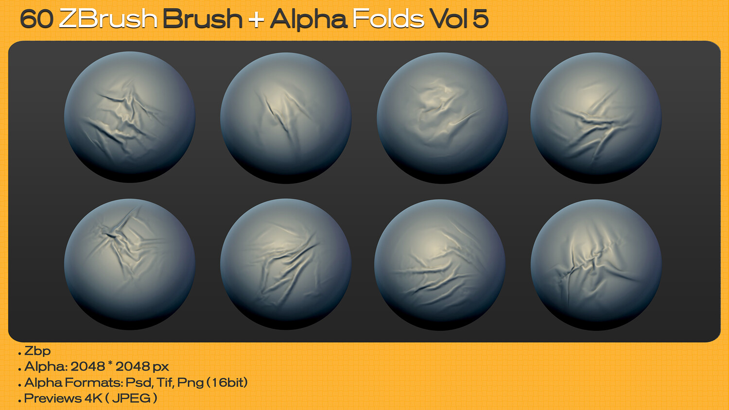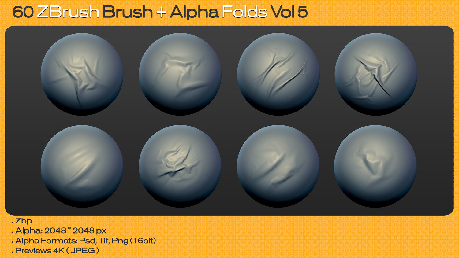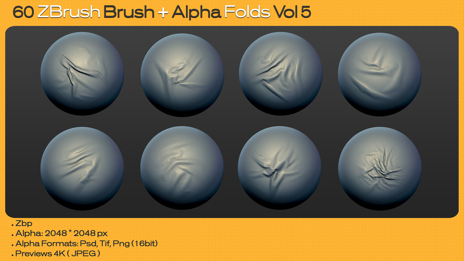60 Fold Brush (Zbp) 60 Alpha In 2K Resolution Alpha Formats: psd, Tif, Png (16bit) 4k Previews ( JPEG ) Alphas Can Be Use in any softwares that work with alpha Maps (Zbrush, Substance Painter, Blender, 3D Coat, 3dsMax, Maya, …)