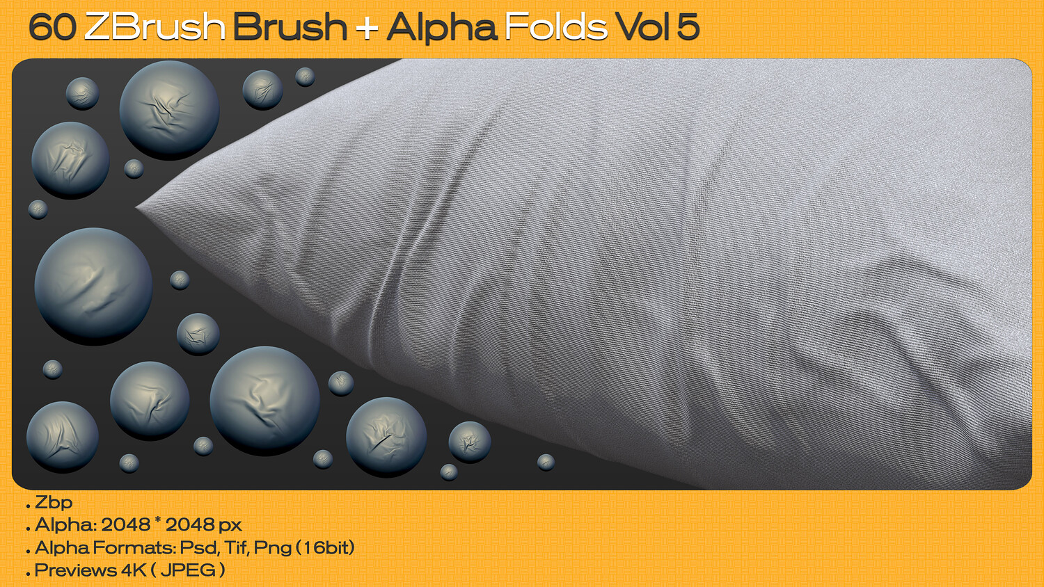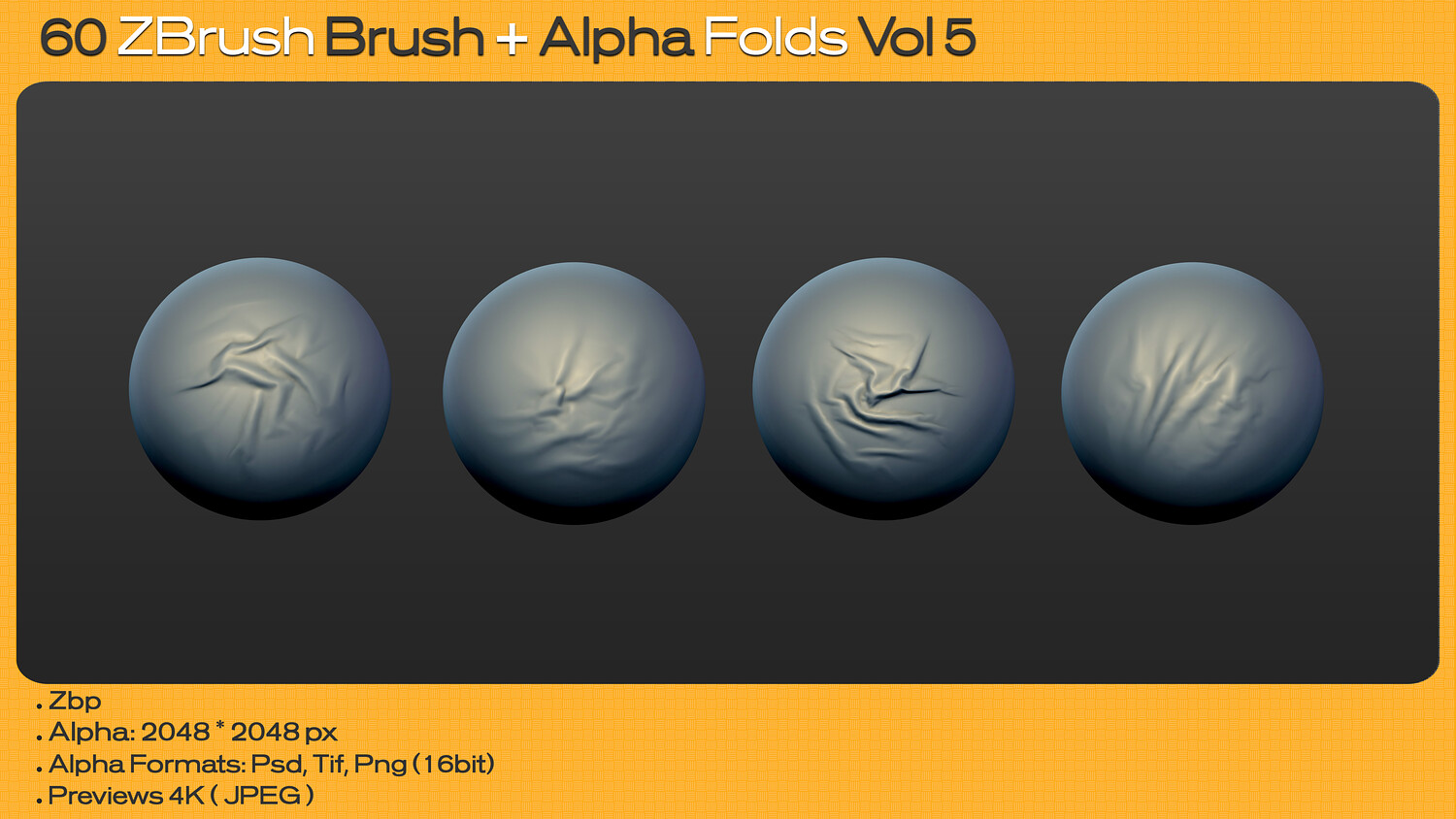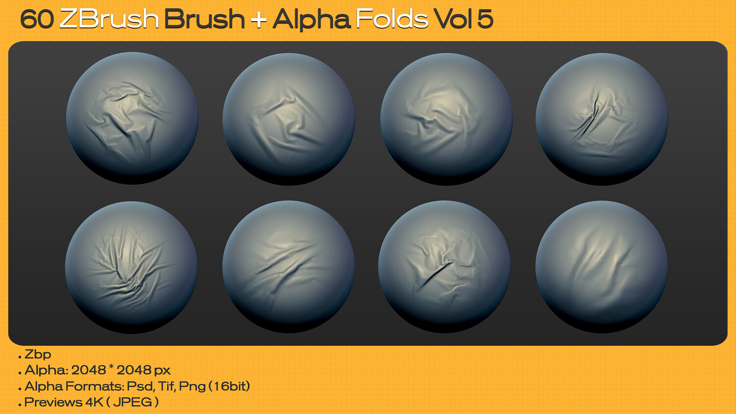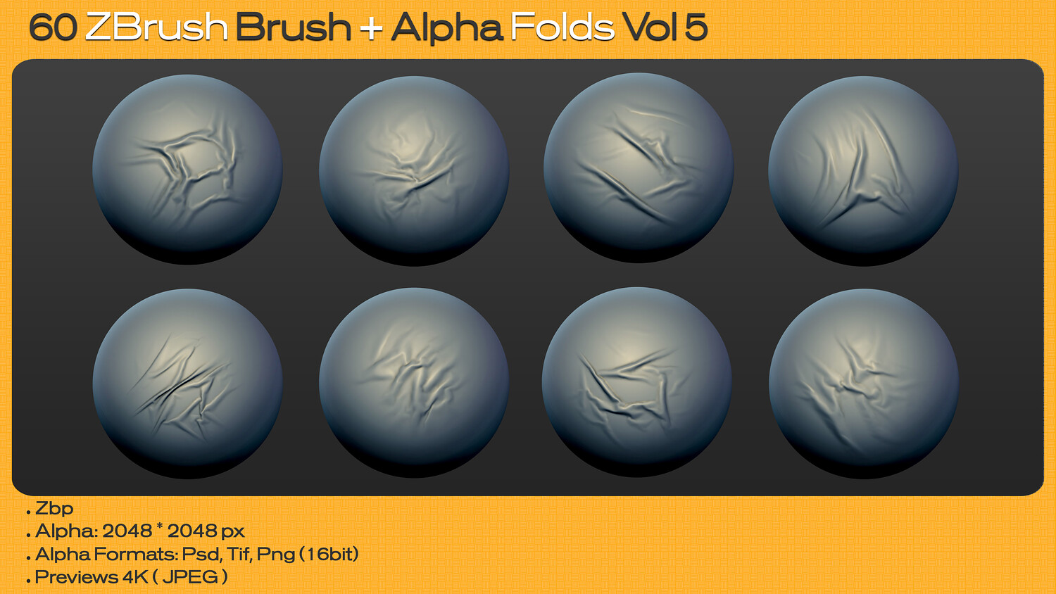 60 Fold Brush (Zbp) 60 Alpha In 2K Resolution Alpha Formats: psd, Tif, Png (16bit) 4k Previews ( JPEG ) Alphas Can Be Use in any softwares that work with alpha Maps (Zbrush, Substance Painter, Blender, 3D Coat, 3dsMax, Maya, …)