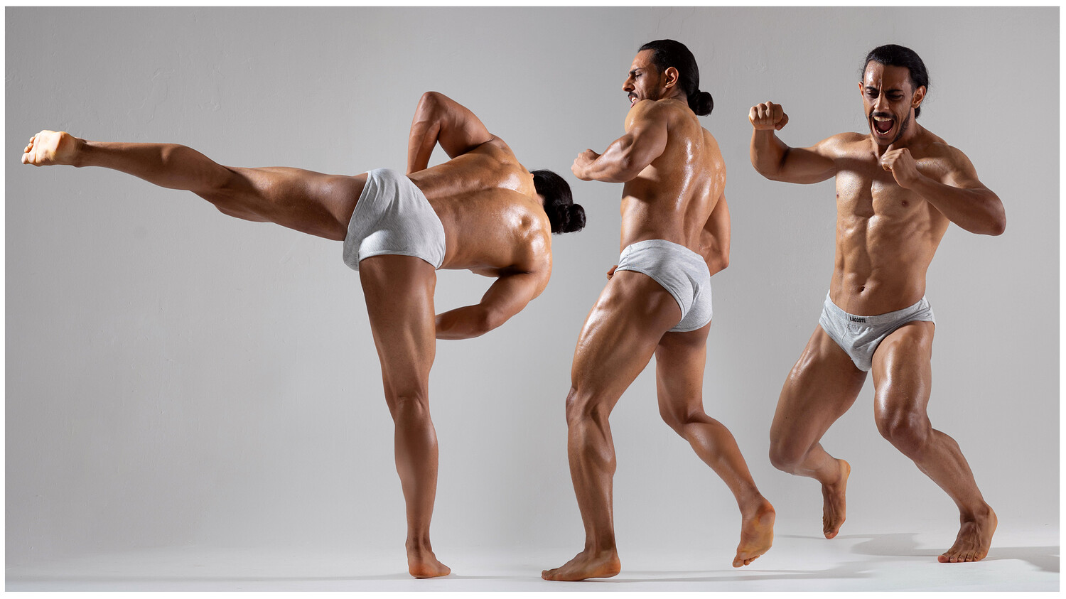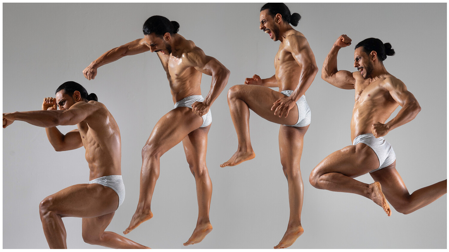 This digital product features a male fighter model captured in dynamic, high-energy pose sequences. The set includes powerful kicks, striking fist movements, and dramatic jumps that highlight motion and intensity. Each pose emphasizes expressive facial emotions, bringing raw energy and storytelling into every shot. The collection is designed to showcase the male anatomy in motion, with detailed muscle definition and realistic form. Perfect for artists, illustrators, and creators seeking dramatic reference material for combat and action scenes.