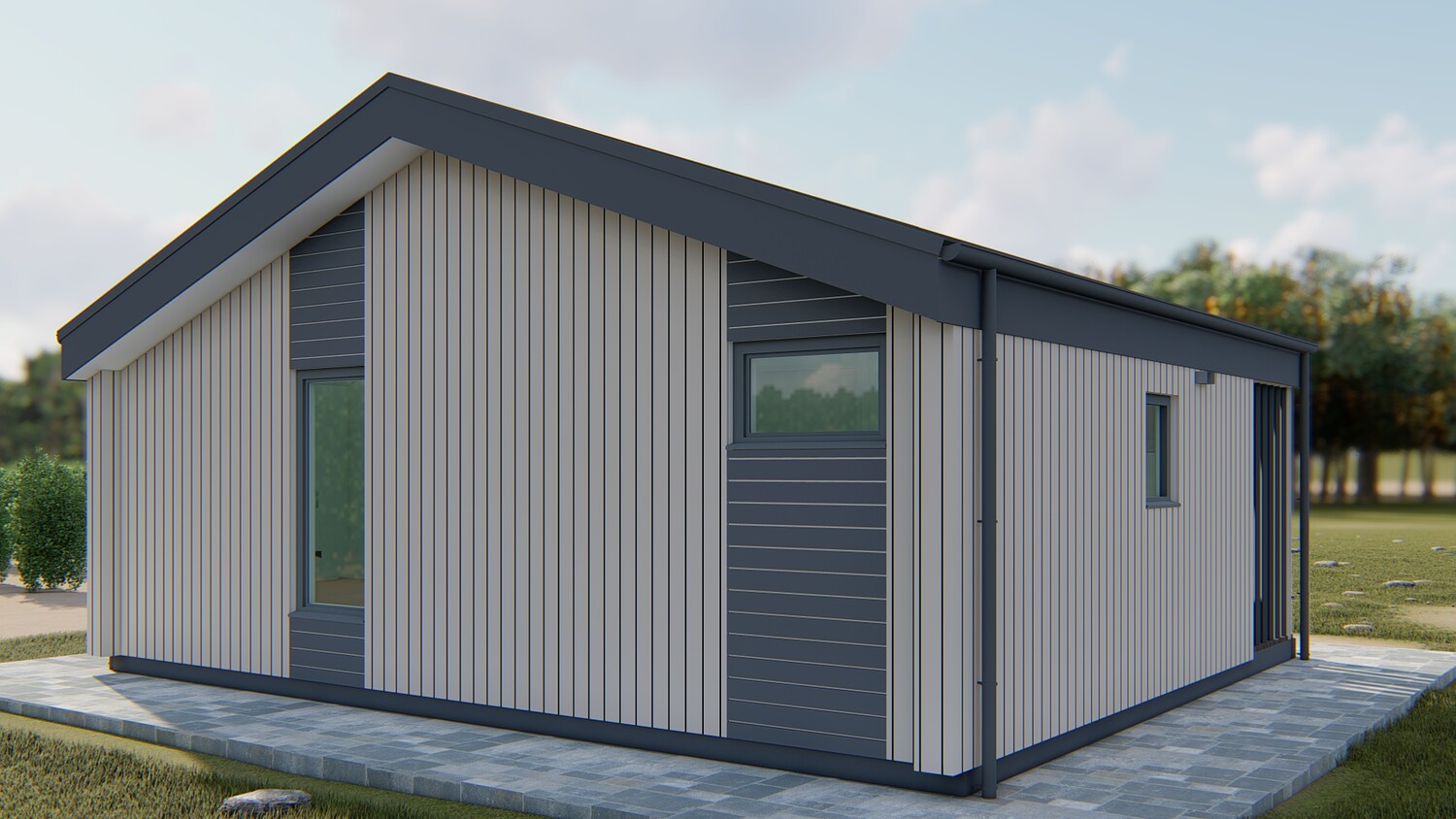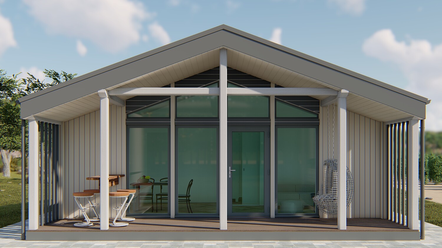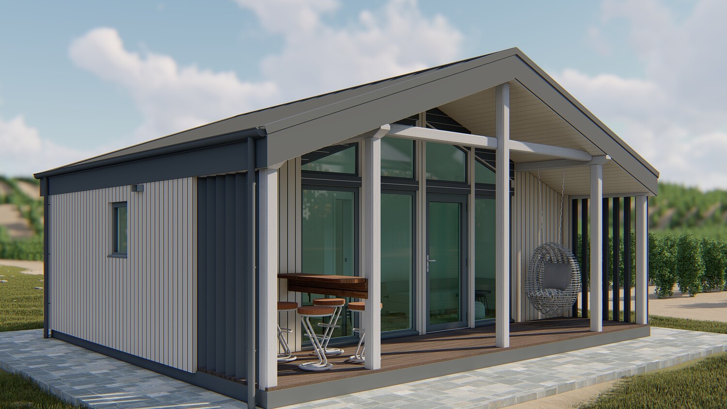 This model measures 6300 x 7460 mm and is designed for two people. The usable area is 32.4 m2. The terrace is 11.7 m2. It is designed for both seasonal and permanent residence. This set includes a detailed 3D model, floor plan and facades. You can build it yourself, or you can order it from us. We manufacture ready-made house kits and deliver them throughout Europe.