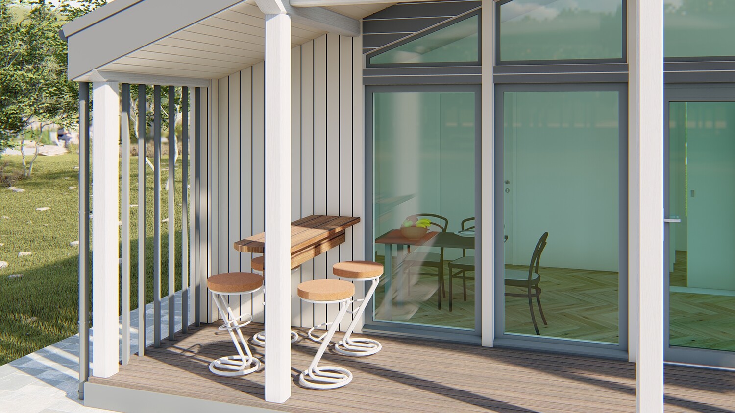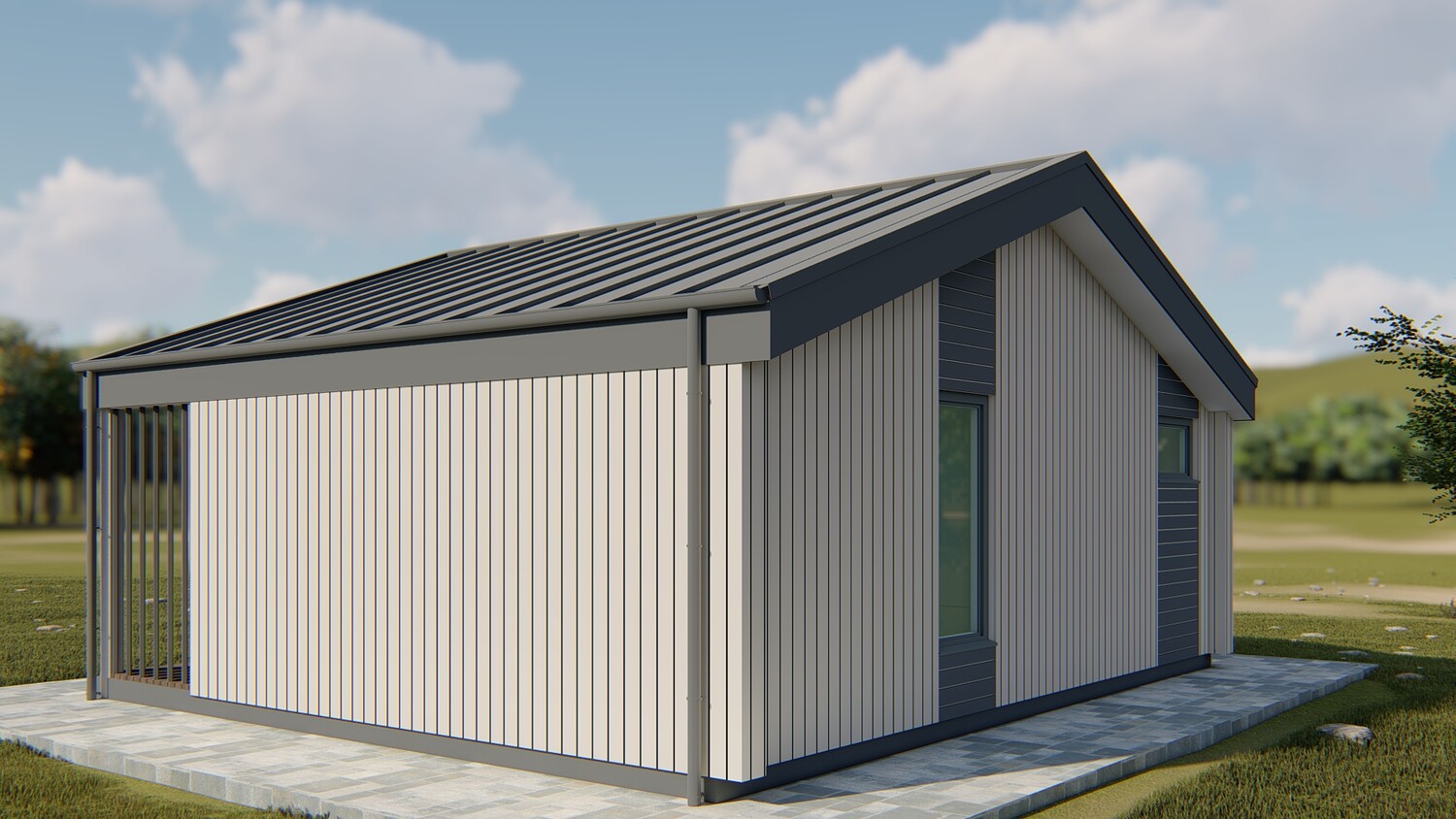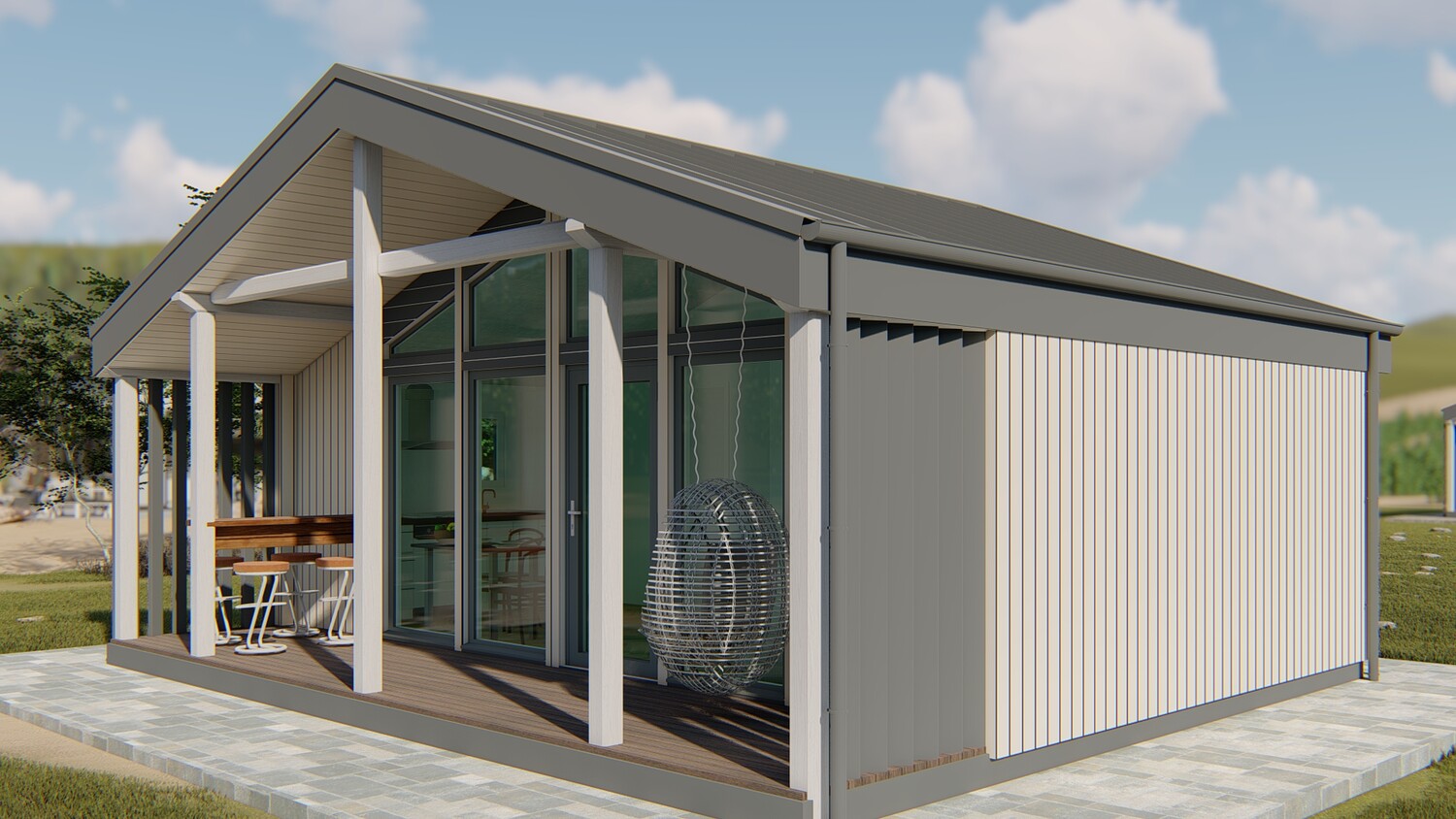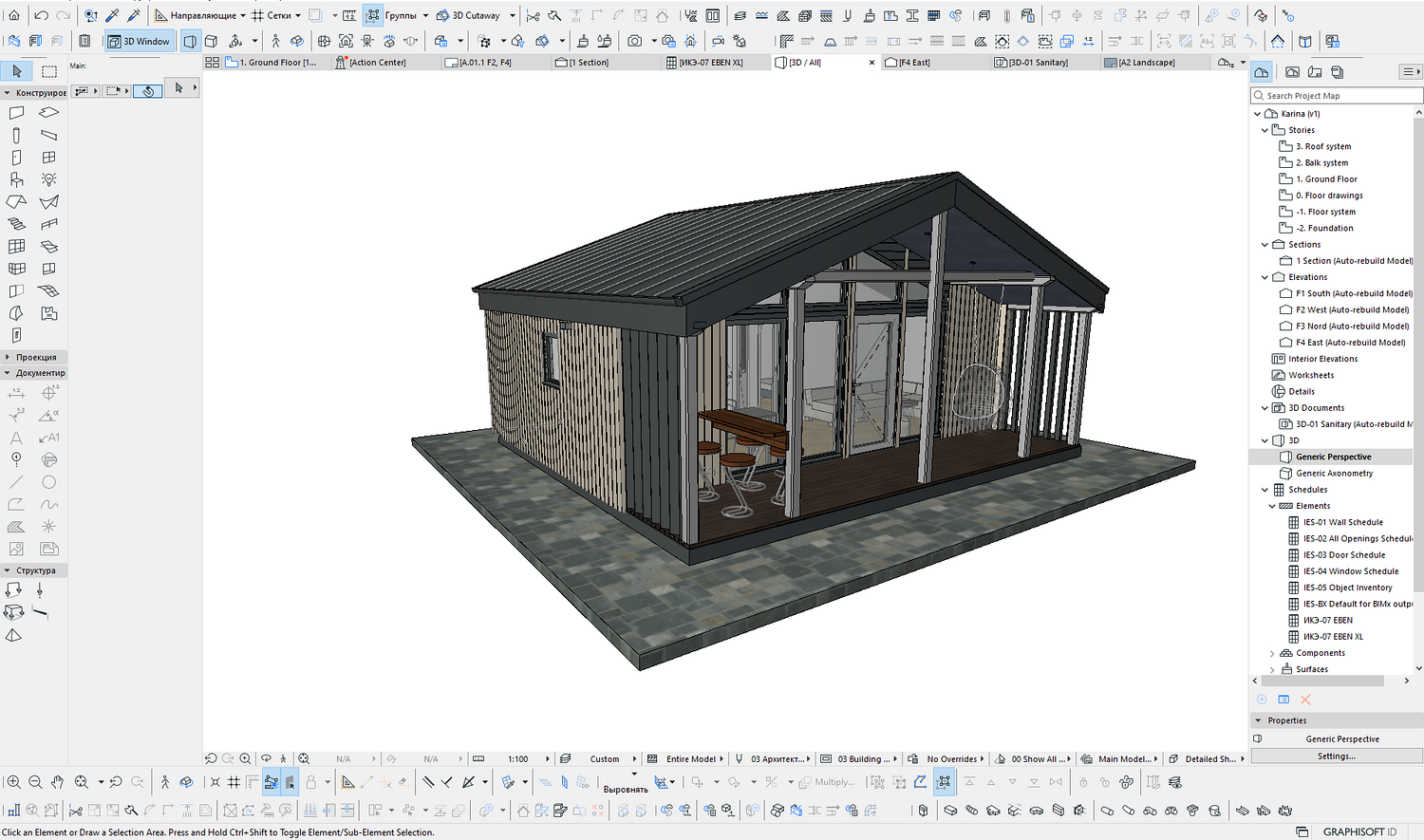 This model measures 6300 x 7460 mm and is designed for two people. The usable area is 32.4 m2. The terrace is 11.7 m2. It is designed for both seasonal and permanent residence. This set includes a detailed 3D model, floor plan and facades. You can build it yourself, or you can order it from us. We manufacture ready-made house kits and deliver them throughout Europe.