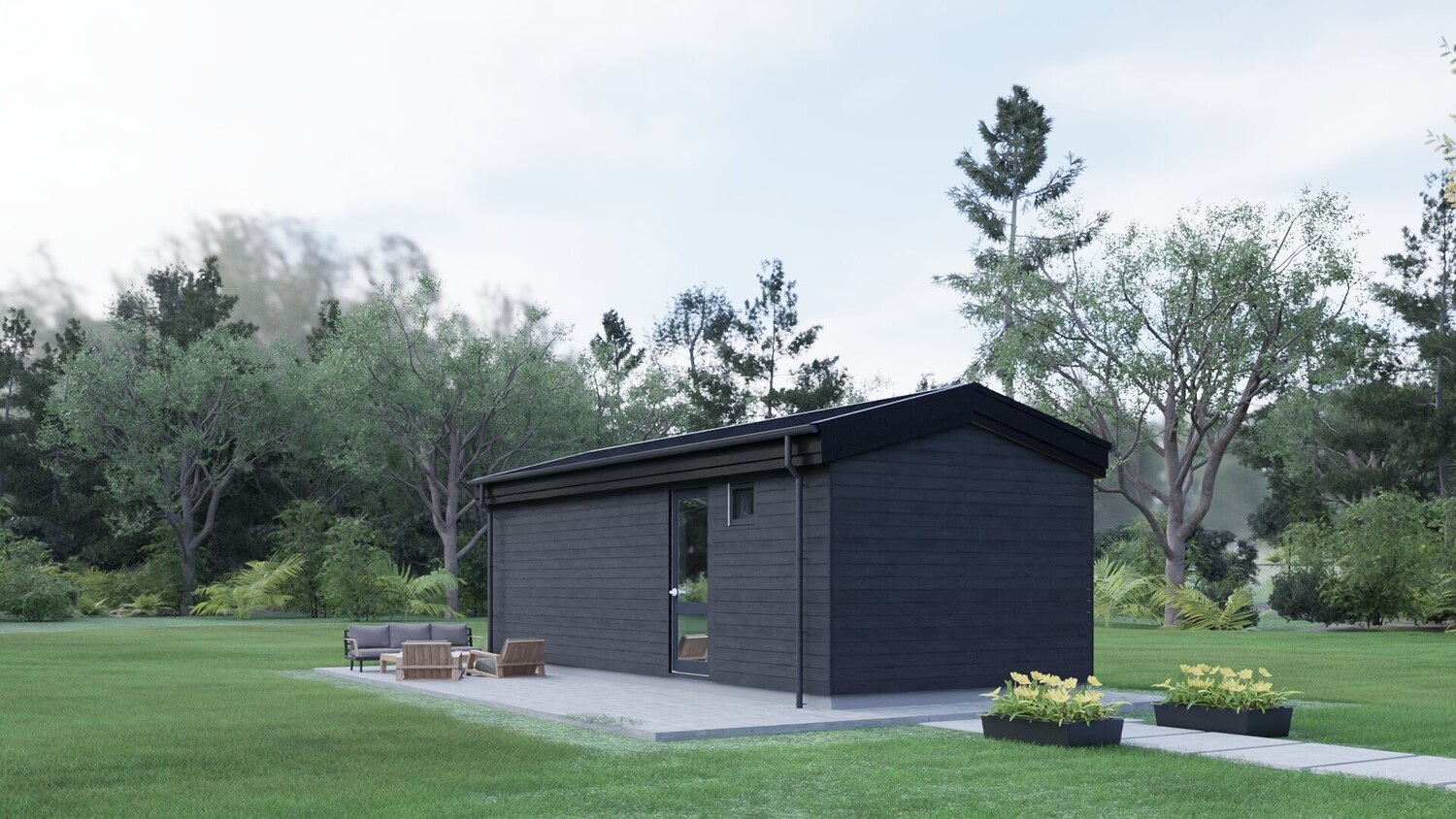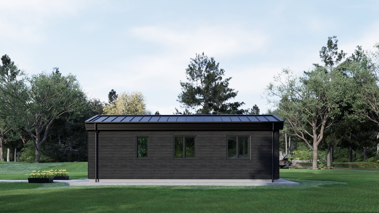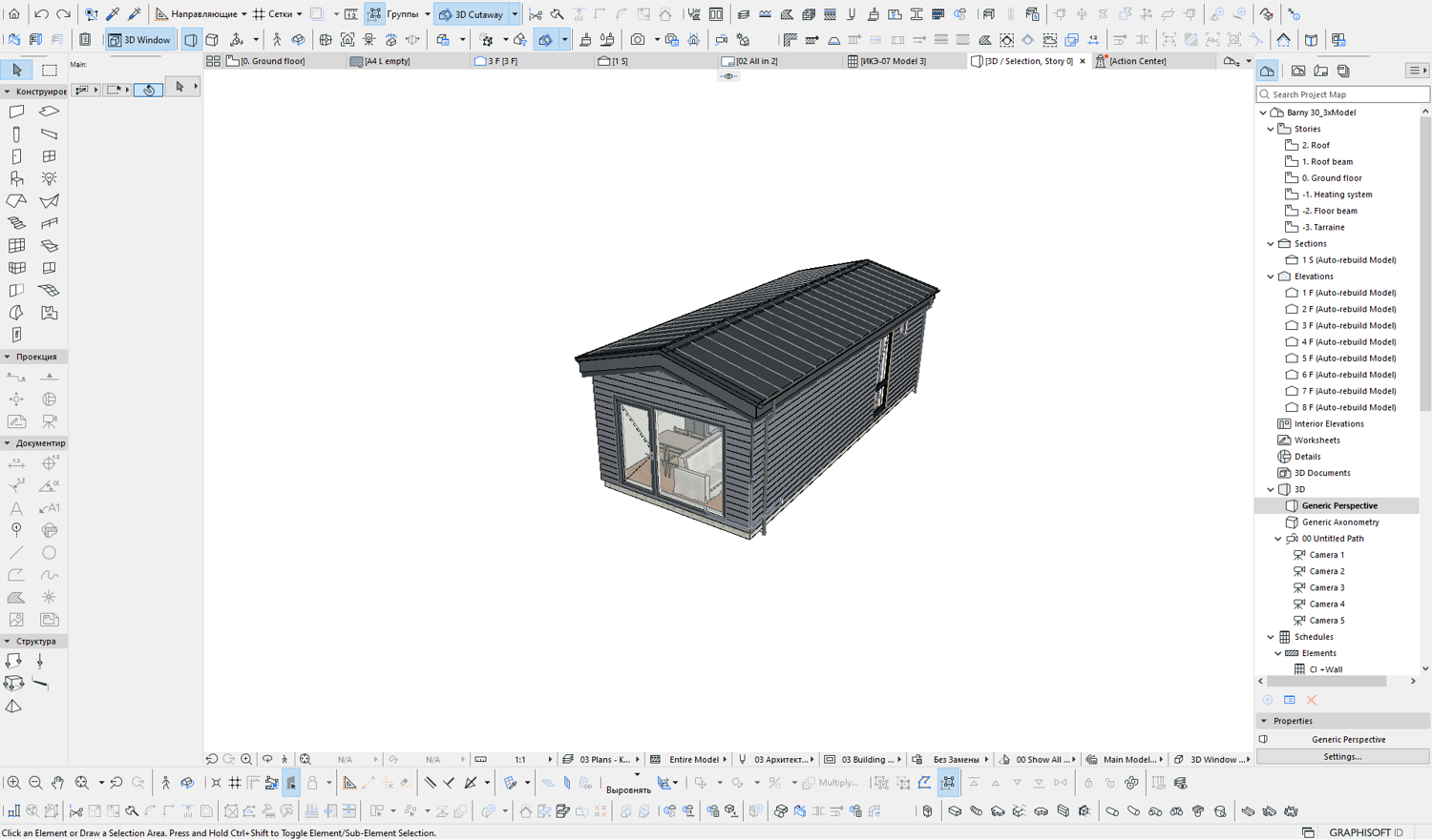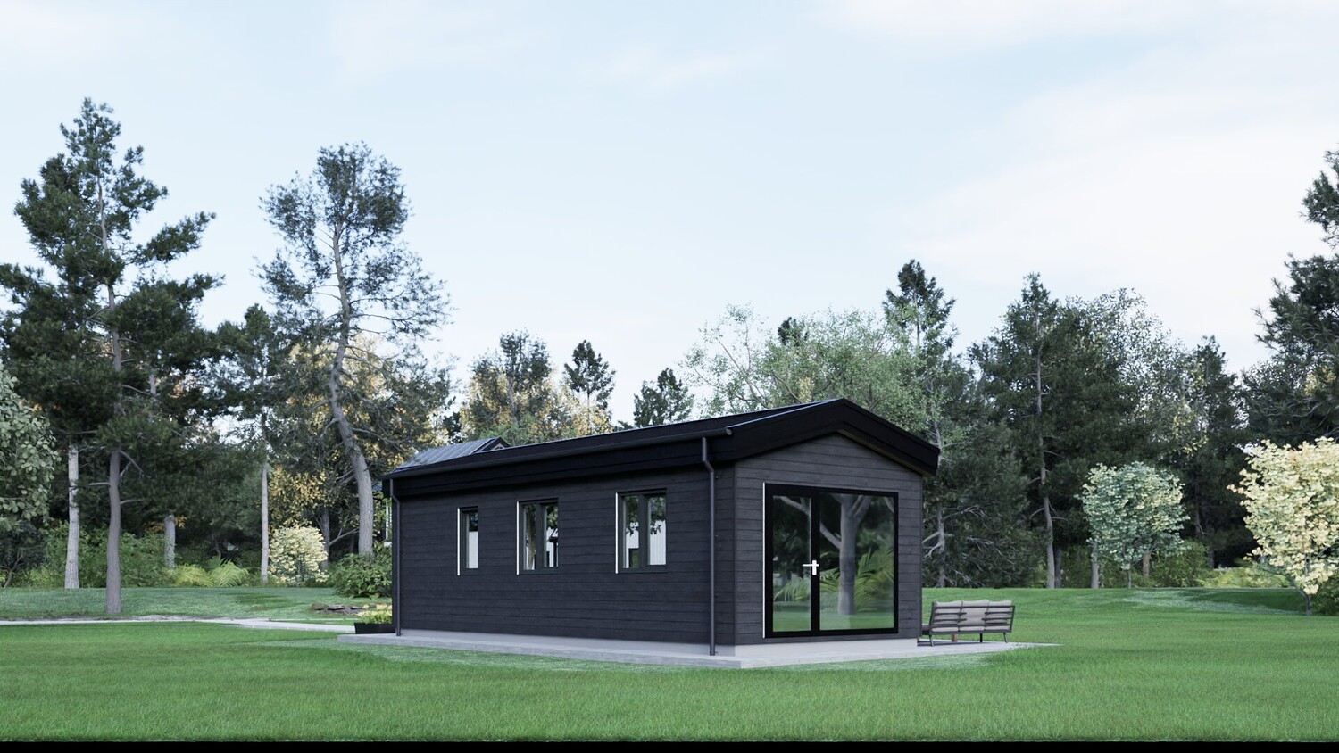 This model measures 9600 x 3890 mm and is designed for four people. The usable area is 29.8 m2. It is designed for seasonal living. I have developed a whole series of small mobile homes for camping parks. There are three well-thought-out layouts in these sizes. Model No. 1 is shown here. This set includes a detailed 3D model, floor plan and facades. The house model is designed for factory production and transportation to the installation site. You can build it yourself by ordering production drawings from me, or you can order a complete house kit from us. We manufacture ready-made house kits and deliver them throughout Europe.