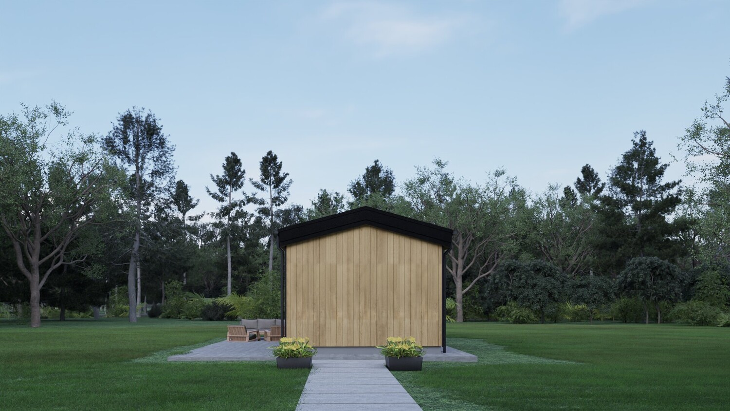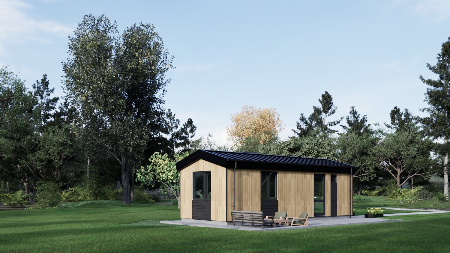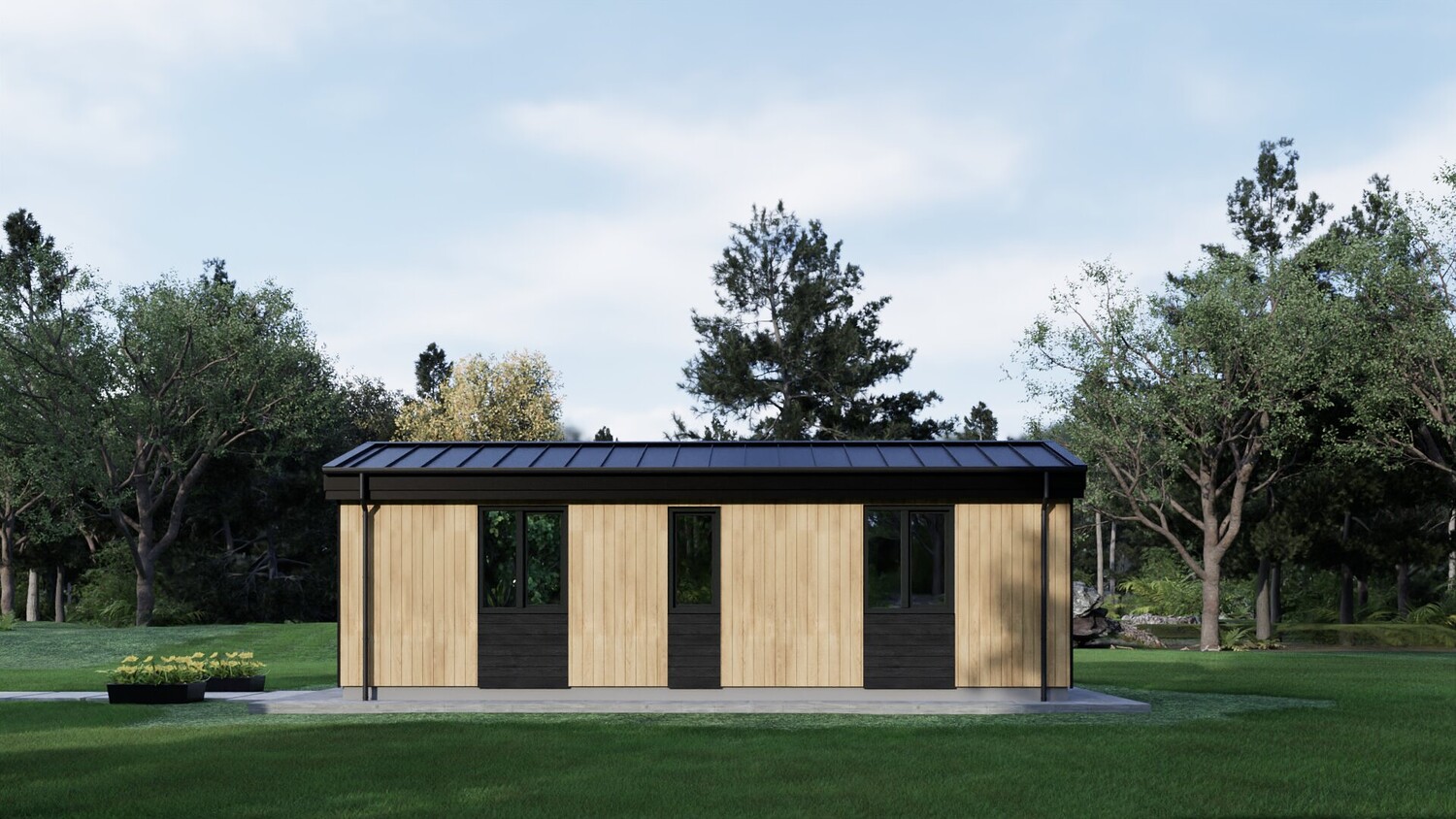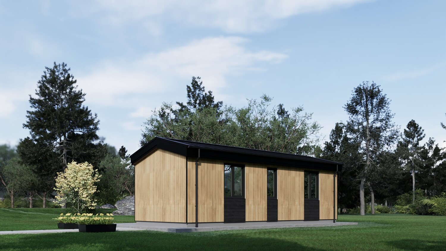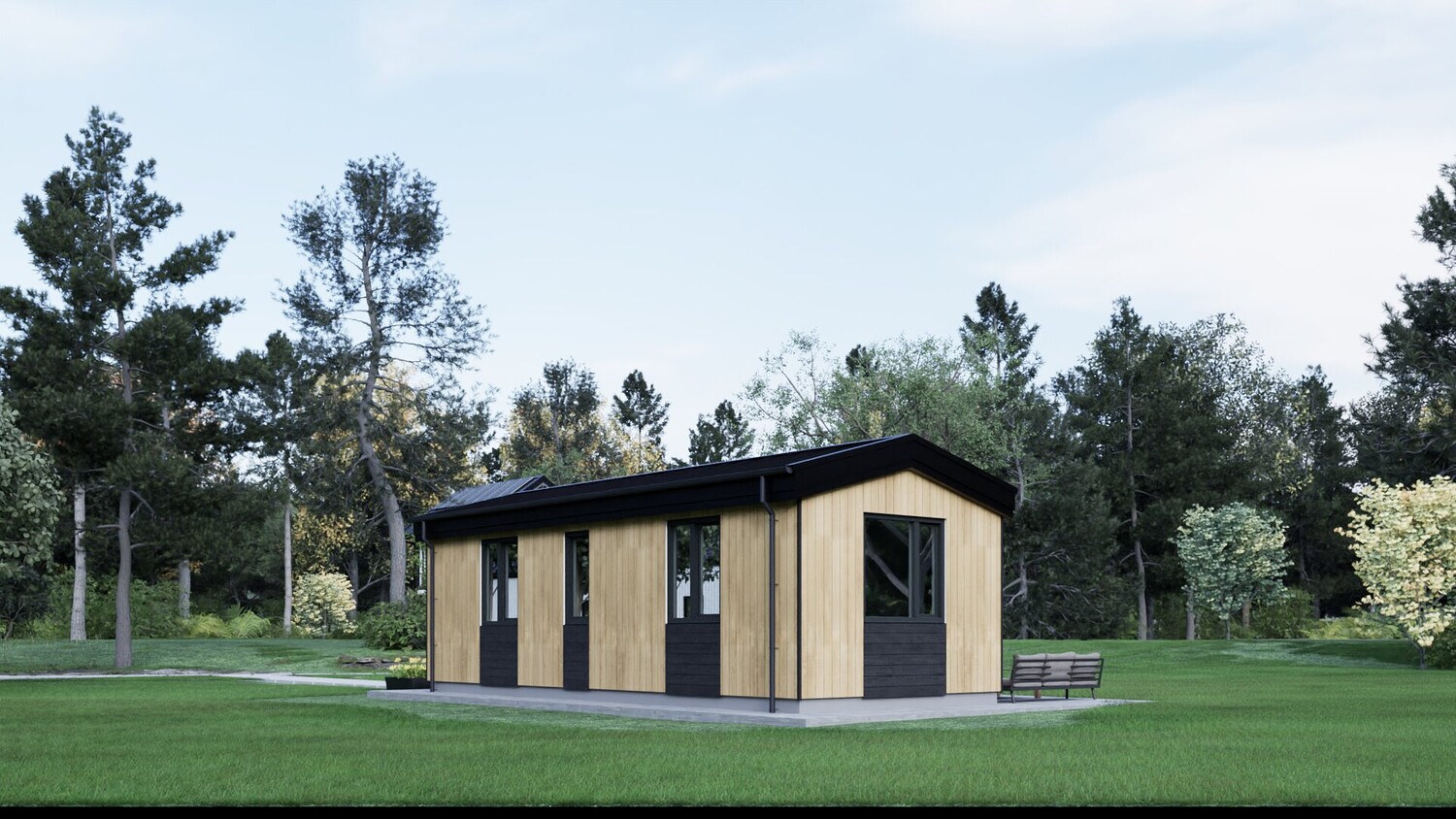 This model measures 9600 x 3890 mm and is designed for four people. The usable area is 29.8 m2. It is designed for seasonal living. I have developed a whole series of small mobile homes for camping parks. There are three well-thought-out layouts in these sizes. Model No. 2 is shown here. This set includes a detailed 3D model, floor plan and facades. The house model is designed for factory production and transportation to the installation site. You can build it yourself by ordering production drawings from me, or you can order a complete house kit from us. We manufacture ready-made house kits and deliver them throughout Europe.