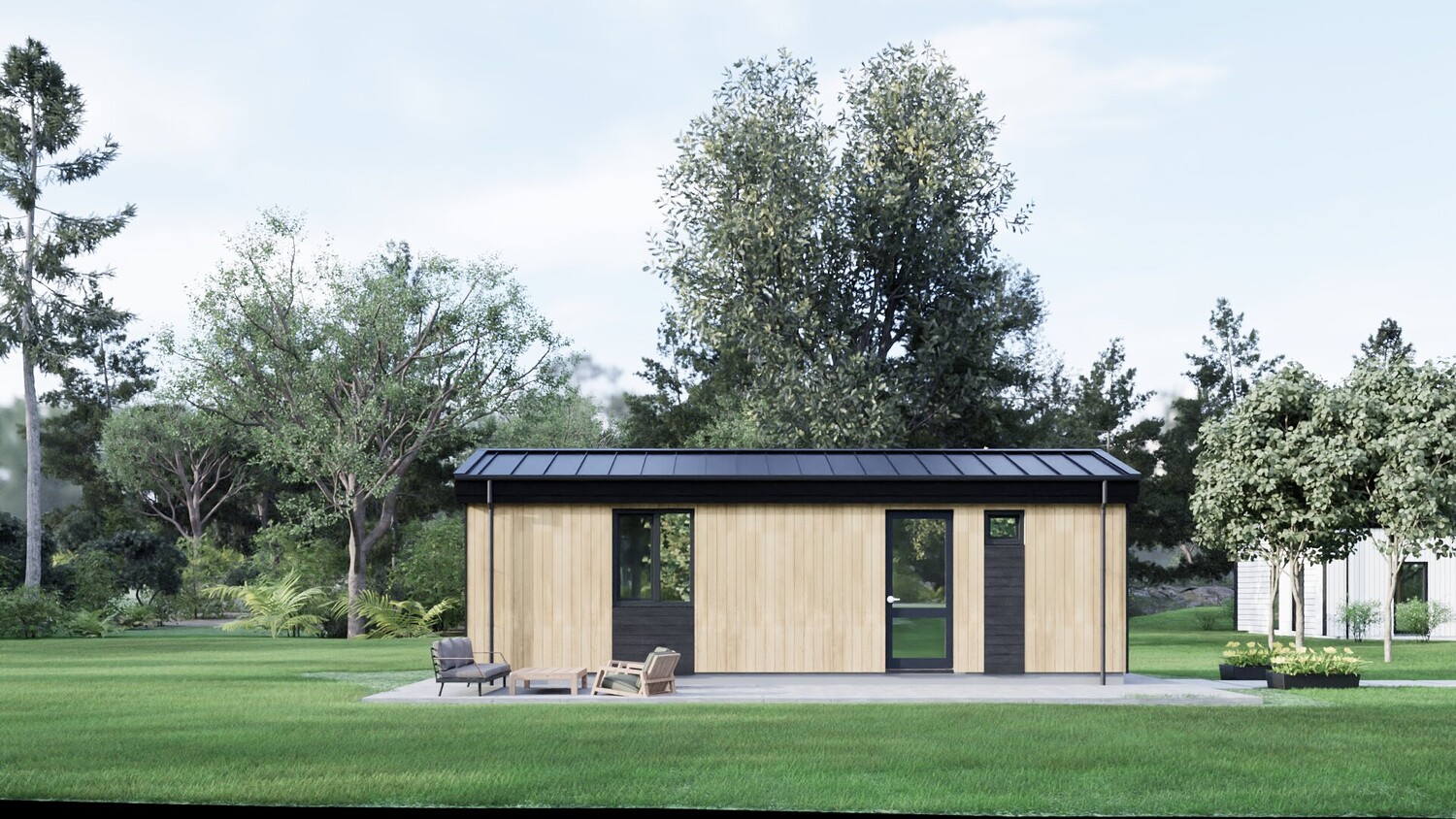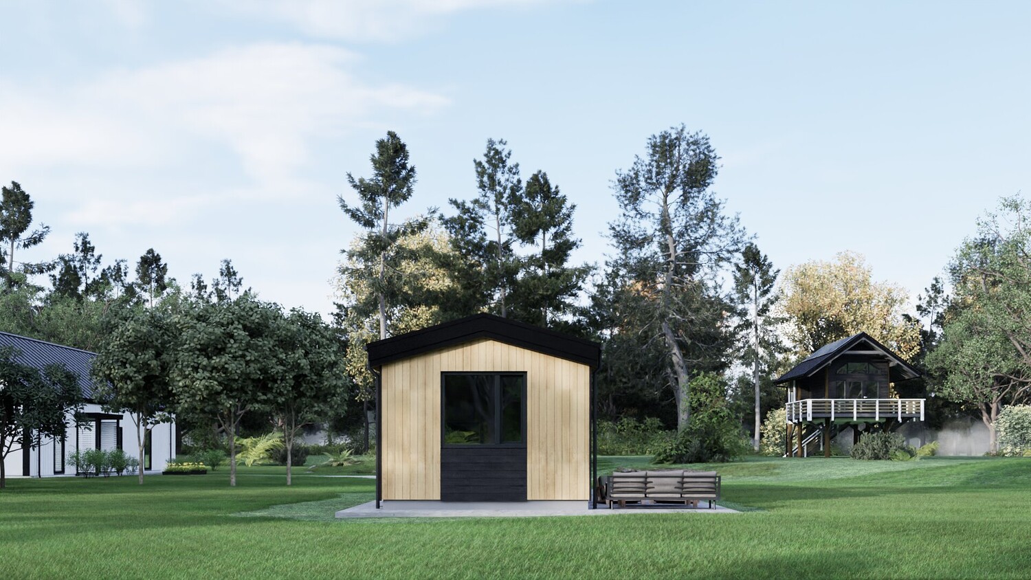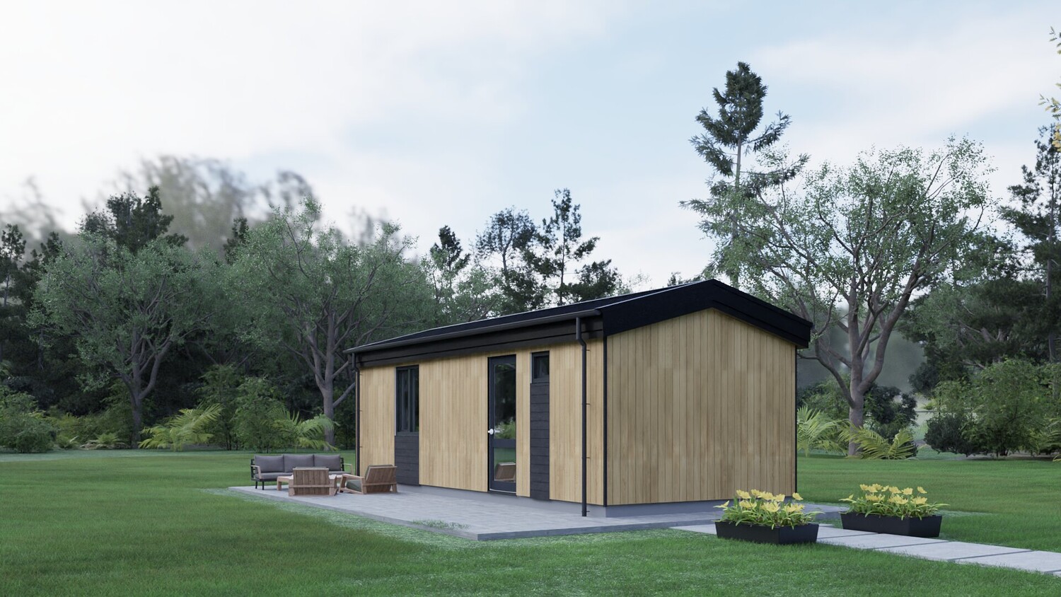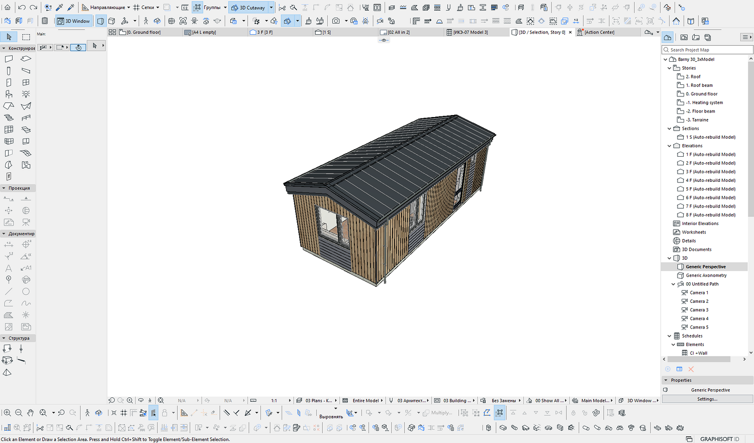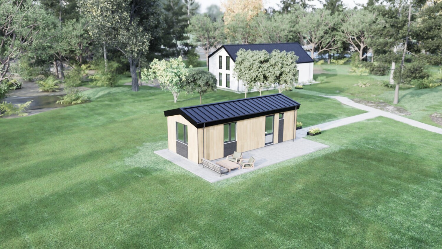 This model measures 9600 x 3890 mm and is designed for four people. The usable area is 29.8 m2. It is designed for seasonal living. I have developed a whole series of small mobile homes for camping parks. There are three well-thought-out layouts in these sizes. Model No. 2 is shown here. This set includes a detailed 3D model, floor plan and facades. The house model is designed for factory production and transportation to the installation site. You can build it yourself by ordering production drawings from me, or you can order a complete house kit from us. We manufacture ready-made house kits and deliver them throughout Europe.