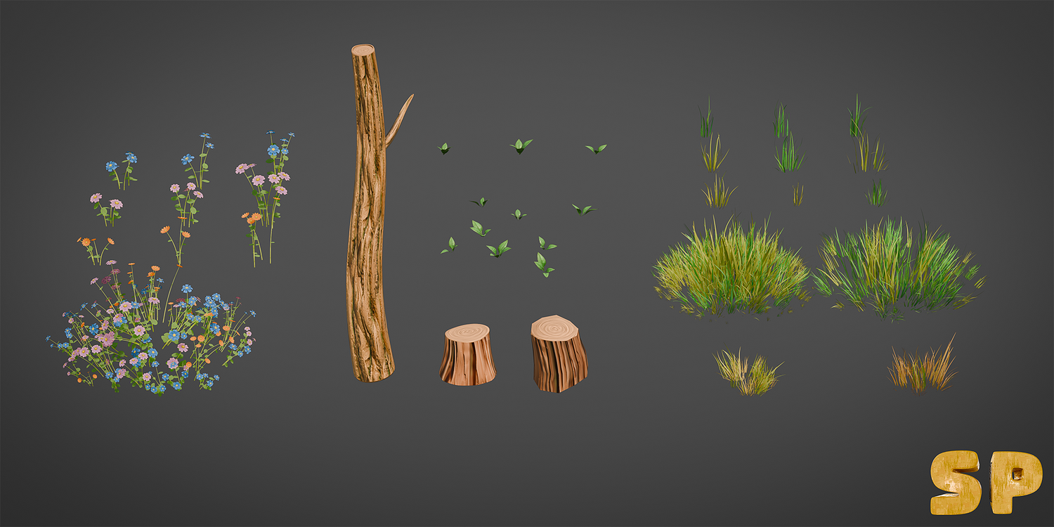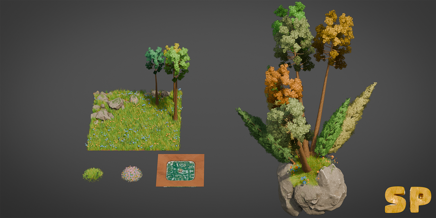 The system is fully non-destructive and modular, allowing you to build large environments quickly while maintaining fine control over density, scale, slope, and seasonal appearance. Assets are designed to be low-poly and game-ready, making the pack ideal for real-time projects, while still supporting higher-quality close-up renders when needed.