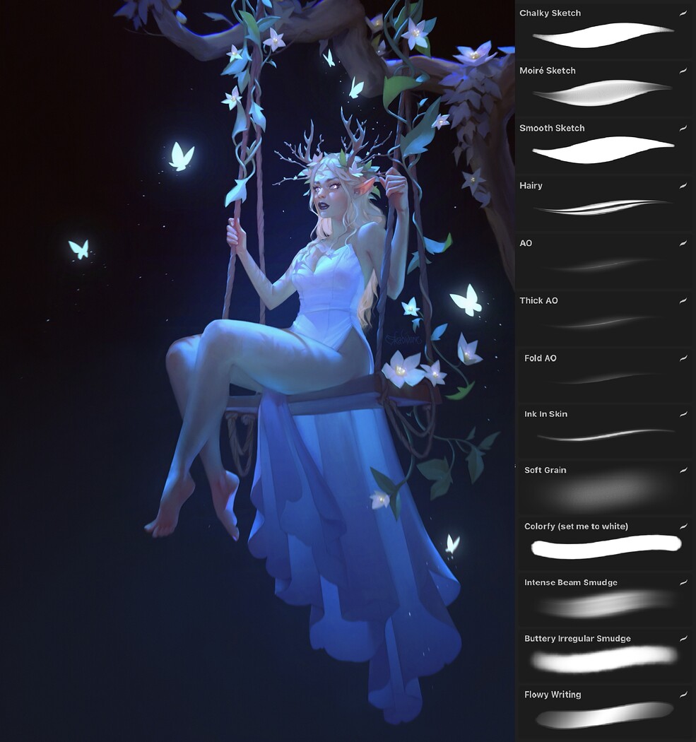 This set includes 13 custom brushes for sketching, shading (like ambient occlusio) and smudging. It combines textured pencils (like Chalky and Moiré Sketch), clean lines (Smooth Sketch, flowy writing), layered shading (AO, Fold AO, Thick AO), and specialized tools like Ink In Skin with a soft bleed for a tattoo look on skinor glowing lines and Colorfy (for changing bright color effects when set to white) that I use as an overlay (set to „saturation“ in blending modes for creating iridescence in my pieces. The smudge brushes include Intense Beam and Buttery Irregular, made to handle both painterly or smooth blending for different materials and light beams. They are for getting the most out of digital painting with less focus on a traditional look but to have a cleaner and crisper look. I hope you enjoy them!
