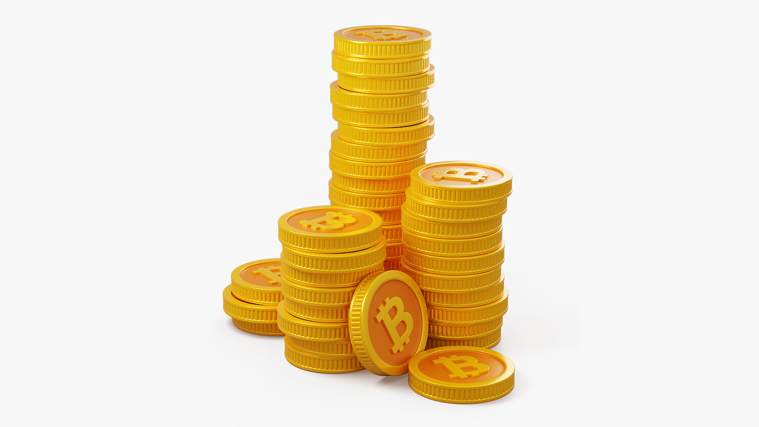 This is a stylized 3D coin stack designed in a cartoon style, featuring three currency symbol variations: Bitcoin (₿), Dollar ($), and Euro (€). Each version presents glossy gold coins with embossed signs, arranged in playful stacks ideal for casual games, mobile UI, financial icons, or educational scenes. The model is crafted with clean geometry and bright, saturated colors to suit stylized environments and economic themes.