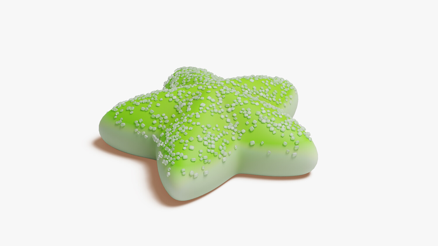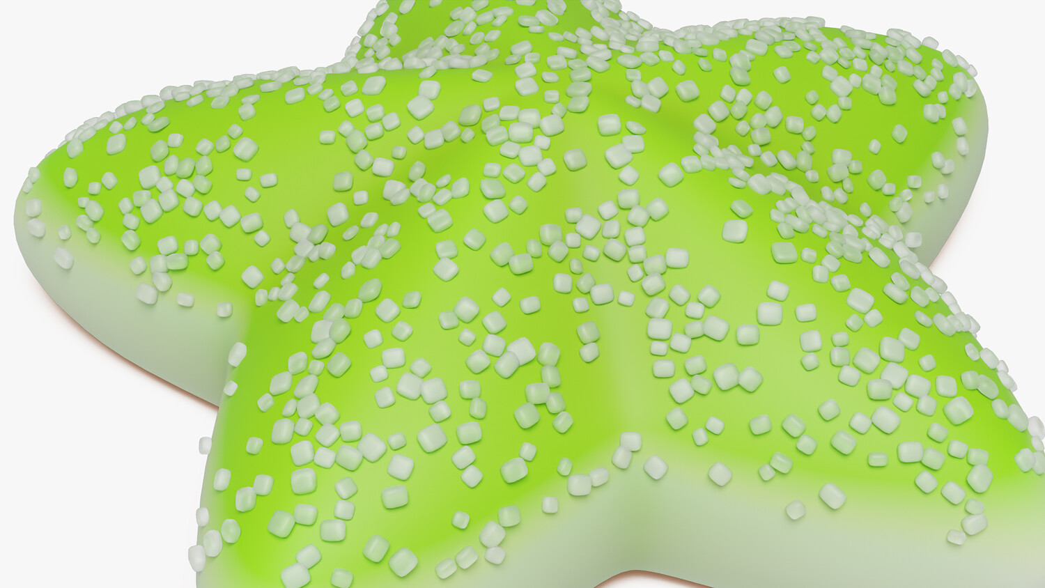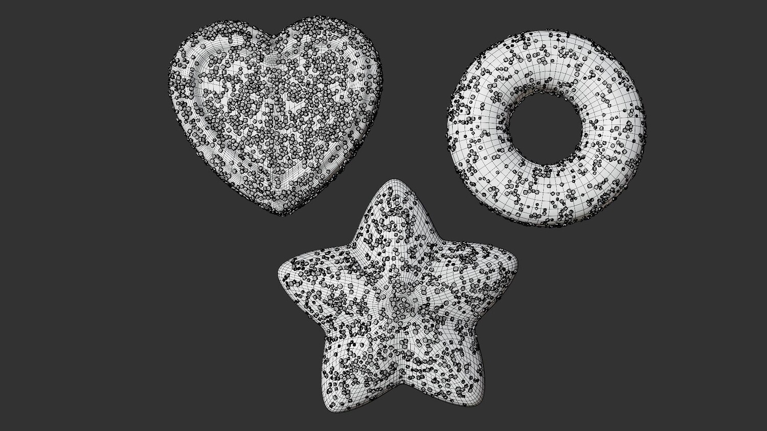 This 3D sugar candy set is designed in a playful and colorful cartoon style, featuring bright shapes sprinkled with tiny sugar crystals for extra detail and realism. The collection includes three variations: a red heart with a white outline, an orange-yellow ring, and a green star. Each piece has a glossy surface, rounded edges, and a vibrant finish, giving them a fun and appetizing appearance.