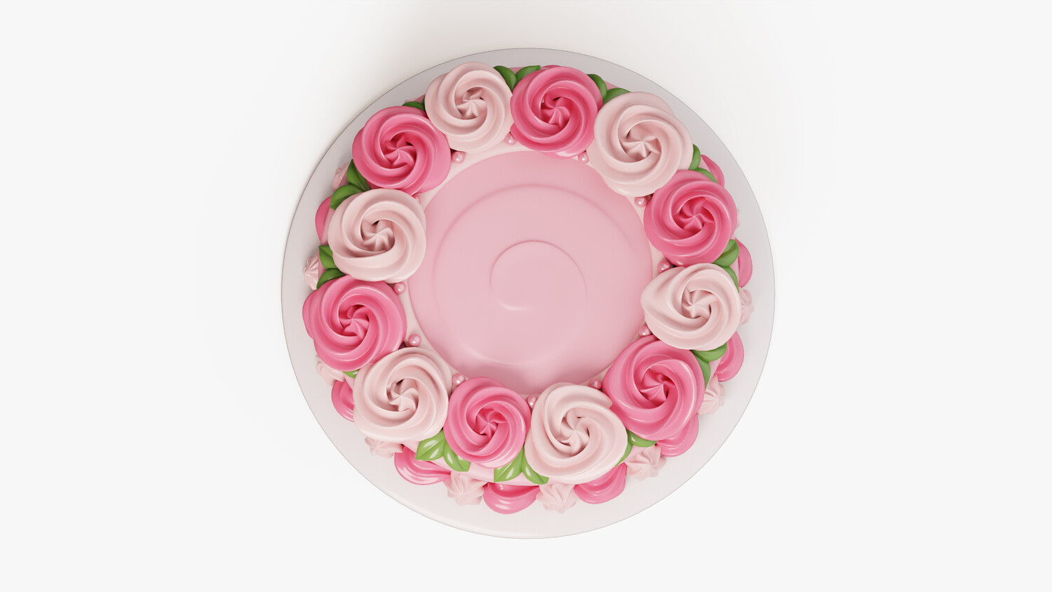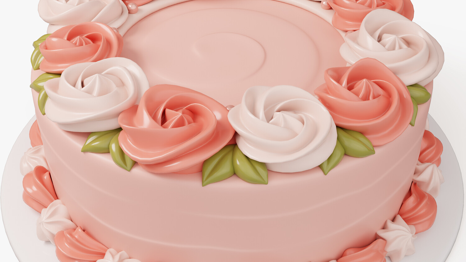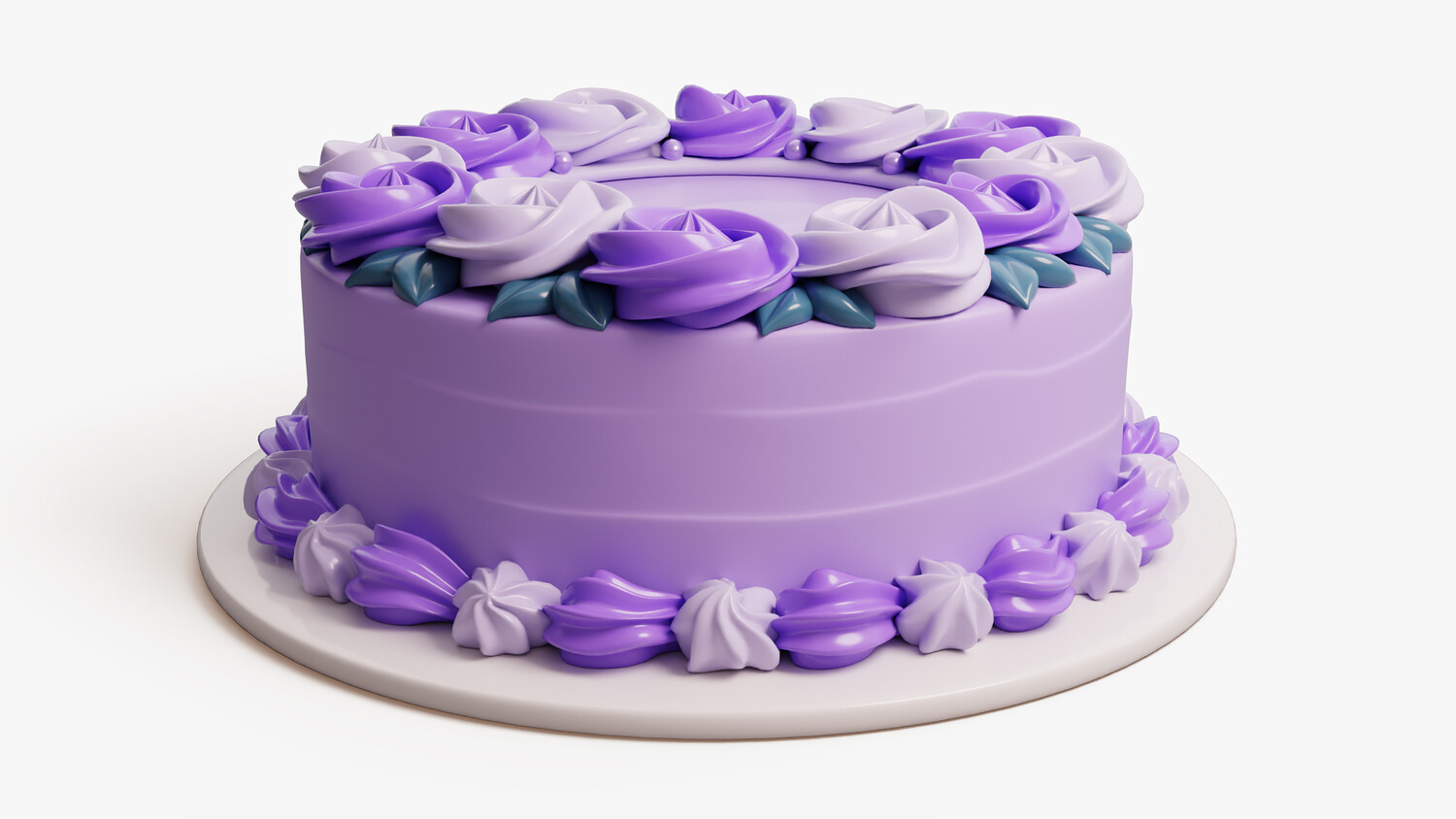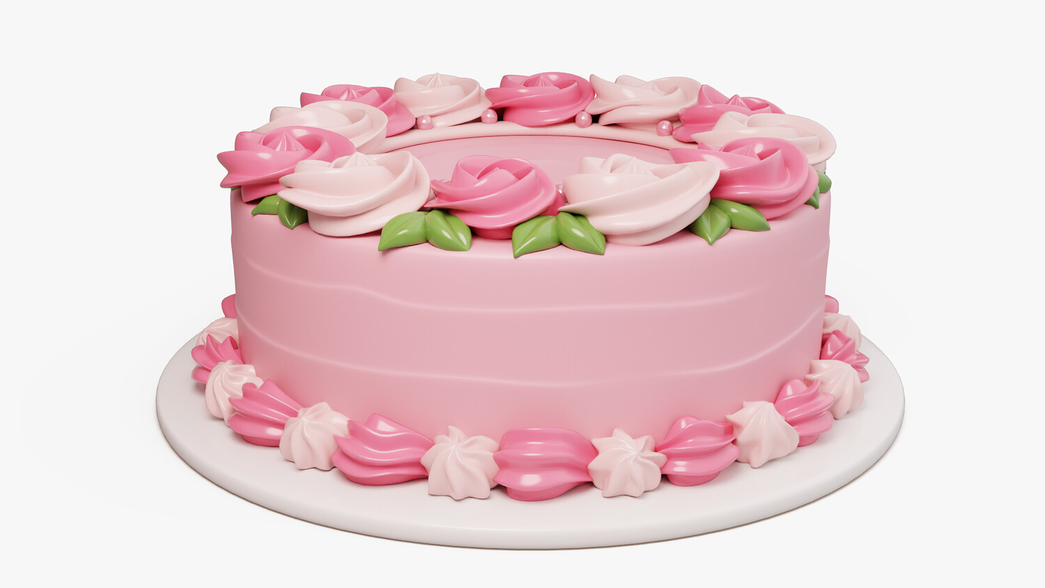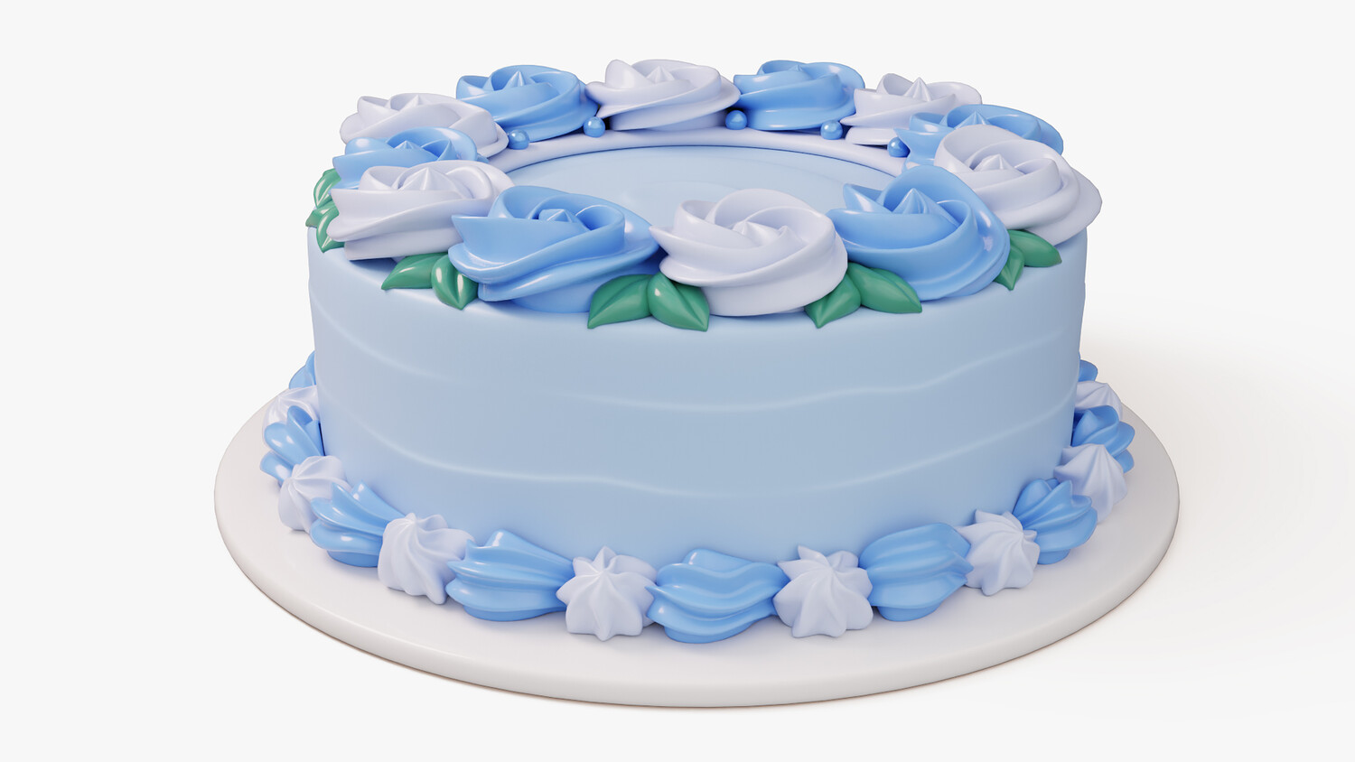 This 3D flower cake set features four beautifully decorated cakes in a glossy cartoon style. Each cake is designed with smooth layers, creamy textures, and delicate floral decorations arranged around the top. The pack includes cakes in different pastel color variations: pink with rose flowers, blue with cream swirls, purple with lilac roses, and peach with soft decorative cream. The floral elements add a festive and elegant touch, making the cakes look both playful and sophisticated.