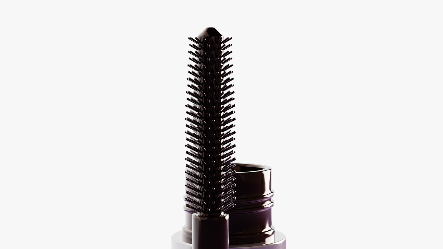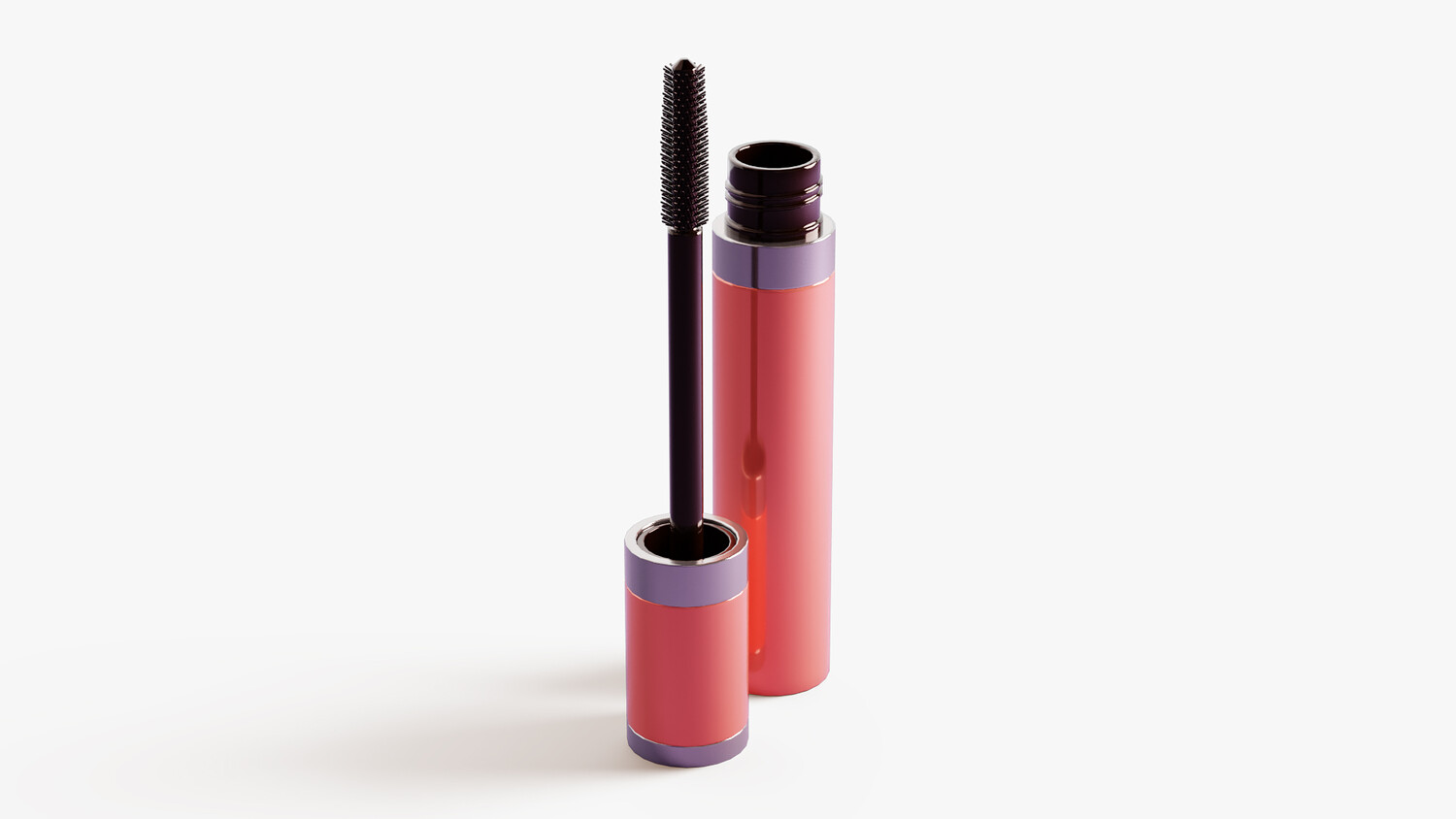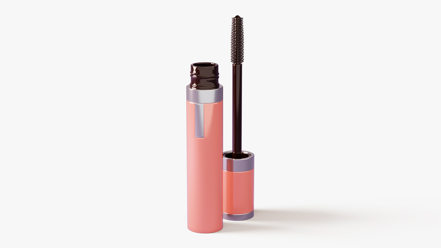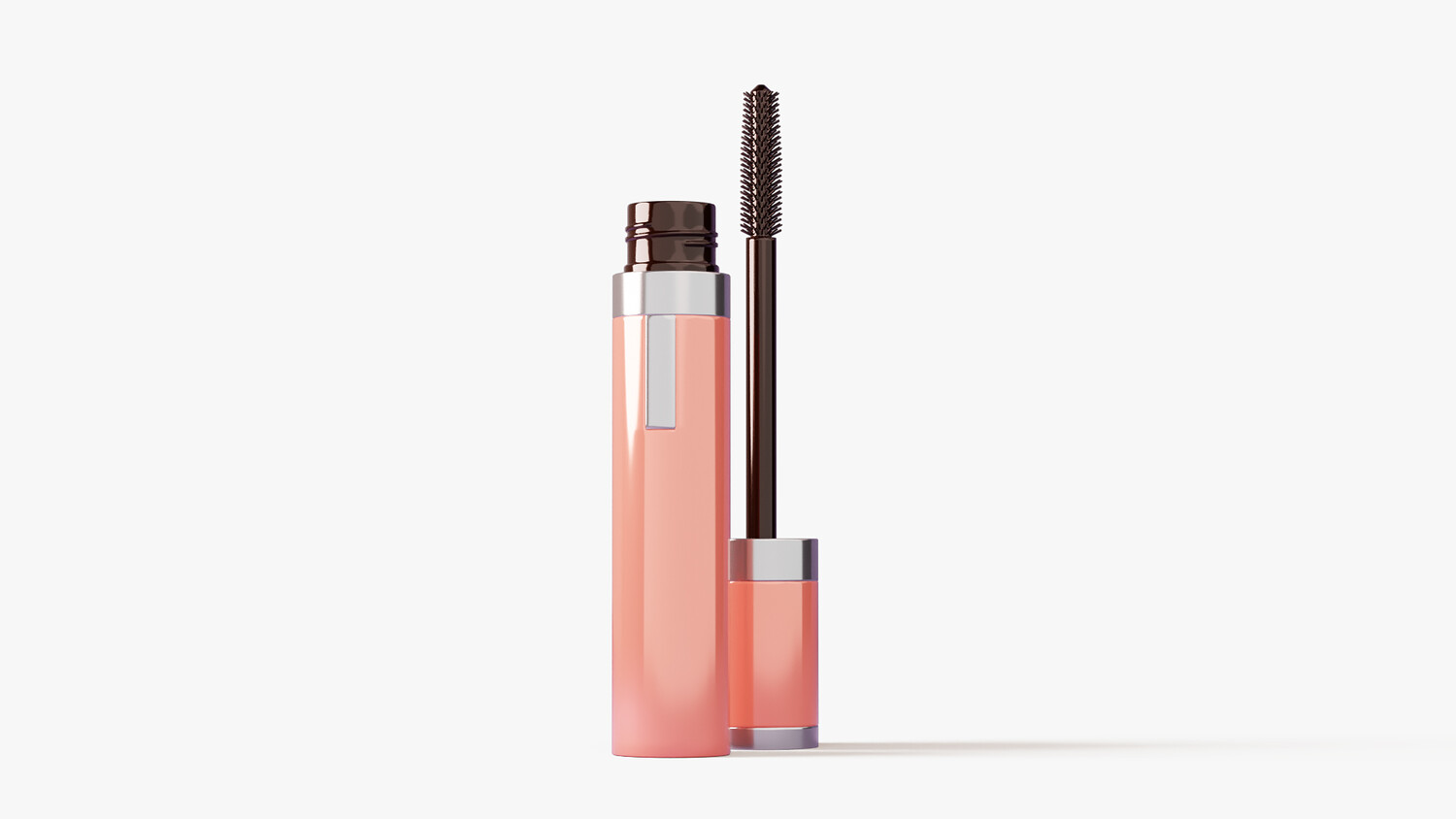Glossy peach-pink mascara tube with silver accents, shown open to reveal a slim wand and fine elastomer bristles for precise lash coating. A small side window hints at the product inside, while clean studio lighting highlights reflections and form. Perfect for cosmetics branding, packaging mockups, ads, ecommerce banners, tutorials, and UI icons. Works for lengthening, volumizing, or waterproof mascara concepts across beauty and makeup themes.