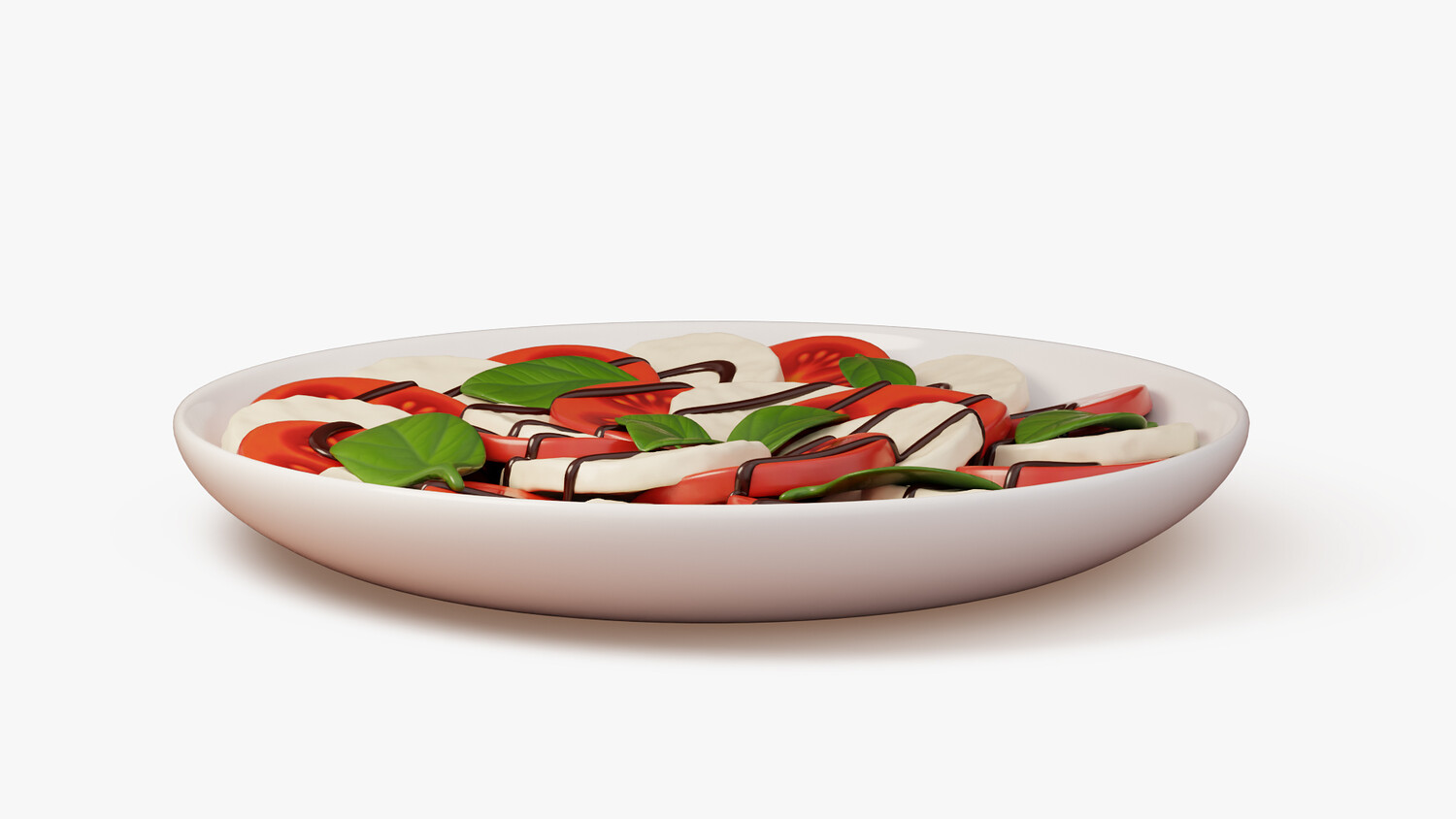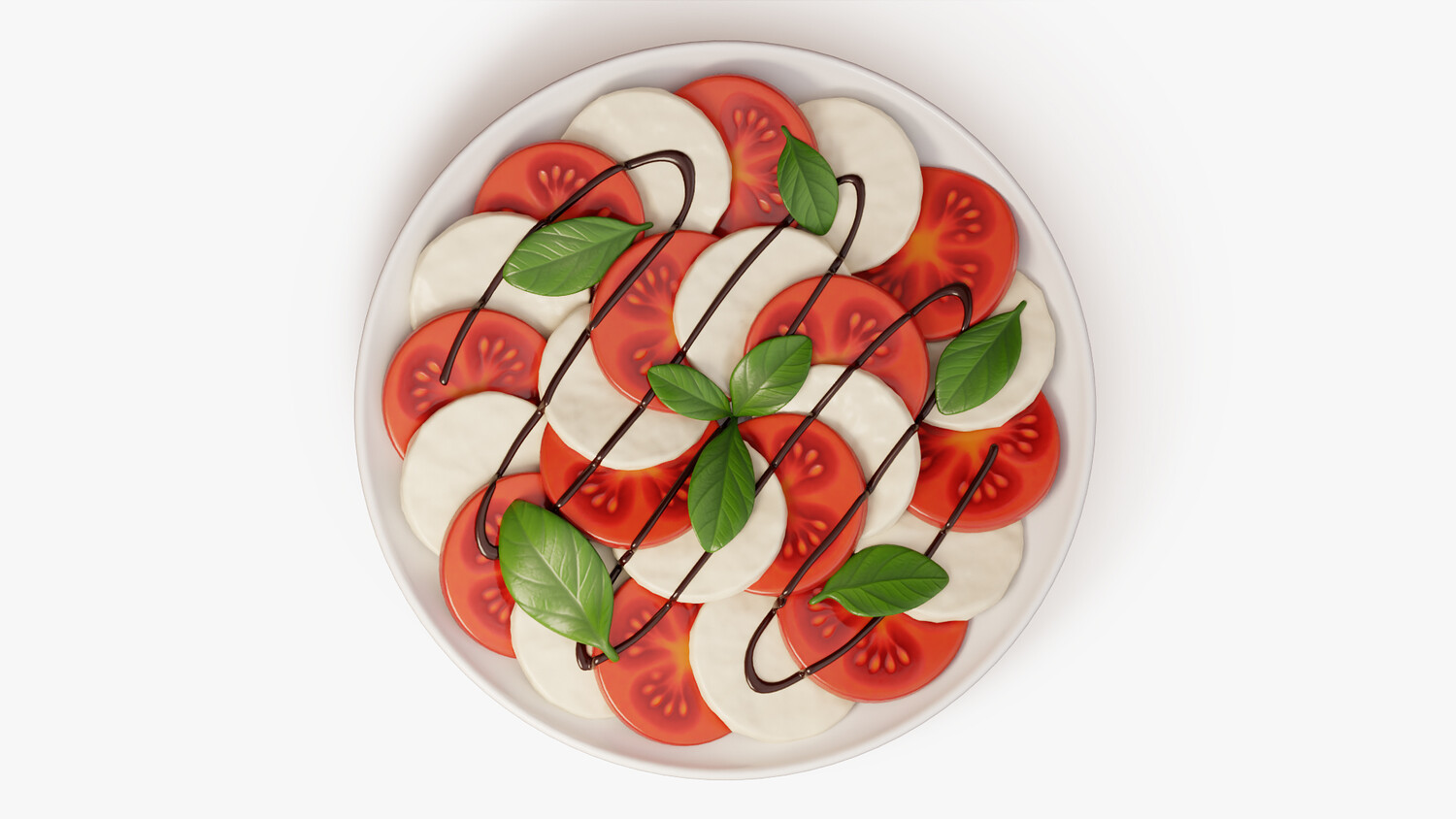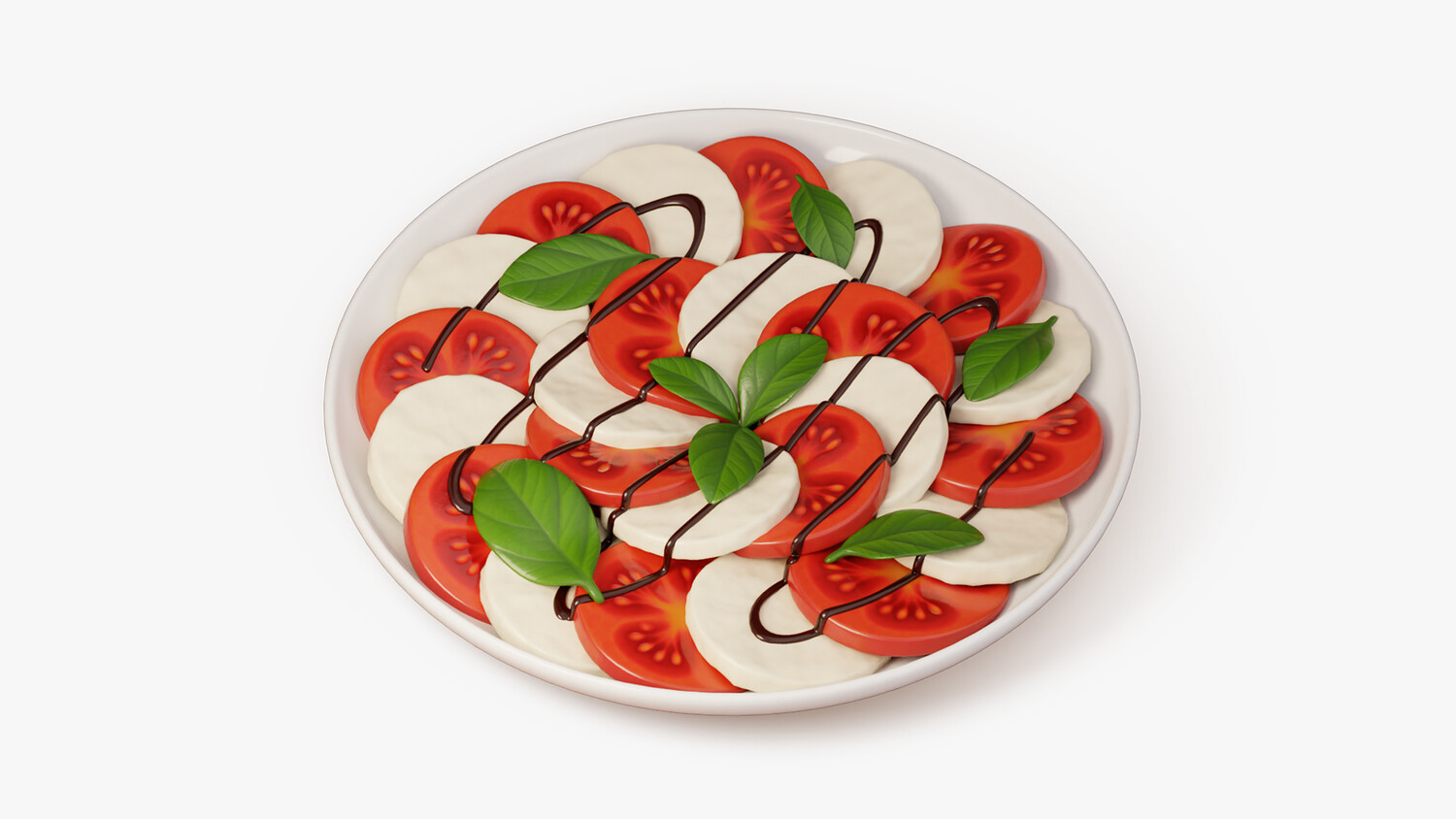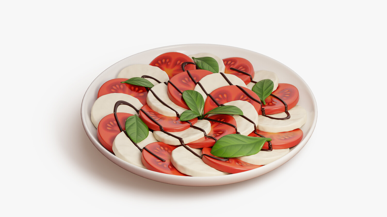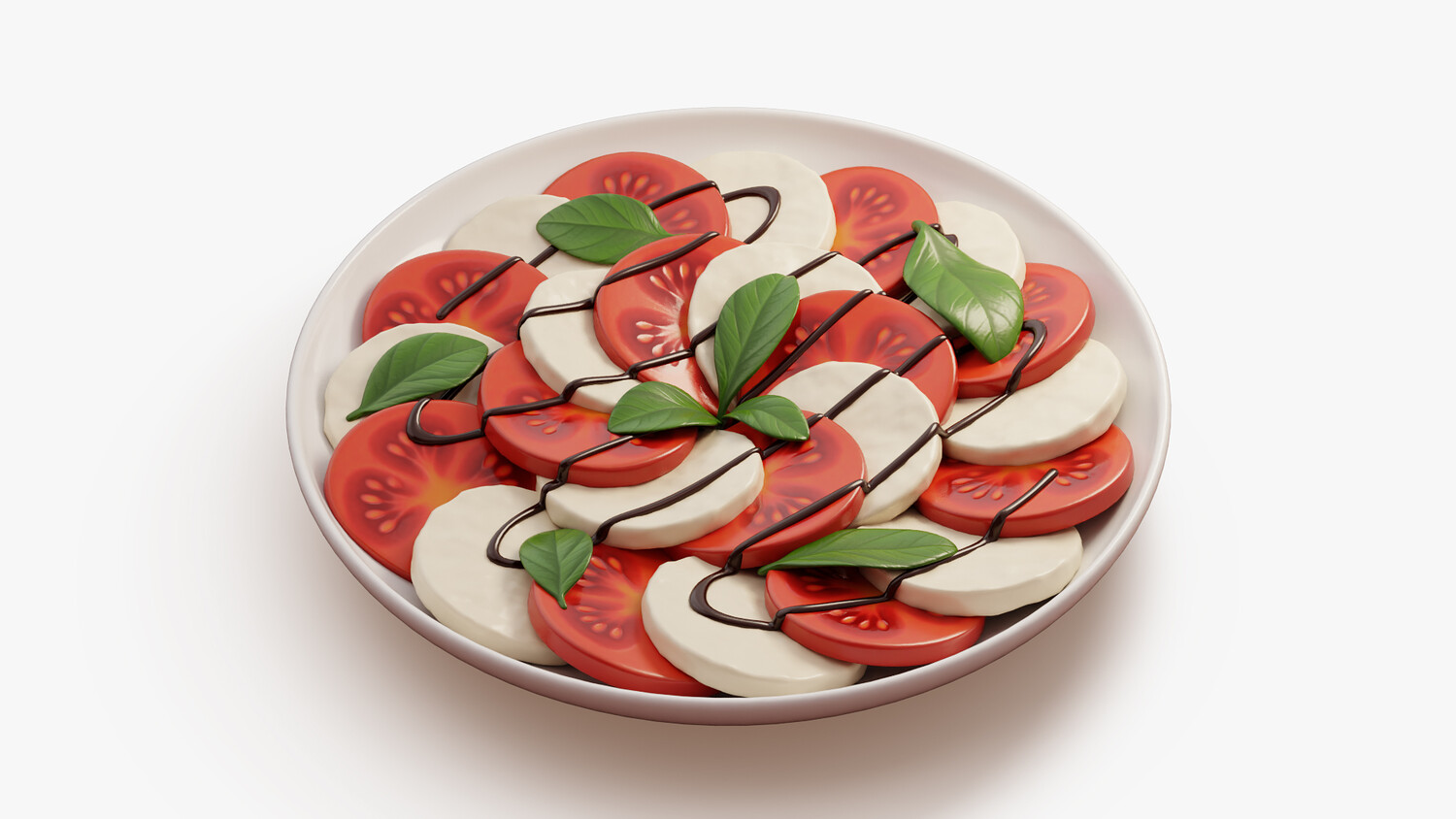 Realistic caprese salad arrangement with alternating slices of ripe red tomato and soft white mozzarella neatly layered on a round white plate. Fresh green basil leaves are placed on top for a bright color contrast, while a dark balsamic-style dressing is artistically drizzled across the surface, adding a gourmet feel. The composition is clean, appetizing, and visually balanced, making it ideal for projects related to Italian cuisine, Mediterranean food, healthy eating, or restaurant branding. This illustration works well for menu design, recipe blogs, food delivery apps, cooking tutorials, social media posts, and promotional banners. The simple white background keeps the focus on the colorful ingredients and makes the dish easy to integrate into different layouts. Perfect for any visual project where you need an elegant, fresh, and appetizing Italian salad centerpiece.