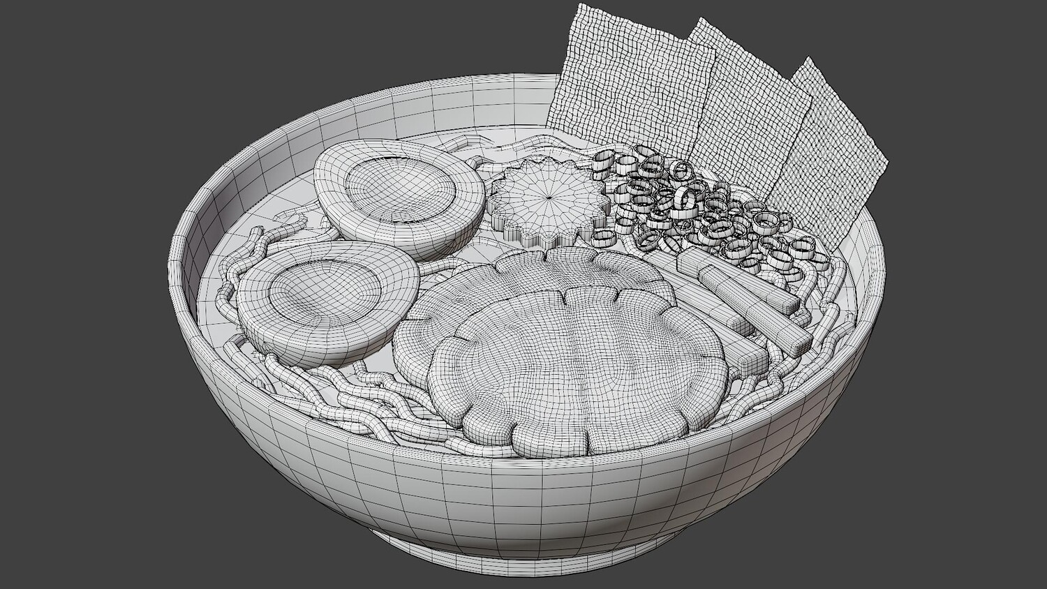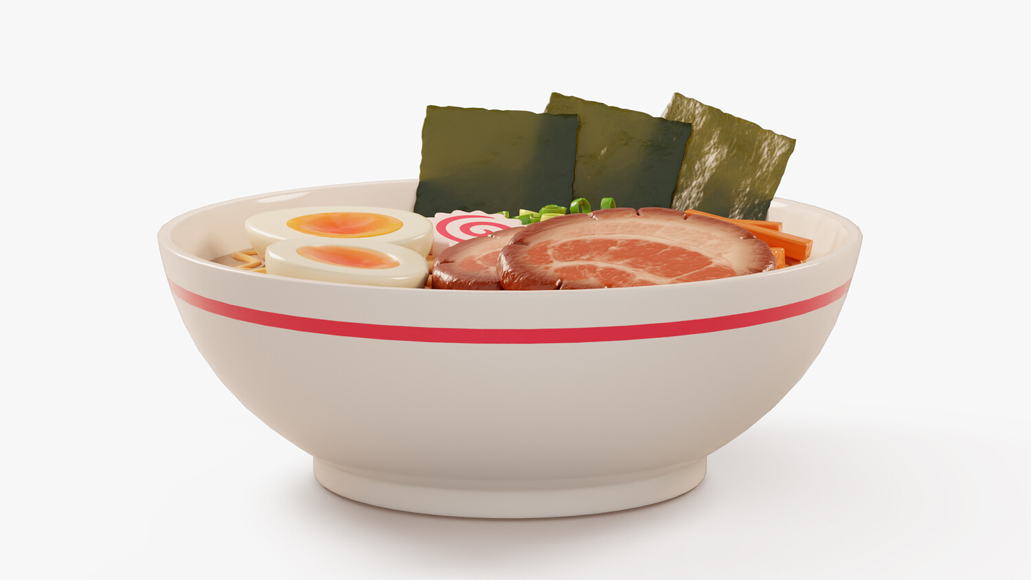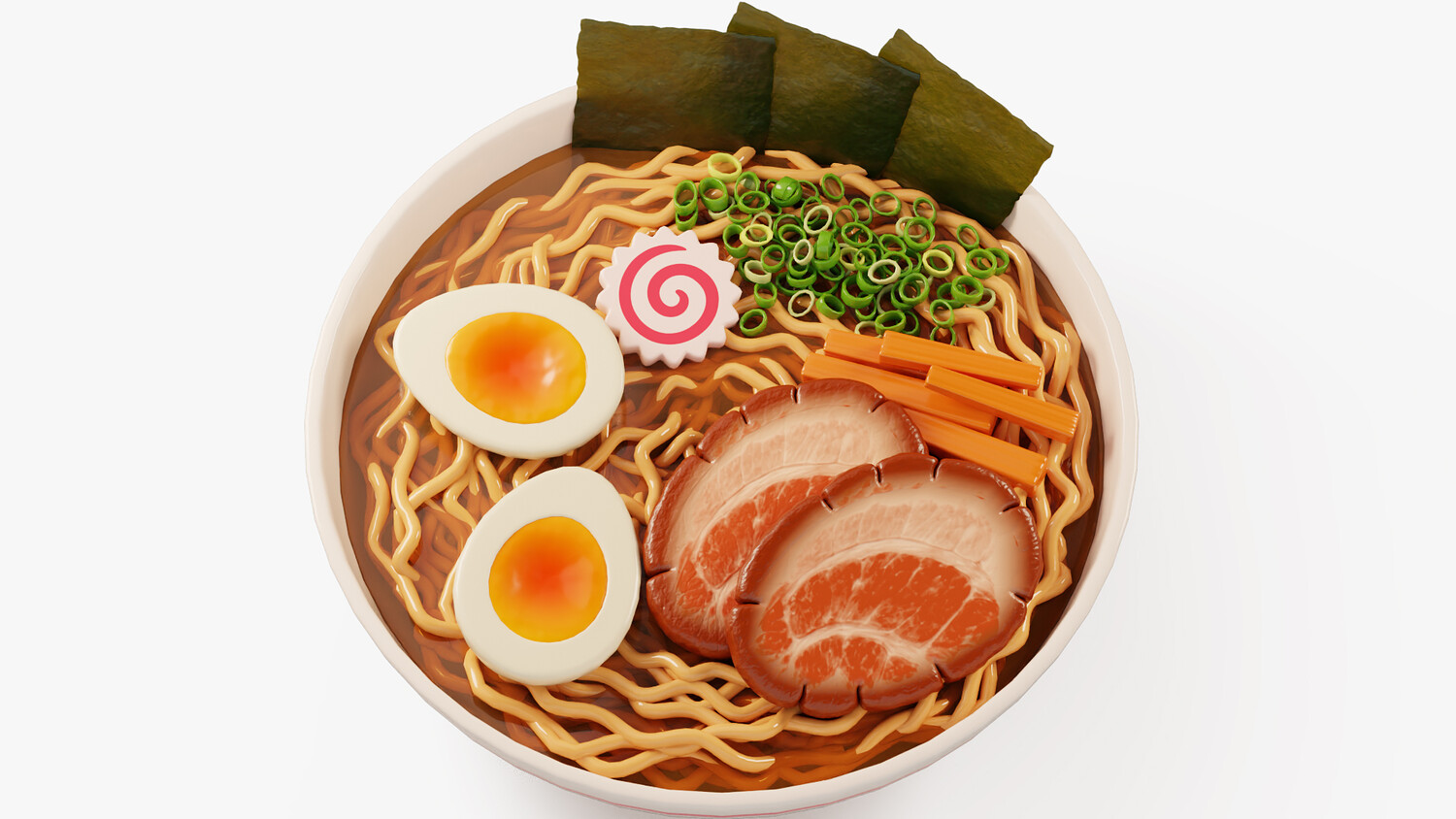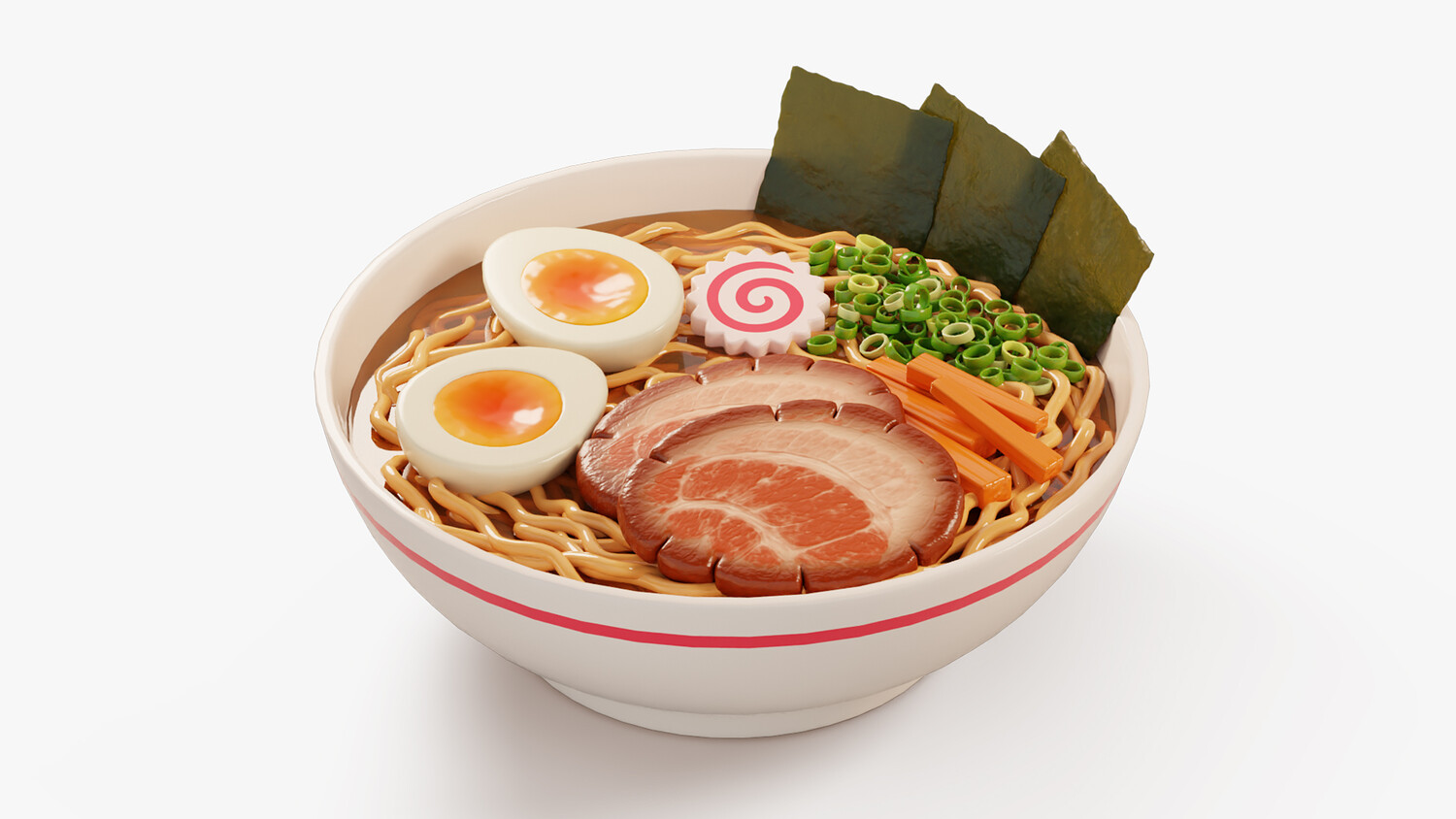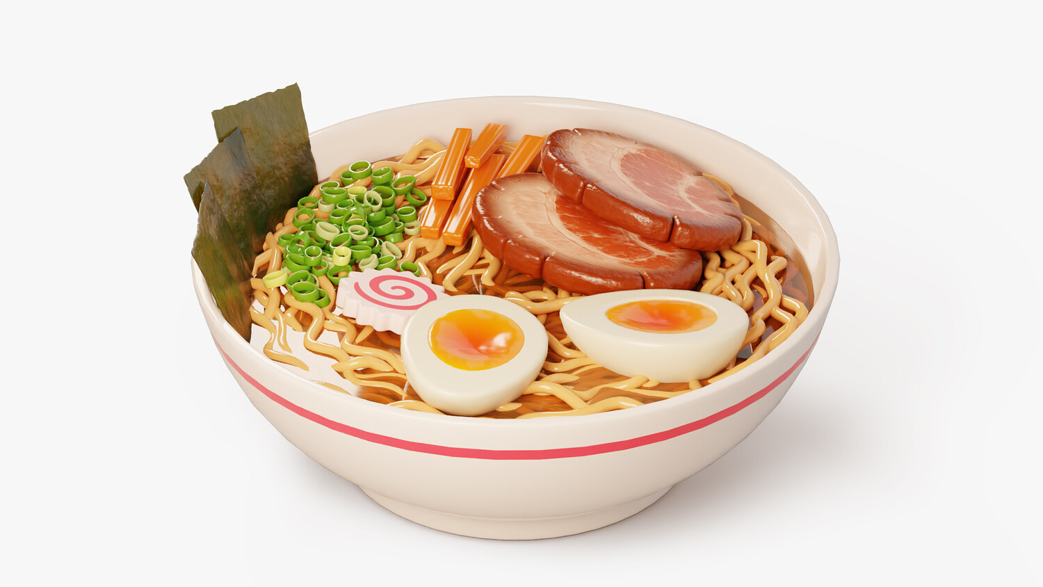 Stylized cartoon 3D model of a ramen bowl with curly noodles in rich broth and classic toppings: chashu pork slices, soft boiled egg halves, narutomaki fish cake, nori sheets, chopped green onion, and bamboo shoots. Clean simplified forms, glossy highlights, and soft gradients make the dish look appetizing and easy to read in any lighting. Perfect for Japanese cuisine scenes, restaurant and cafe visuals, menu presentations, food delivery graphics, and cozy kitchen or dining renders. Use it as a hero food item on a table scene, a centerpiece for Asian food collections, or a standalone object for thumbnails, product mockups, and animations. The recognizable ingredients and strong silhouette help it fit both close ups and background placement, and it pairs well with sushi, onigiri, and soups to build a complete Japanese food set.
