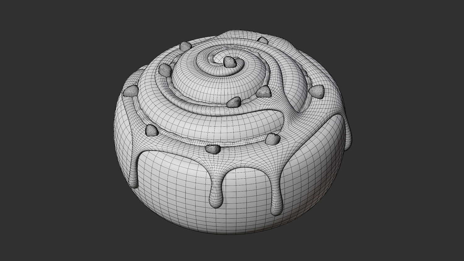 Cute and glossy 3D illustration of a stylized cinnamon roll topped with white icing and sprinkled with nuts. Perfect for food-themed designs, UI icons, casual games, or bakery promotions. Clean shapes and soft shading give it a modern cartoon aesthetic.