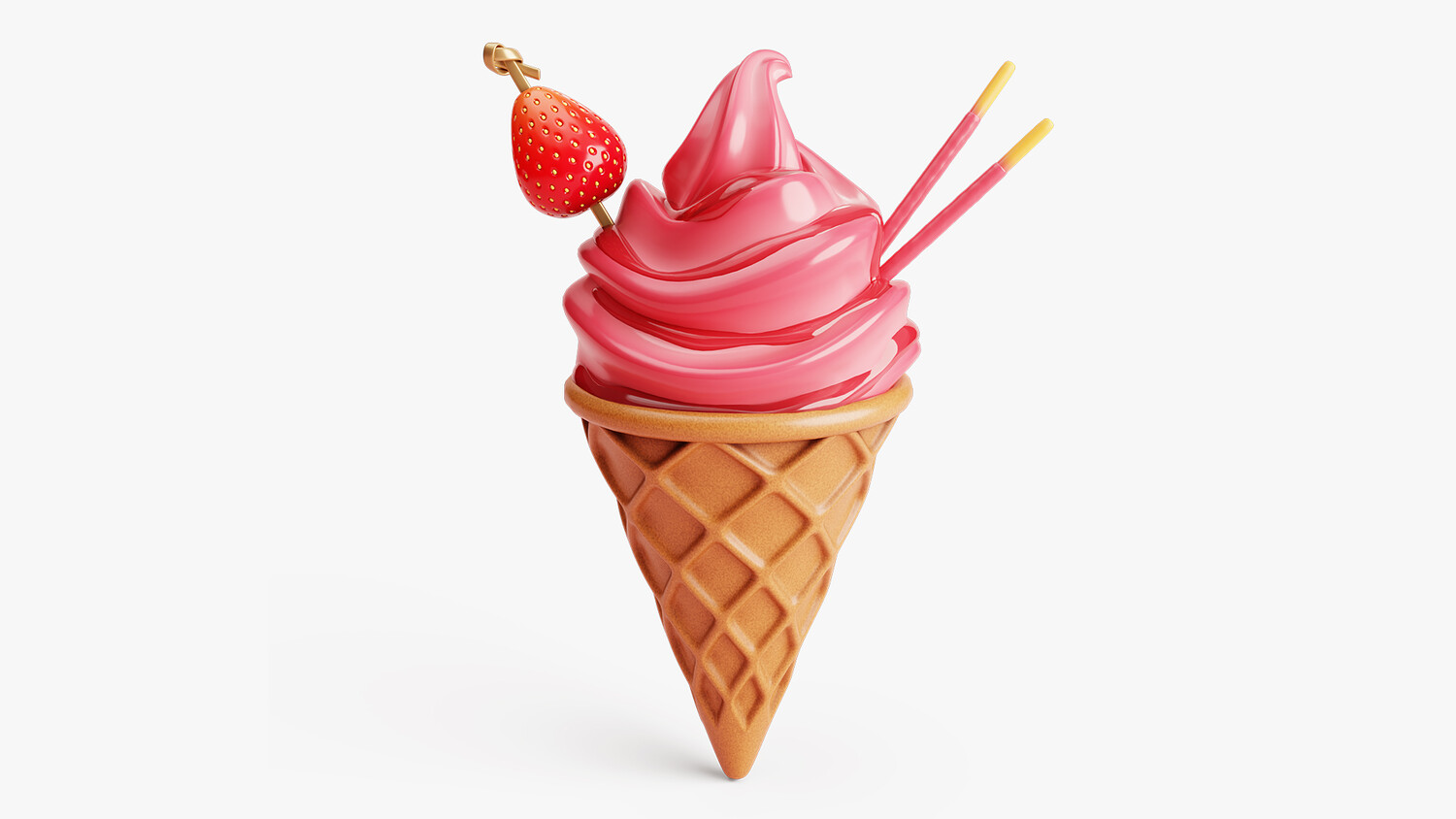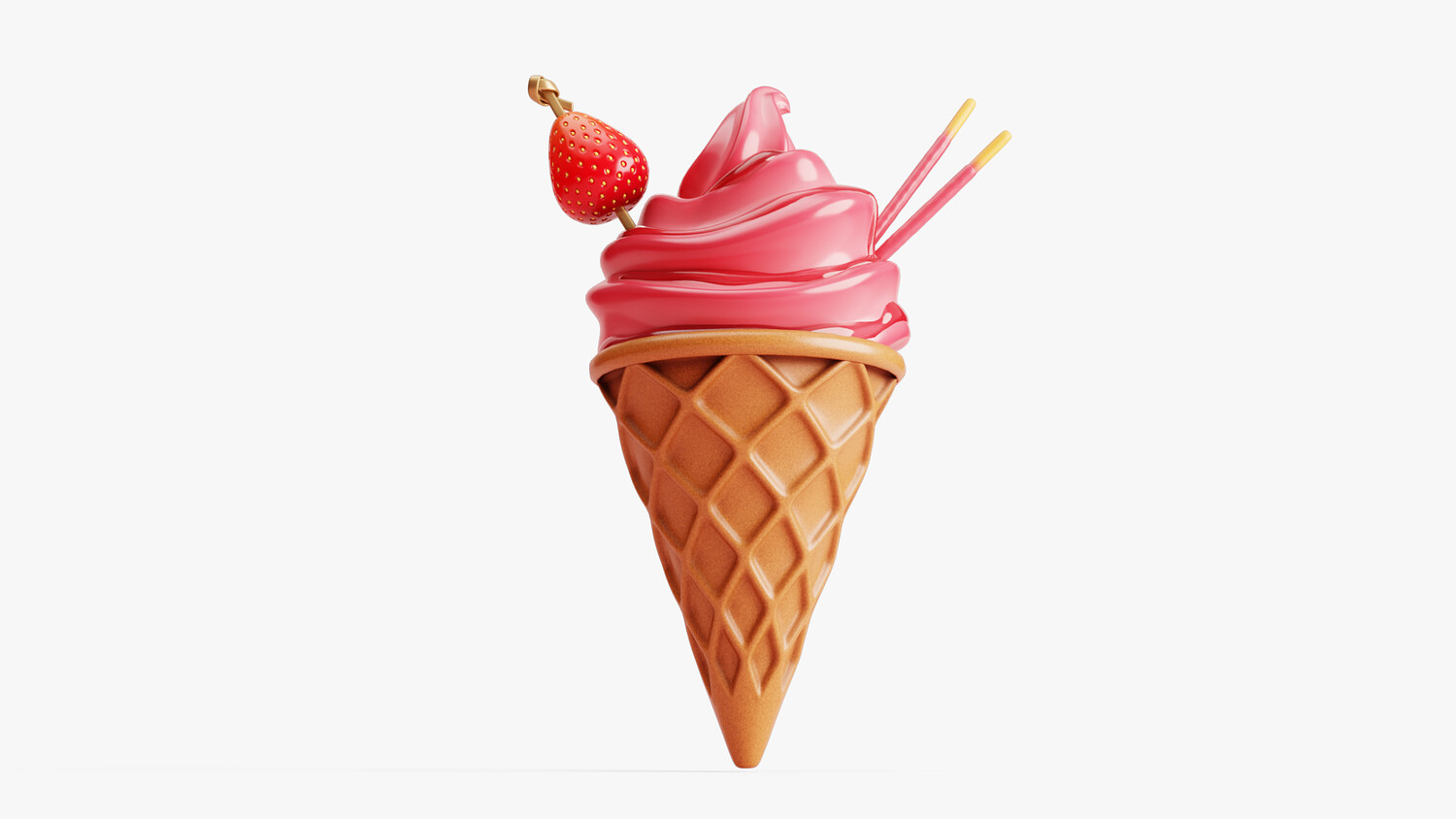 A cute and stylized 3D model of a strawberry ice cream cone with a crispy waffle base, drizzled with sweet syrup and topped with fresh strawberry and Pocky sticks. This vibrant and delicious dessert is perfect for food-themed projects, visualizations, and illustrations. Designed in a charming cartoon style, it adds a playful and appetizing touch to any scene.
