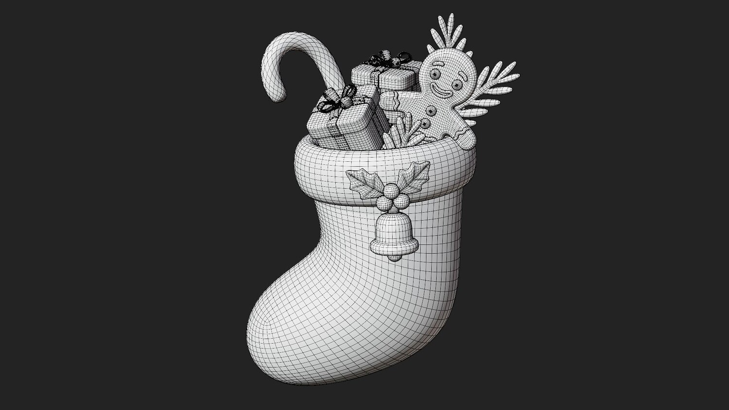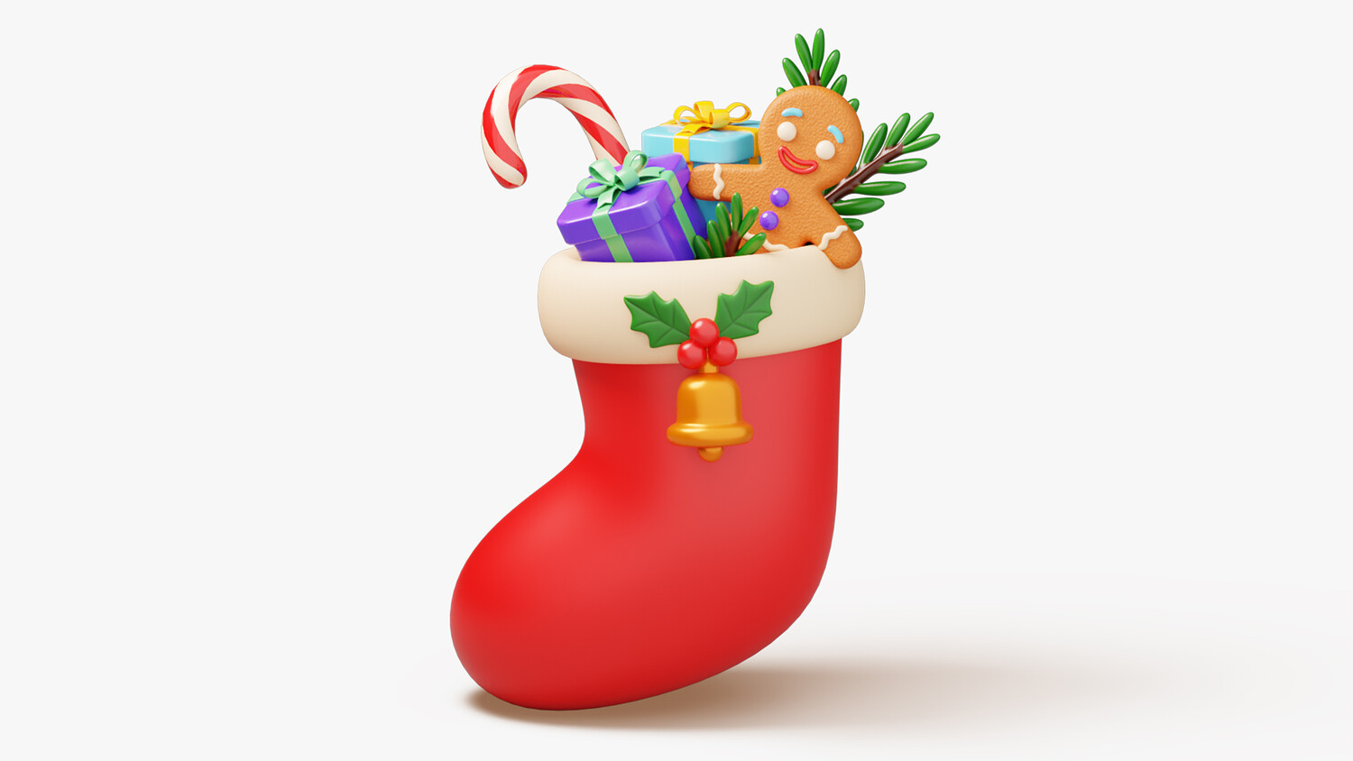 A bright, stylized Christmas stocking with a soft cream cuff and glossy red body, trimmed with a small holly applique and a gold bell. The pocket overflows with neatly wrapped gifts, a striped candy cane, pine sprigs, and a cheerful gingerbread figure peeking out from the top. Rounded forms, clean edges, and gentle highlights keep every detail readable, while the classic palette of red, green, white, and gold delivers instant festive appeal and a tidy silhouette for thumbnails and closeups.