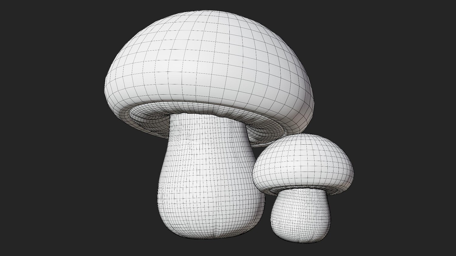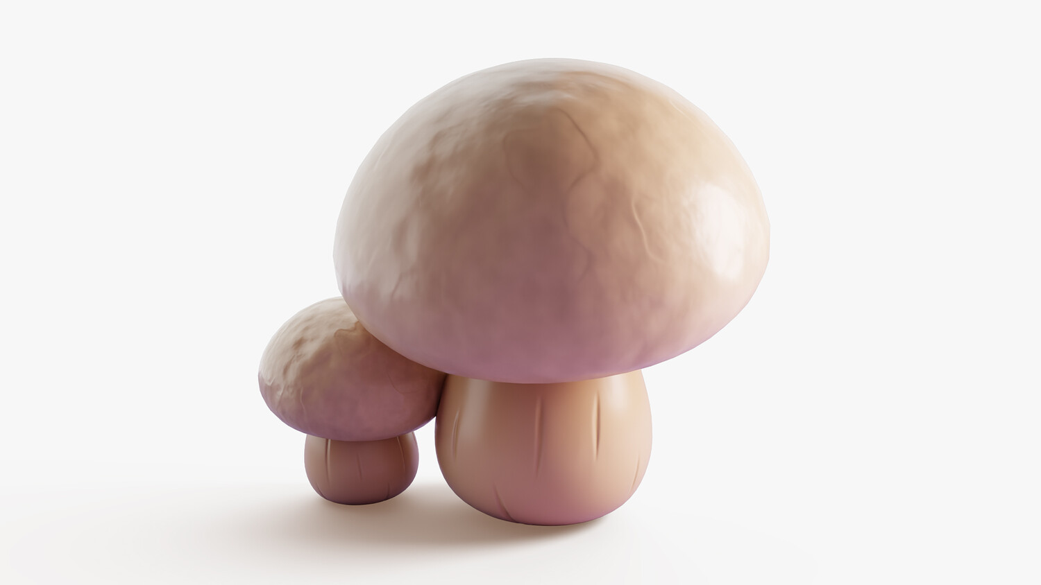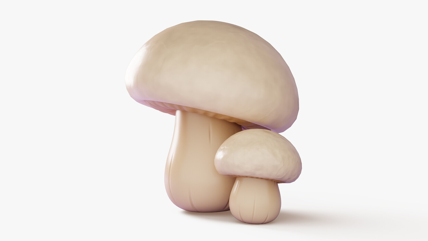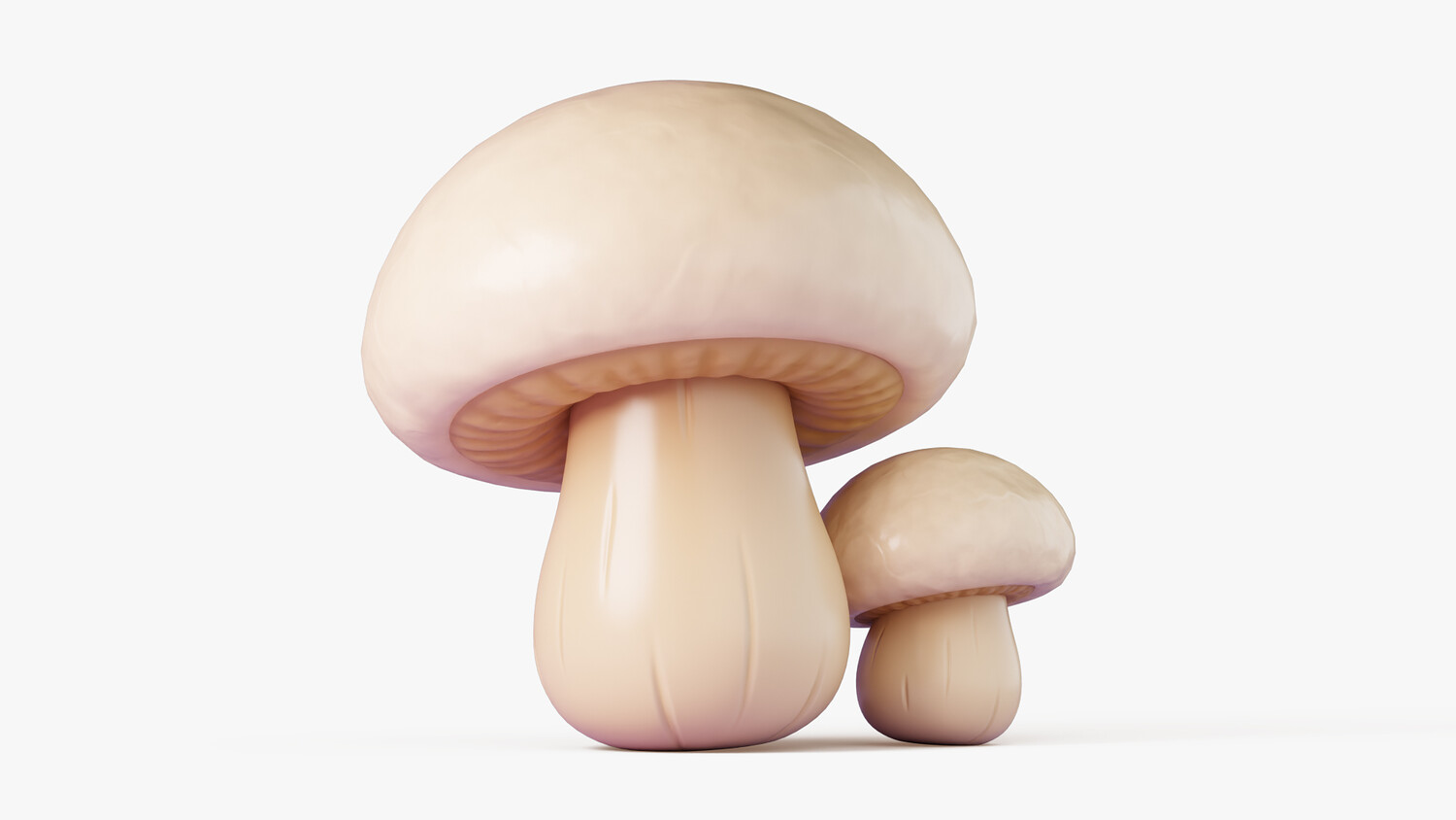 Cute cartoon 3D model set of two white champignon (button) mushrooms with a glossy, soft look and simplified shapes. The larger cap shows subtle gills and gentle color gradients; the smaller mushroom matches the style for easy scene dressing. Great as a prop for games, mobile projects, stylized environments, UI elements, educational visuals, and food or nature themed renders. Use it in forest biomes, kitchens, markets, farms, cozy cottages, fairy tales, and casual gameplay. Neutral creamy palette blends well with many color schemes and lighting setups. Suitable for close ups and background dressing, can be scaled and duplicated to build clusters, paths, or decorative sets. Ideal for concept art, product mockups, animations, and AR/VR scenes where you need clean, readable shapes. A friendly toon style helps it fit into kids content, casual apps, and fantasy worlds without looking too realistic.