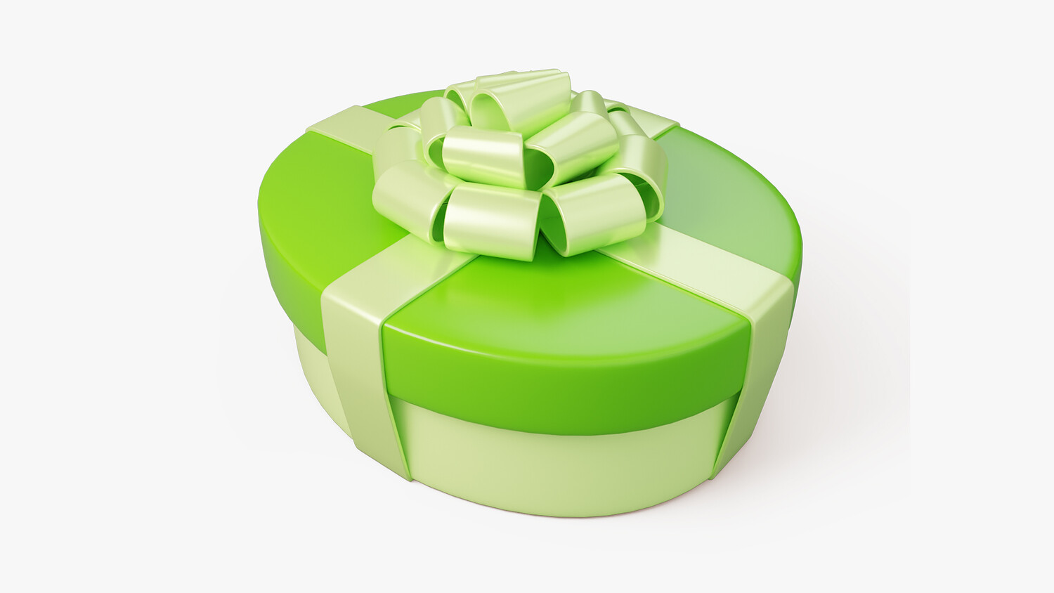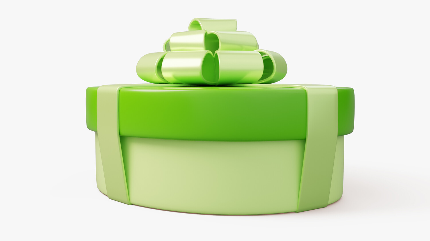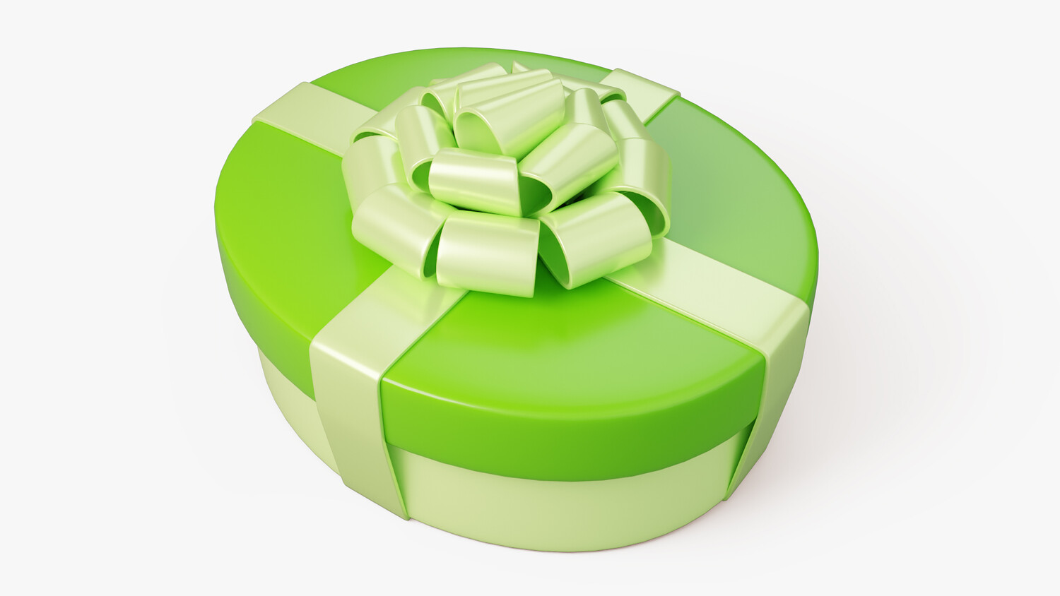 This is a stylized 3D oval gift box with a glossy green lid and soft pastel green base, wrapped in a smooth ribbon and topped with a decorative bow. Its elegant oval shape and bright cartoon look make it ideal for birthday scenes, celebration illustrations, mobile games, or festive assets.