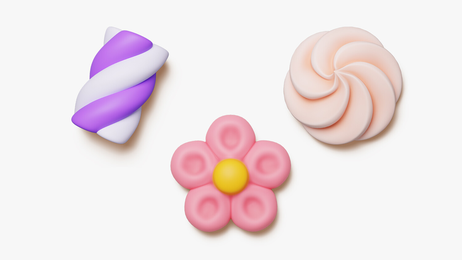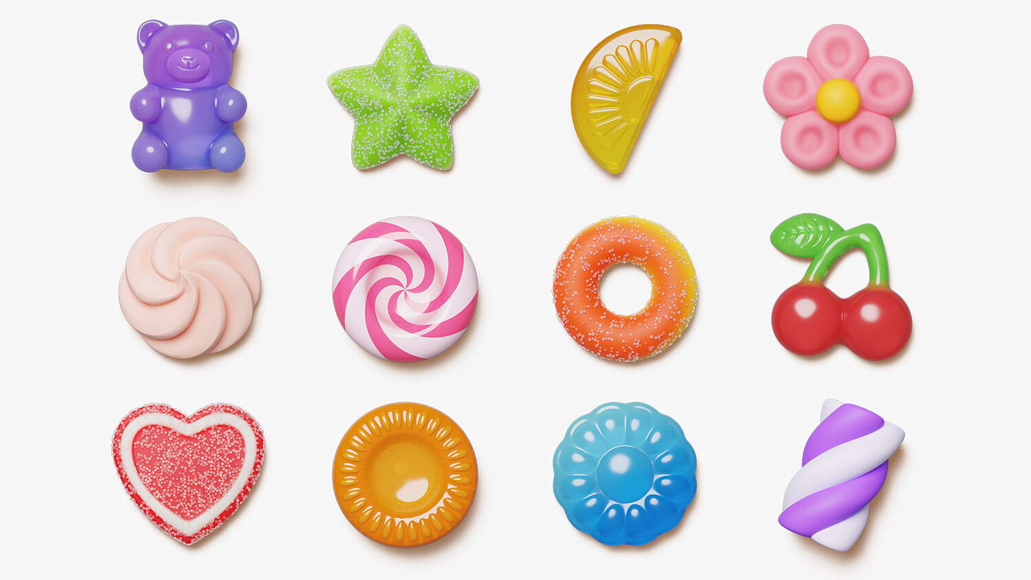 This 3D candy collection pack includes a wide variety of colorful and glossy sweets, created in a playful cartoon style with smooth edges and vibrant colors. The pack features 12 unique candy designs: gummy bears, sugar-coated stars and hearts, twisted marshmallows, fruity slices, jelly cherries, flower-shaped candies, caramel swirls, and round glossy treats. Each candy has its own distinct texture — from shiny jelly surfaces to sugar sprinkles — making the collection diverse and visually engaging.
