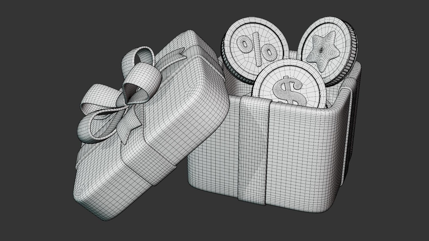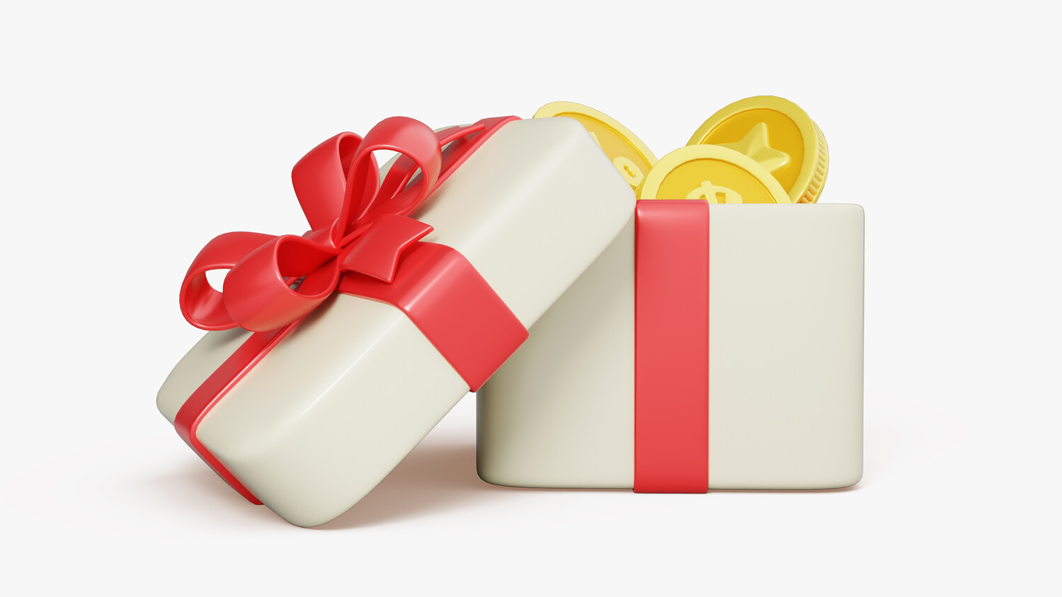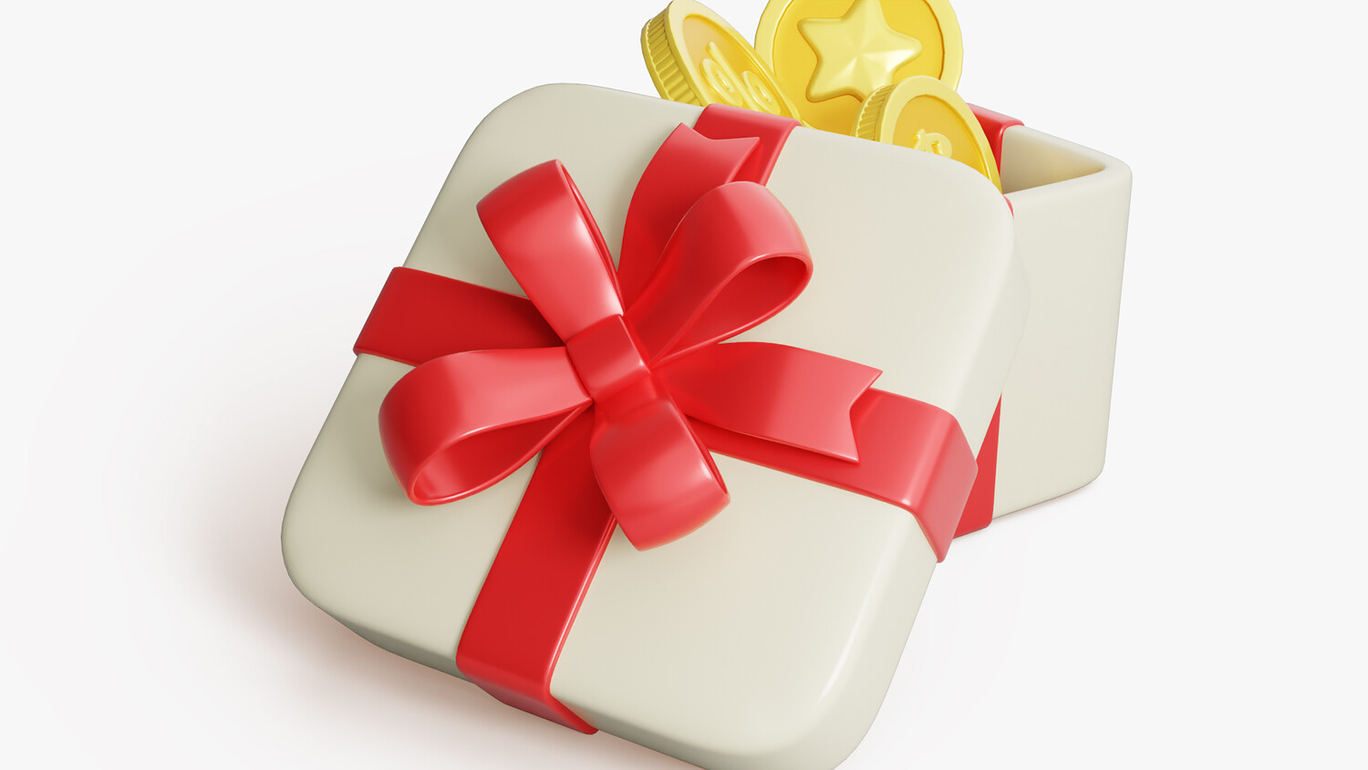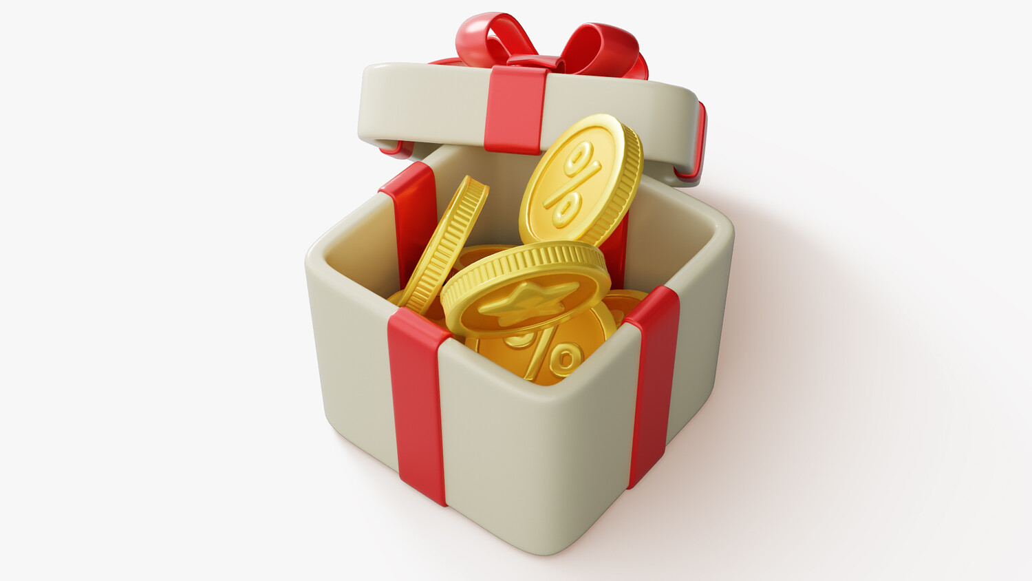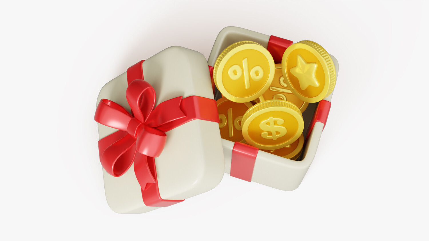 This 3D gift reward box model is designed in a bright and engaging cartoon style, making it a versatile element for promotional, advertising, and e-commerce projects. The box is decorated with a glossy red ribbon and an elegant bow, giving it a festive and celebratory appearance. Inside, it features golden coins with embossed symbols such as a percentage sign, a dollar sign, and a star, symbolizing discounts, bonuses, savings, and rewards. The clean shapes, smooth glossy surfaces, and vibrant colors make this model visually attractive and easy to integrate into both digital and print designs. Perfect for illustrating discount campaigns, loyalty programs, cashback offers, reward systems, or seasonal promotions. Its stylized and modern design ensures universal appeal across various platforms, including apps, websites, social media posts, and marketing materials.