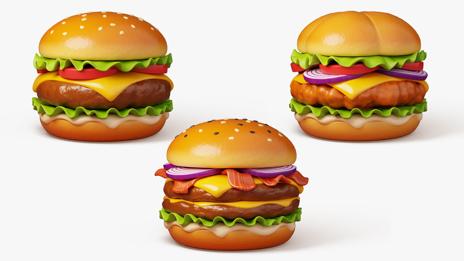 A coordinated trio of stylized burgers designed in one clean, appetizing look. The set includes a Classic Cheeseburger with a beef patty, melted cheddar, tomato, and frilly lettuce under a glossy sesame bun; a Crispy Chicken Burger with a golden breaded fillet, cheddar, onion rings, tomato, and fresh greens on a soft brioche; and a Bacon Cheeseburger stacked with two beef patties, cheddar, crisp bacon, and red onion. Subtle textures, rounded edges, and controlled highlights keep every ingredient readable at thumbnail size while staying rich in closeups.