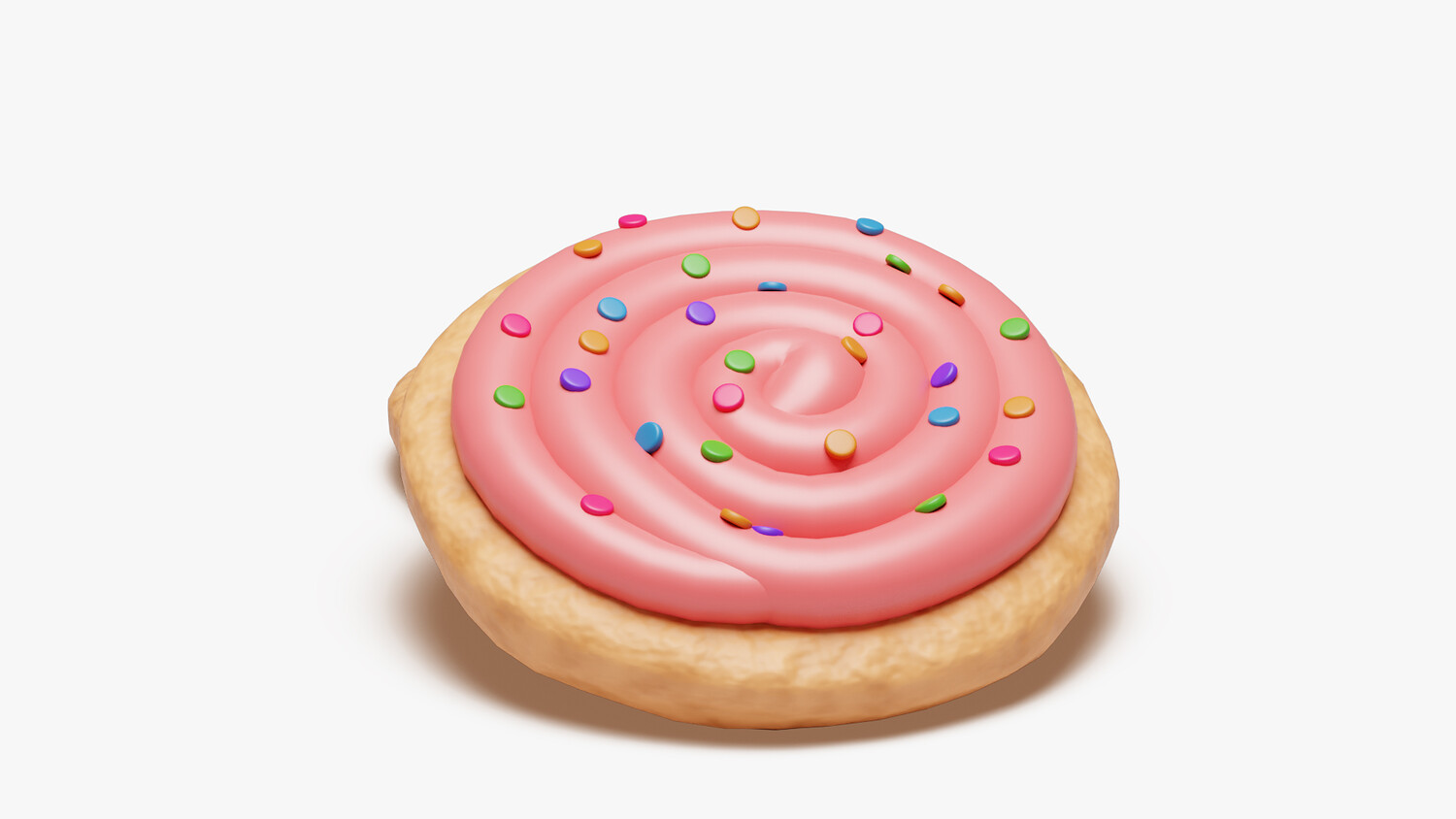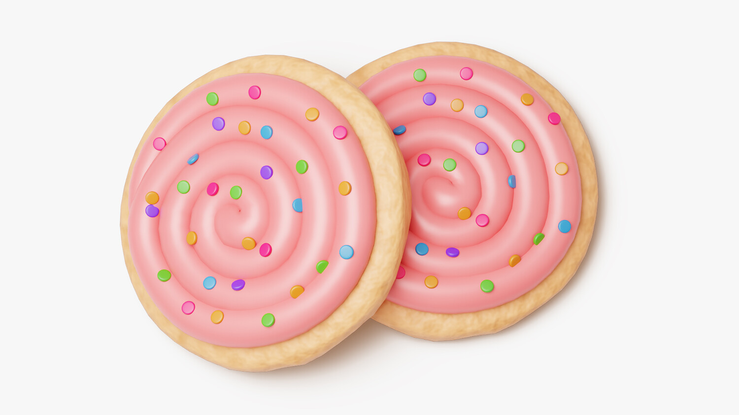 A stylized sugar cookie topped with a thick swirl of pink frosting. The piping forms a clean spiral that rises gently to a soft center, while tiny rainbow sprinkles add playful dots of color. Subtle crumb texture on the biscuit, rounded edges, and gentle highlights give the treat a fresh, soft-baked look that stays readable in closeups and thumbnails. The warm cookie base and bright icing create a friendly, modern palette.